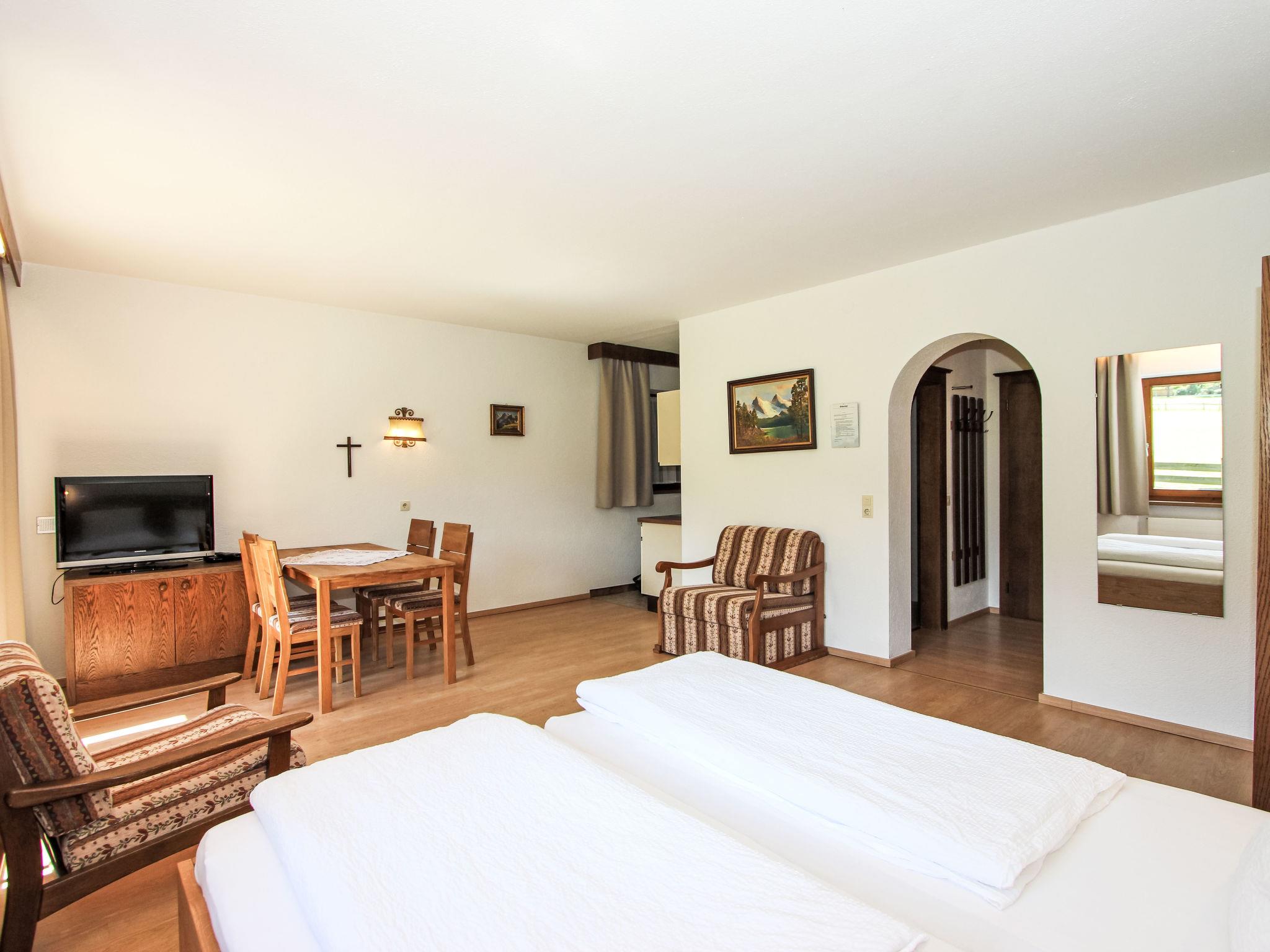 1-room apartment 40 m2, on the ground floor. Spacious and bright, rustic and cosy furnishings: entrance hall. Large living/sleeping room with 1 double bed, 1 pull-out bed, dining table and satellite TV (flat screen). Exit to the garden, to the terrace. Kitchenette (oven, 4 ceramic glass hob hotplates, electric coffee machine). Shower, sep. WC. Terrace. Terrace furniture. Beautiful view of the mountains and the countryside. Facilities: Internet (WiFi). Please note: non-smokers only. Maximum 1 pet/ dog allowed.