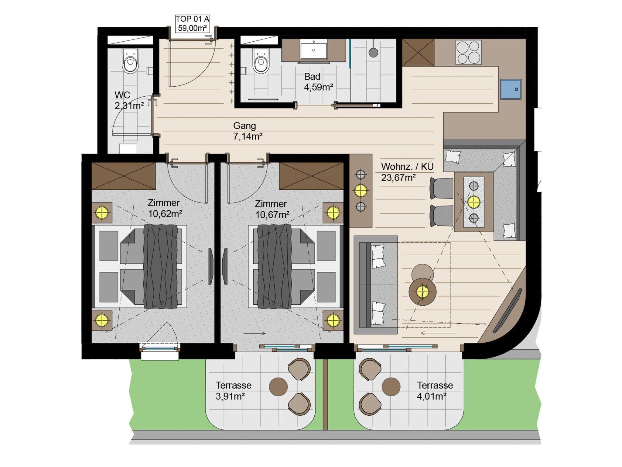 "Superior mit 2 Schlafzimmer 6P", 3-room apartment 59 m2. Modern and tasteful furnishings: living/dining room with dining nook and satellite TV (flat screen). 1 double bedroom. 1 room with 1 sofabed and 1 double bed. Kitchenette (oven, dishwasher, 4 ceramic glass hob hotplates, toaster, kettle, microwave, electric coffee machine). Shower/WC. Terrace 8 m2. Terrace furniture. Beautiful view of the countryside. Facilities: hair dryer. Internet (WiFi, free). Please note: non-smokers only. Maximum 1 pet/ dog allowed. The property is one of a type of property or apartment.