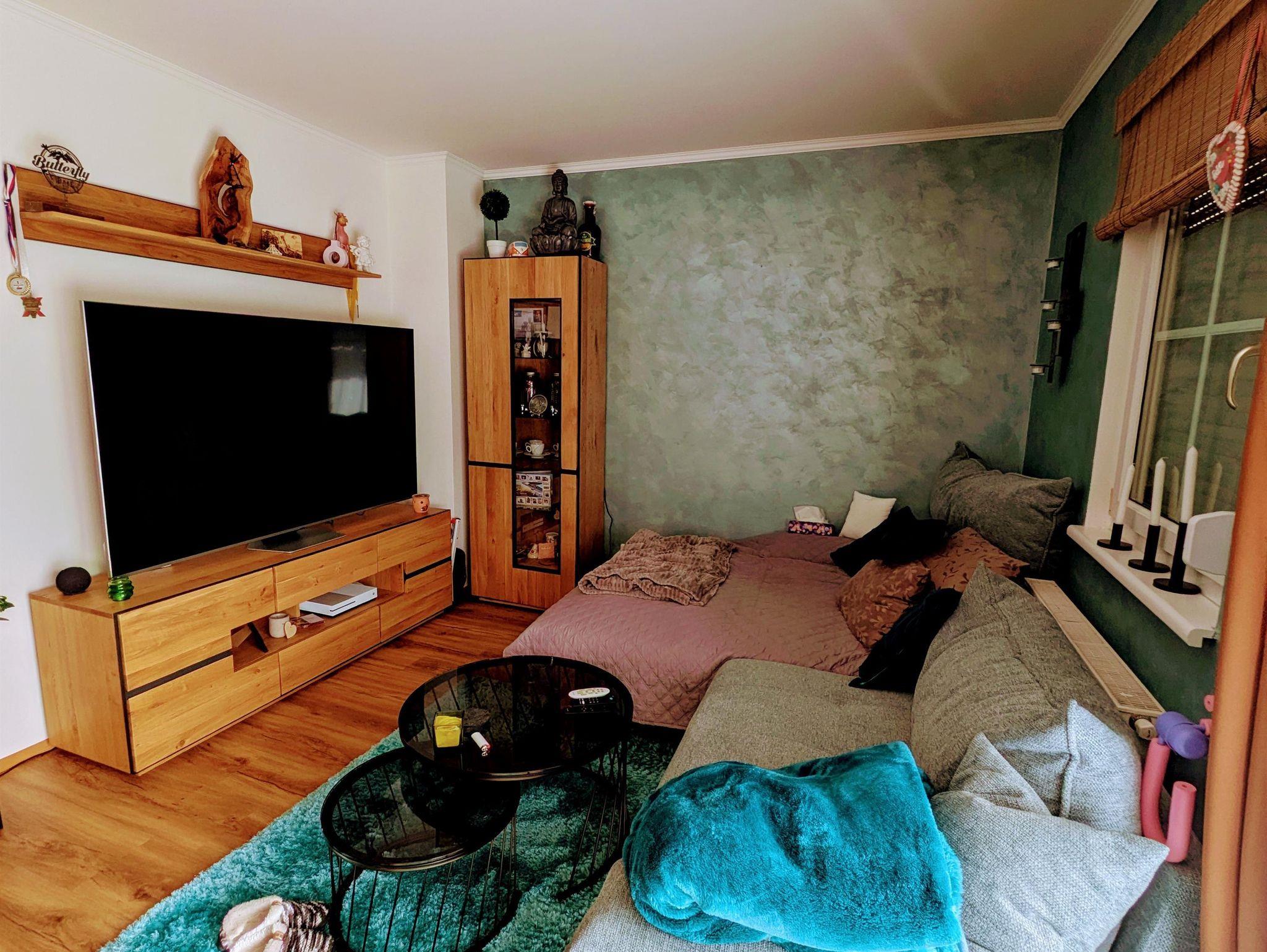 Im Wohnzimmer befindet sich ein großes Sofa (nicht ausziehbar aber mit Liegefläche)