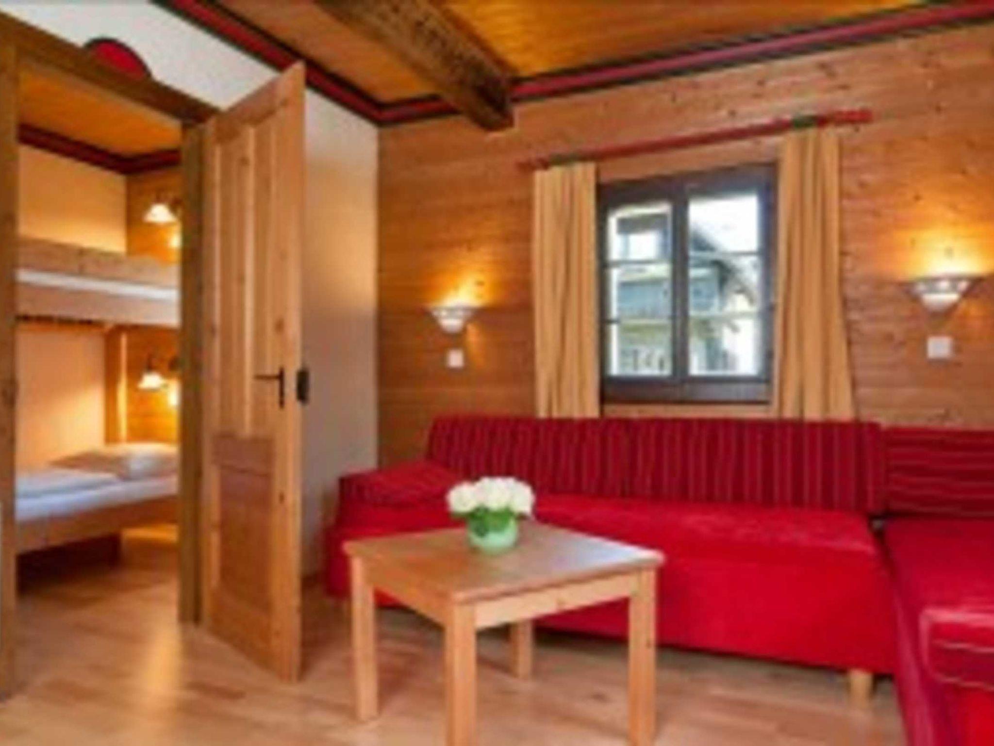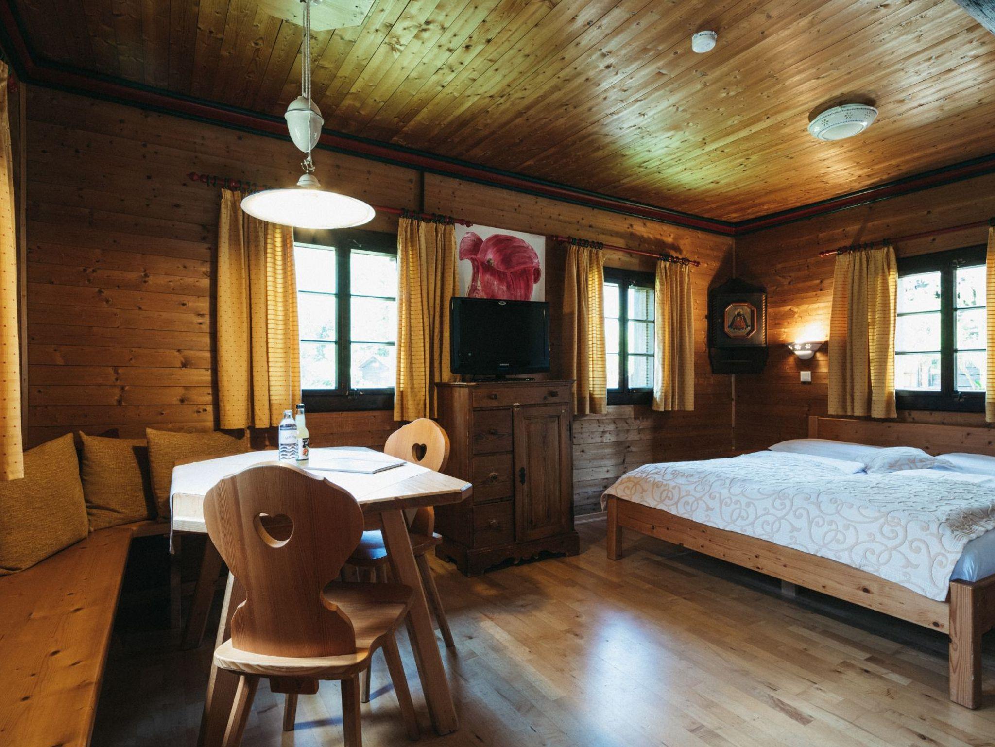 Im Parterre mit einer Wohnfläche von ca. 35 m², augestattet mit Küchenzeile, Wohnraum mit Sitzgruppe (2 Sitz-/Schlafcouches), Kachelofen und Essecke, kleines Schlafzimmer mit Etagenbett, Dusche, WC.