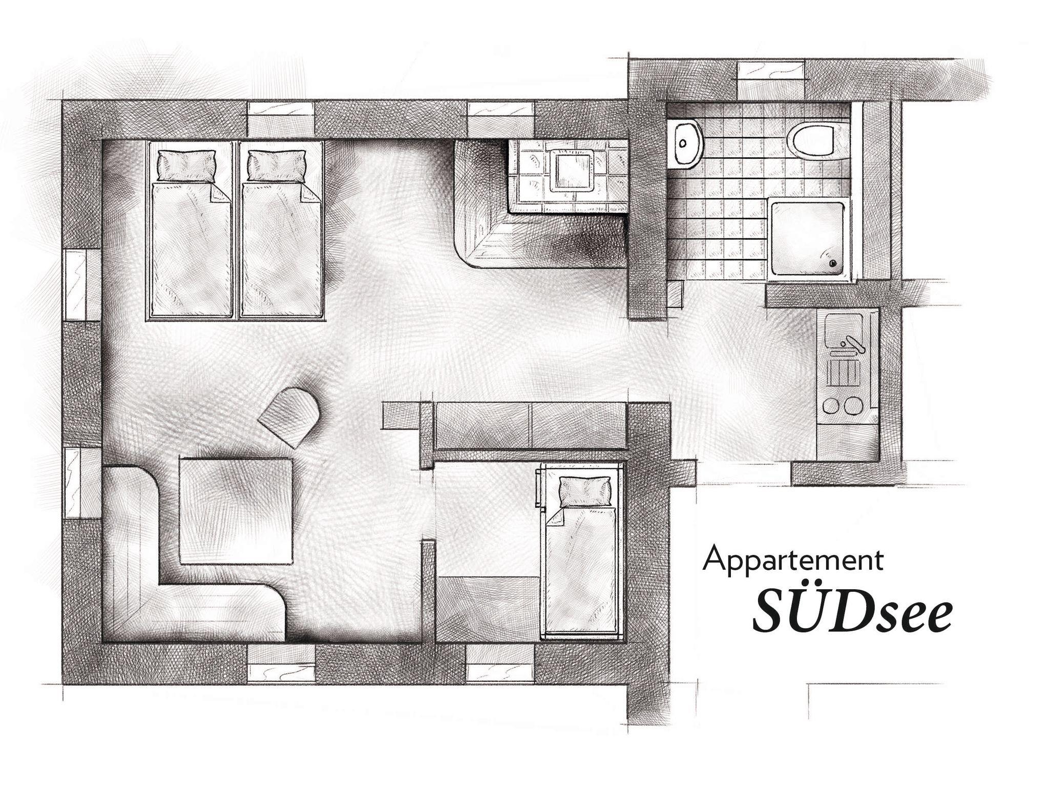 Bis zu 4 Personen finden in einem Appartement der SÜDsee genug Rückzugsmöglichkeiten für einen entspannten Urlaub. (EG, 1 Wohn-Schlafraum mit Doppelbett oder Schlafcouches, 1 Schlafraum mit Stockbetten)