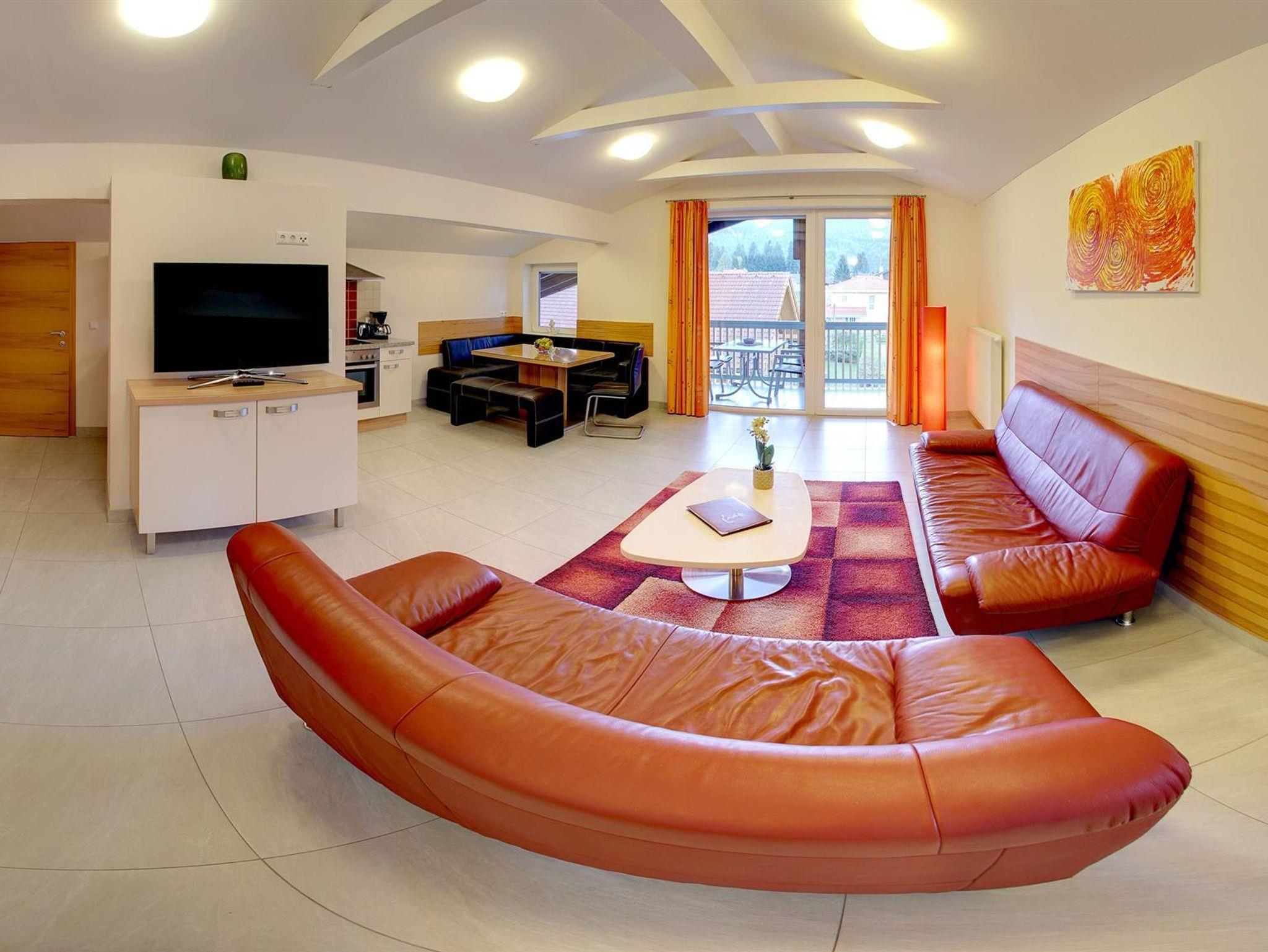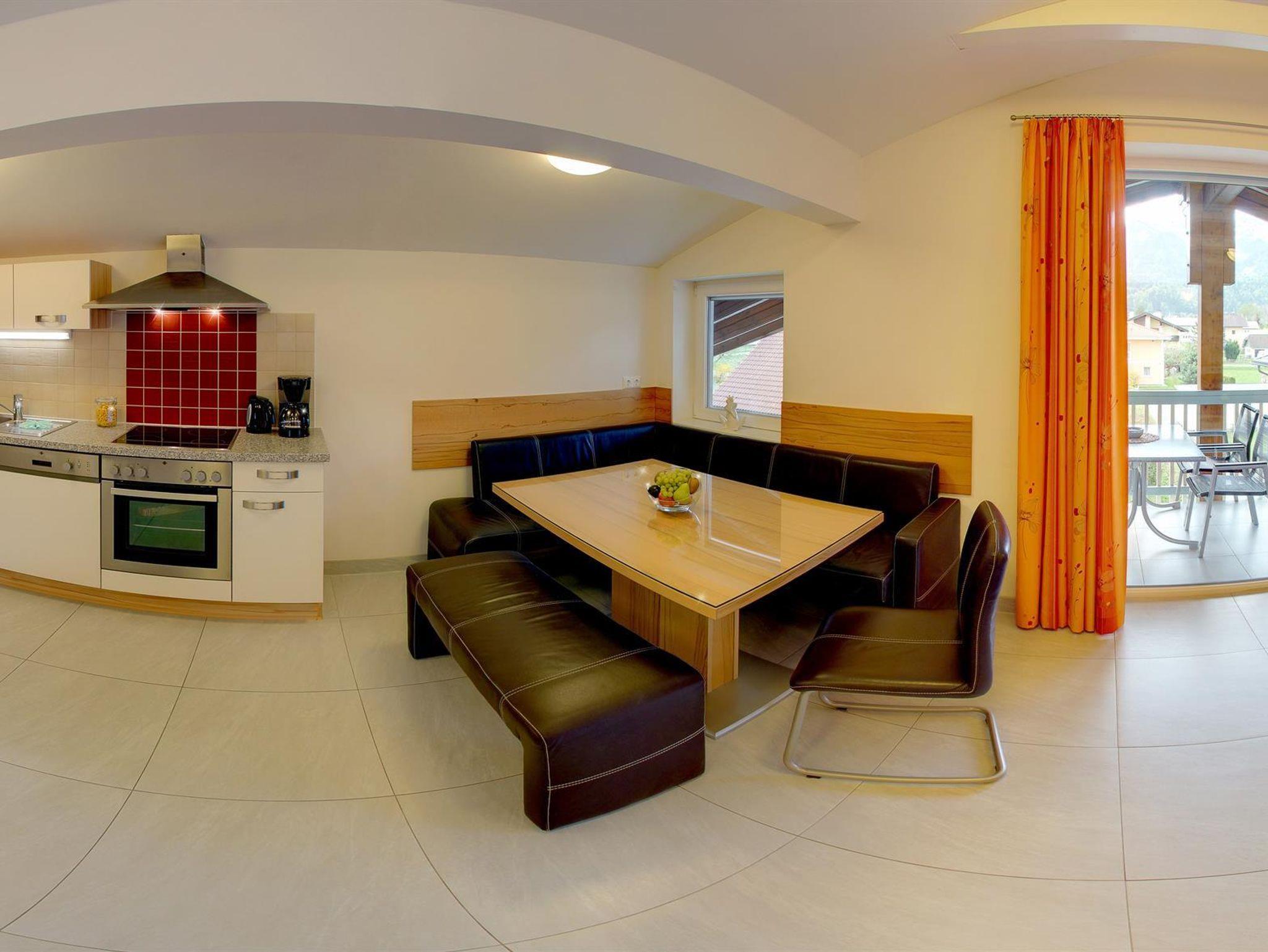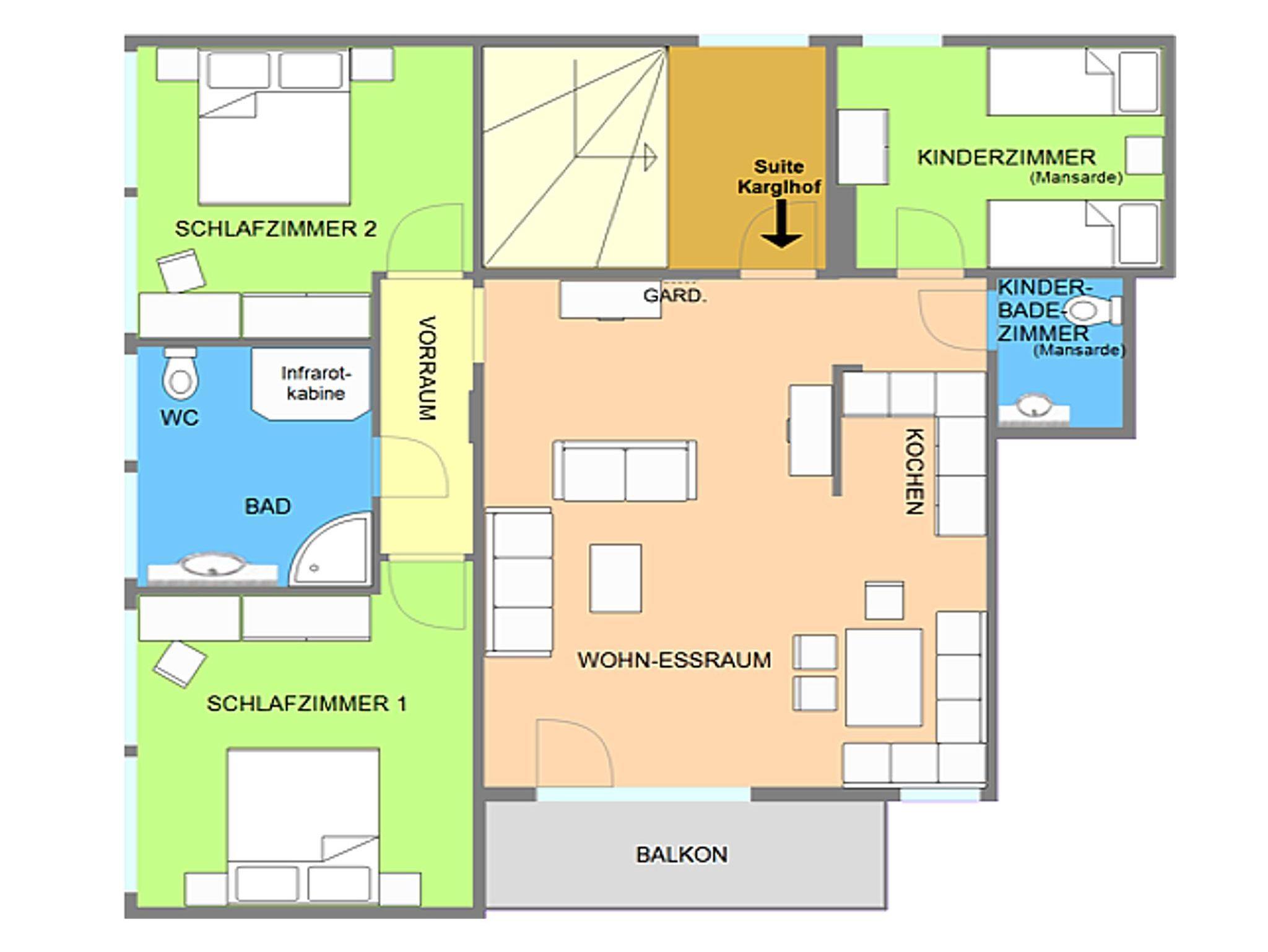 Diese komplett neue Wohnung (neu ab dem Urlaubsjahr 2011 - errichtet in unserem Ferienhaus Villa Karglhof) besteht aus einem Vorraum mit Garderobe, großem Wohn/Essraum, Küche, 2 separaten Schlafzimmern, 1 Kinderzimmer (Mansarde), Badezimmer (mit Infrarotkabine, Dusche und WC), Kinderbadezimmer (Mansarde: mit Waschgelegenheit und WC) und einem herrlichen Südbalkon.
