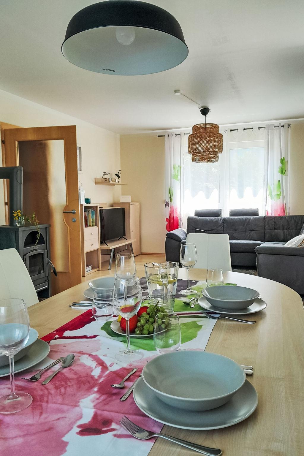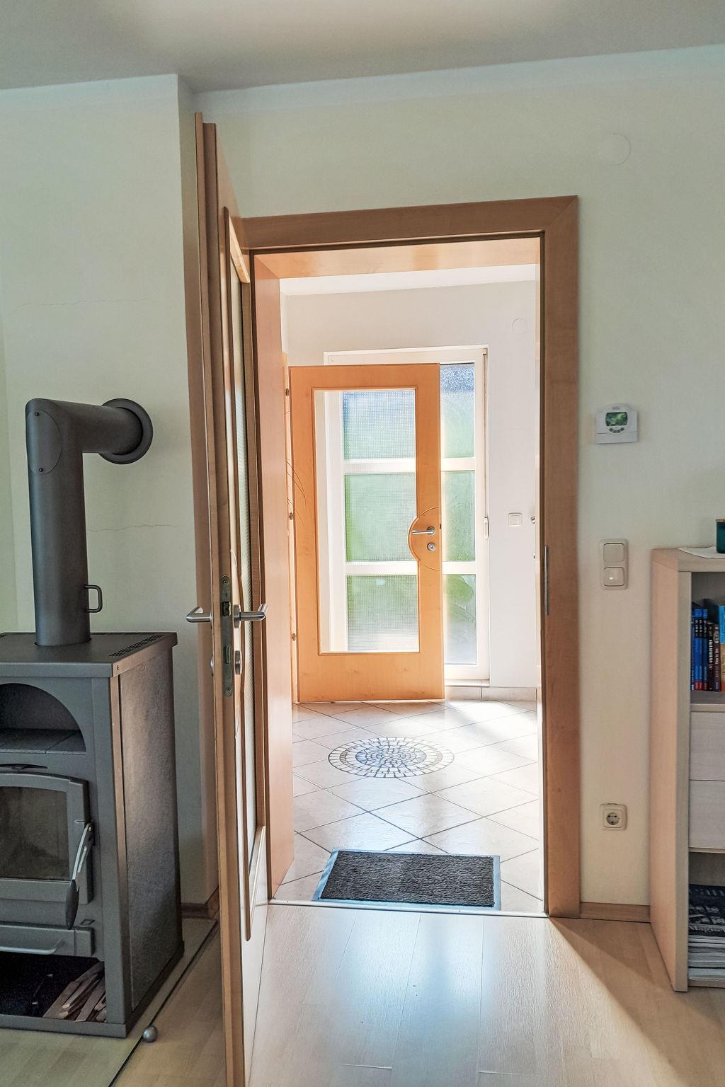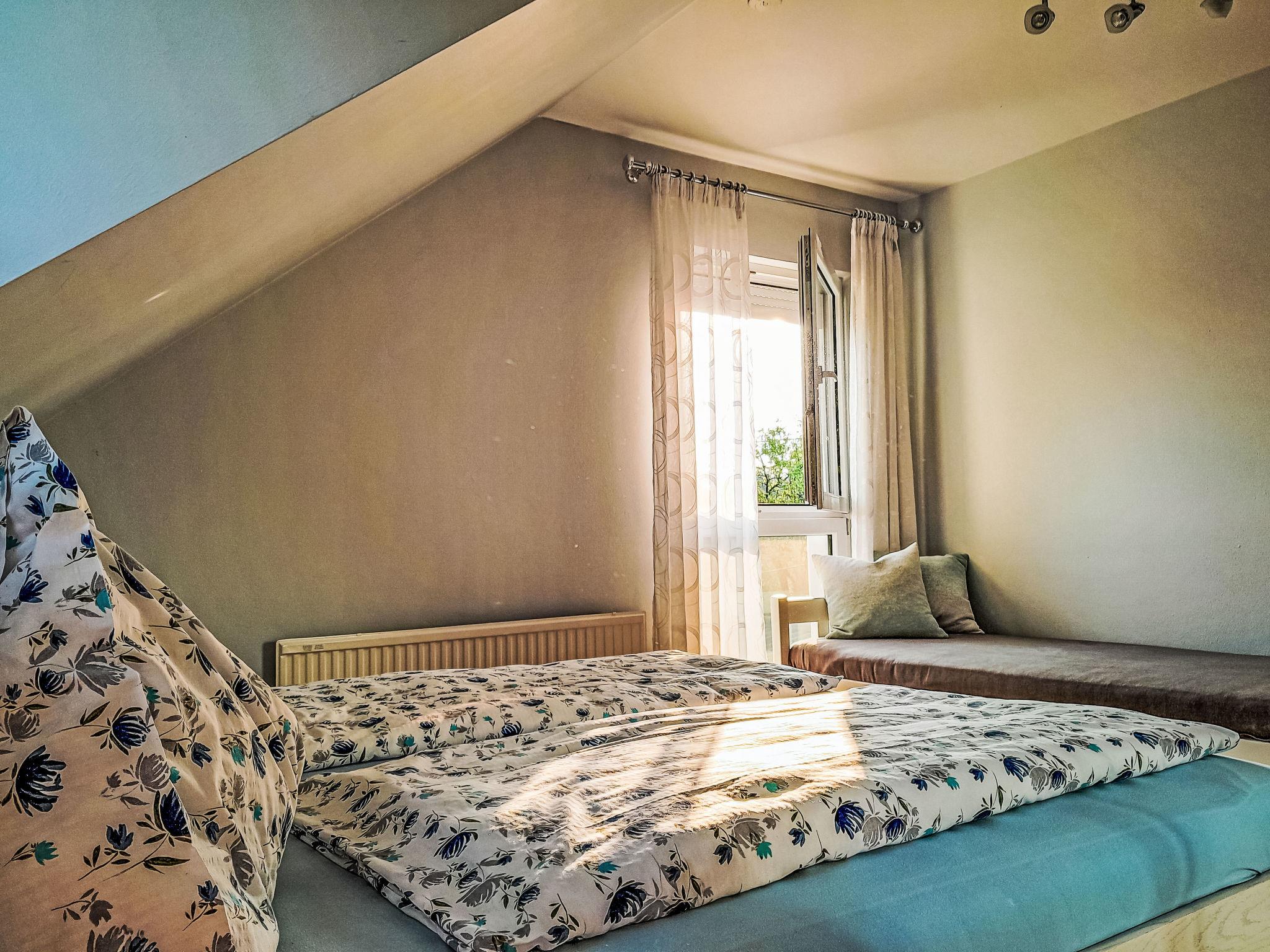 3-room house 86 m2 on 2 levels. Object suitable for 6 adults + 2 children. Bright, modern and cosy furnishings: entrance hall. Living/dining room with 1 double sofabed, Scandinavian wood stove, dining table and satellite TV (flat screen), electric shutters. Exit to the terrace. Open kitchen (oven, dishwasher, 4 ceramic glass hob hotplates, microwave, freezer, electric coffee machine). Shower/WC. Top floor: with sloping ceilings, 2 rooms, each room with 1 bed and 1 double bed. Bathroom, sep. WC. Terrace furniture, deck chairs (4), covered balcony, box-room. Facilities: washing machine, children's high chair, baby cot for up to 2 year olds, hair dryer. Internet (WiFi, free). Please note: suitable for families. Non-smoking house. Smoke alarm. Nespresso machine available. Small bath house in the garden that is due to be moved. Shared use of the private bathing area (1200 sqm), 25 metres of lakeshore is included. 1 paddleboard is available for free use.