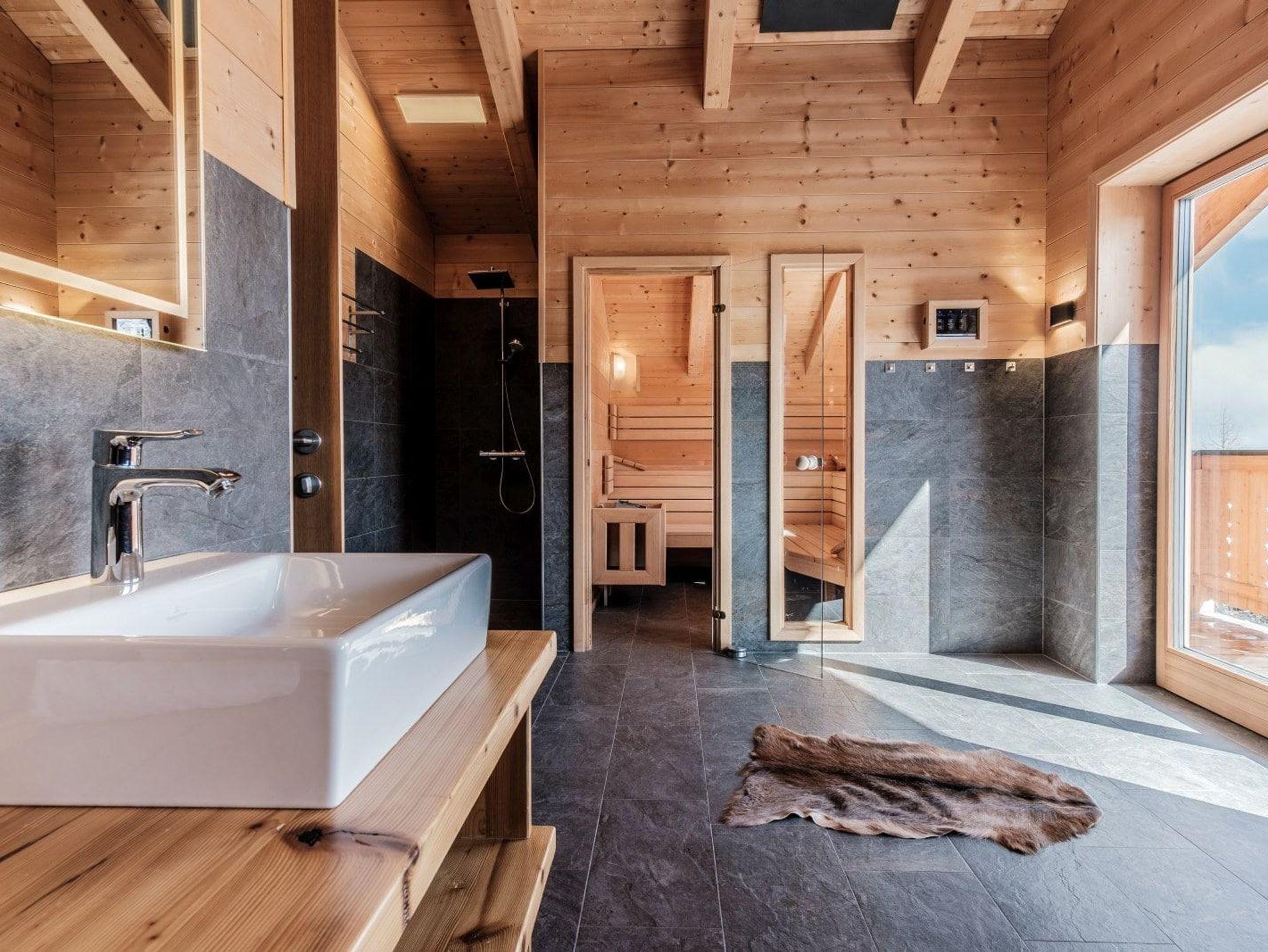 Die Chalets verfügen über 2 Bäder, jeweils mit offener Regendusche und hochwertiger Villeroy & Boch Ausstattung und ein separates Gäste-WC. Sie haben die Wahl: machen Sie erst einen Saunagang und kühlen sich dann im Schnee ab, oder möchten Sie doch zuerst den Hotpot auf der Terrasse einheizen und bei einem Glas Wein entspannen, während die Kinder in der Whirlpoolwanne ein Schaumbad nehmen? Oder möchten Sie lieber draußen den Außenkamin anheizen oder im Haus vor dem Kaminofen ein Buch lesen? Sie haben die Wahl und brauchen sich um nichts kümmern: Bettwäsche-, Handtücher und Endreinigung erledigen wir für Sie.