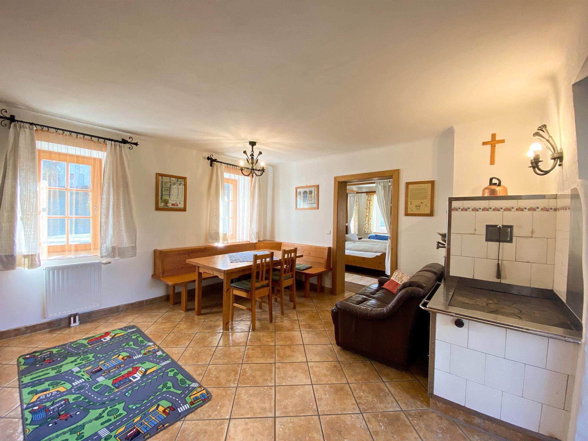 1 Wohnraum mit urigem Kuchlherd, Sitzecke, Kochnische (2 Kochplatten, Backrohr, Mikro, Kühlschrank, Geschirrspüler, Kaffeemaschine, Mixer, Geschirr, Gläser), Sat-TV, ADSL-Internetzugang, Hifi-Anlage, Garderobe, 1 Schlafraum mit Himmelbett und Schrank, 1 Kinderzimmer mit 3 Einzelbetten (1x Stockbett), 1 Dusche/WC mit Fön und Radio.
