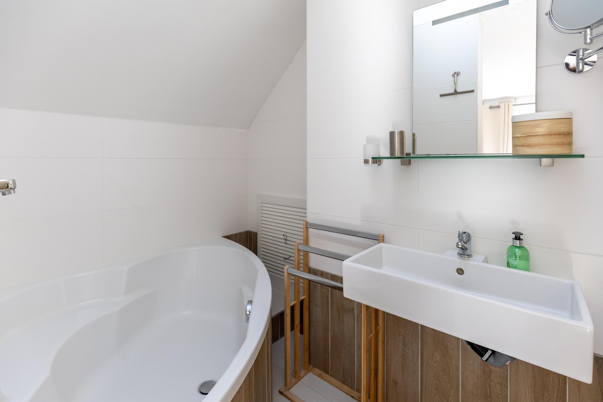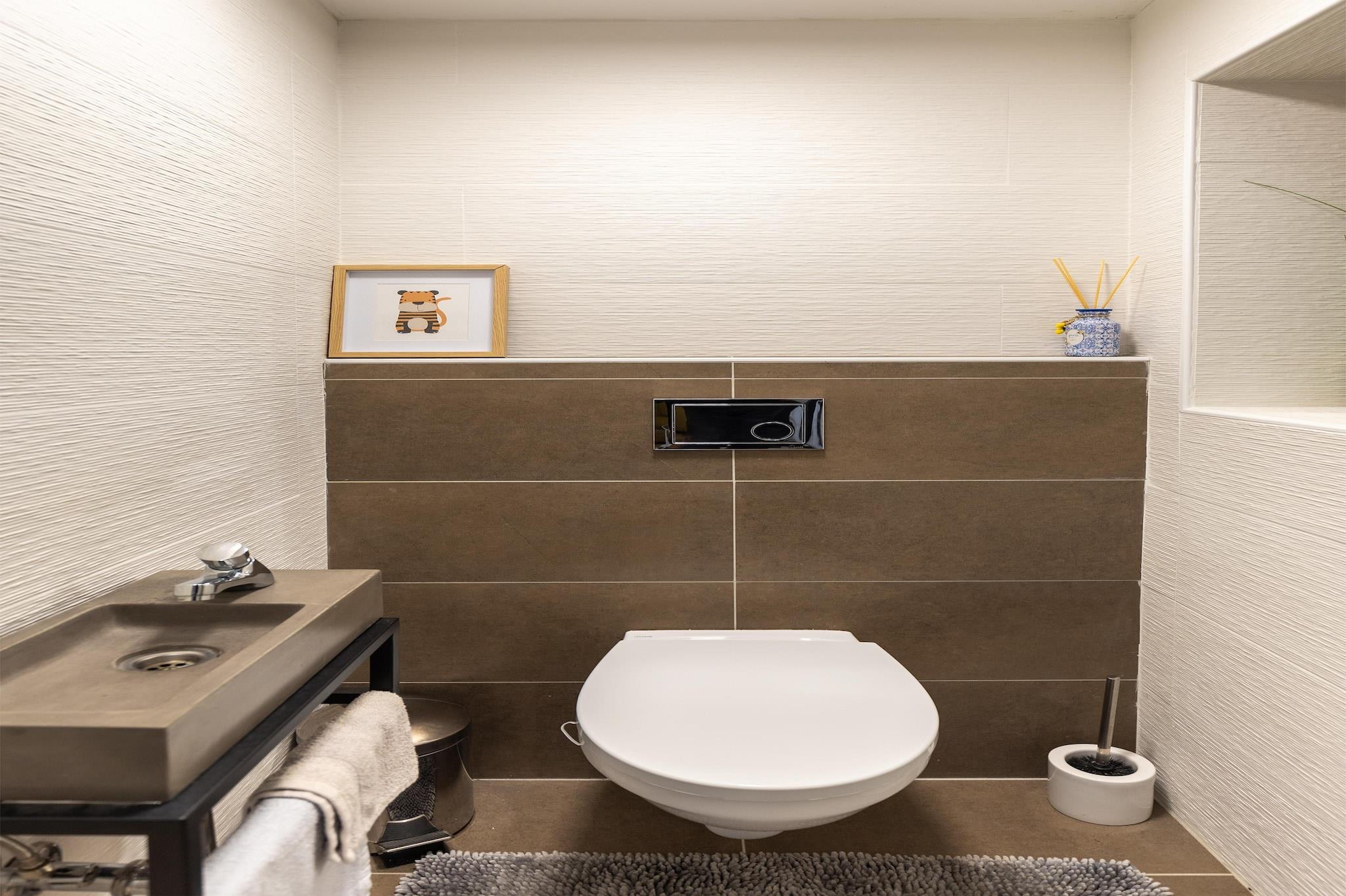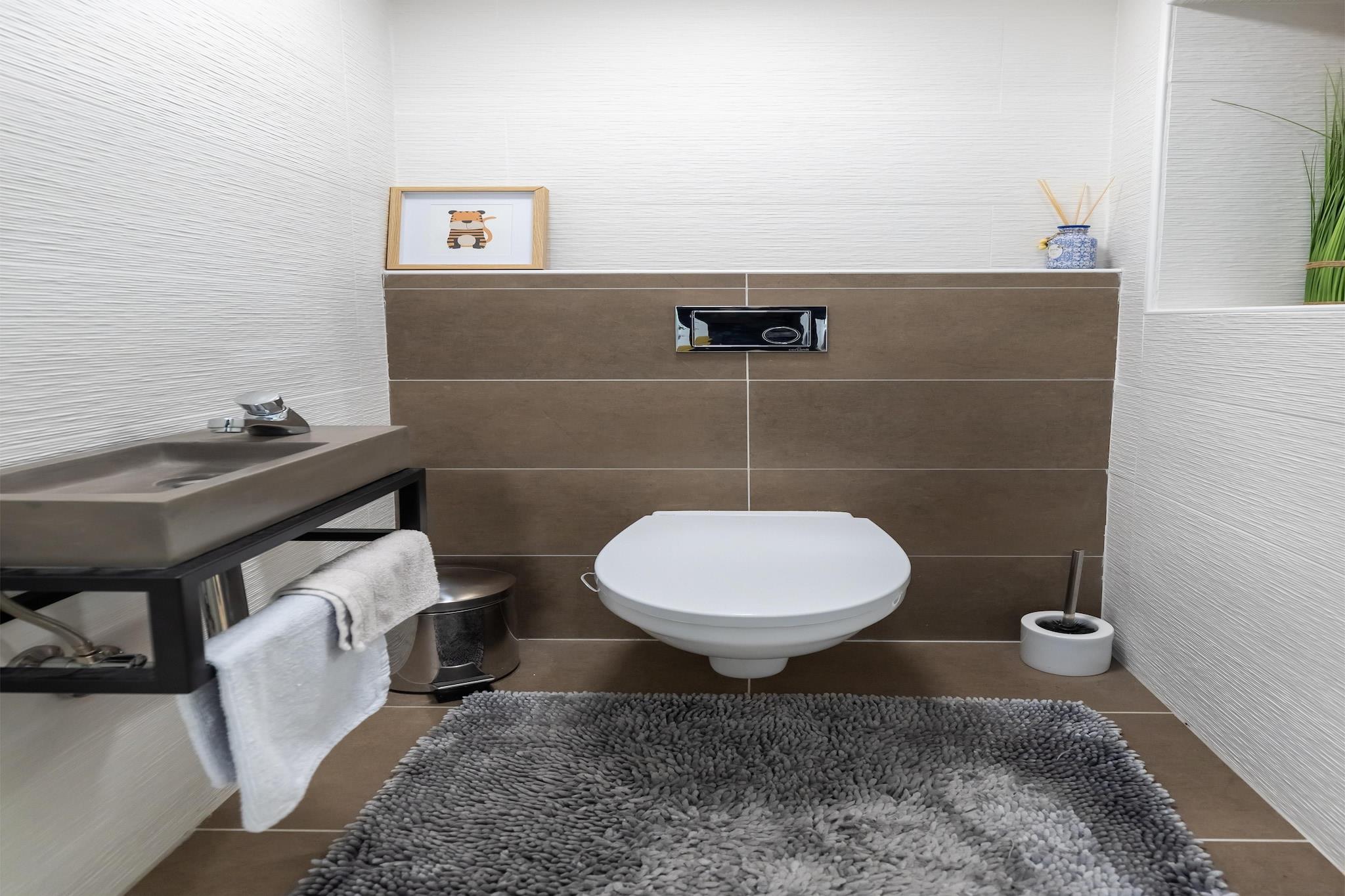 På 1. etage: (Stue(dobbeltsovesofa, Fjernsyn, sofahjørne), Køkken(spisebord, elkedel, kaffemaskine, mikrobølgeovn, opvaskemaskine , køle-fryseskab), Soveværelse med badeværelse(dobbeltseng, bruser), Soveværelse med badeværelse(dobbeltseng, badekar), toilet(toilet), toilet(toilet), balkon) toilet, terrasse, have, grill, parkering