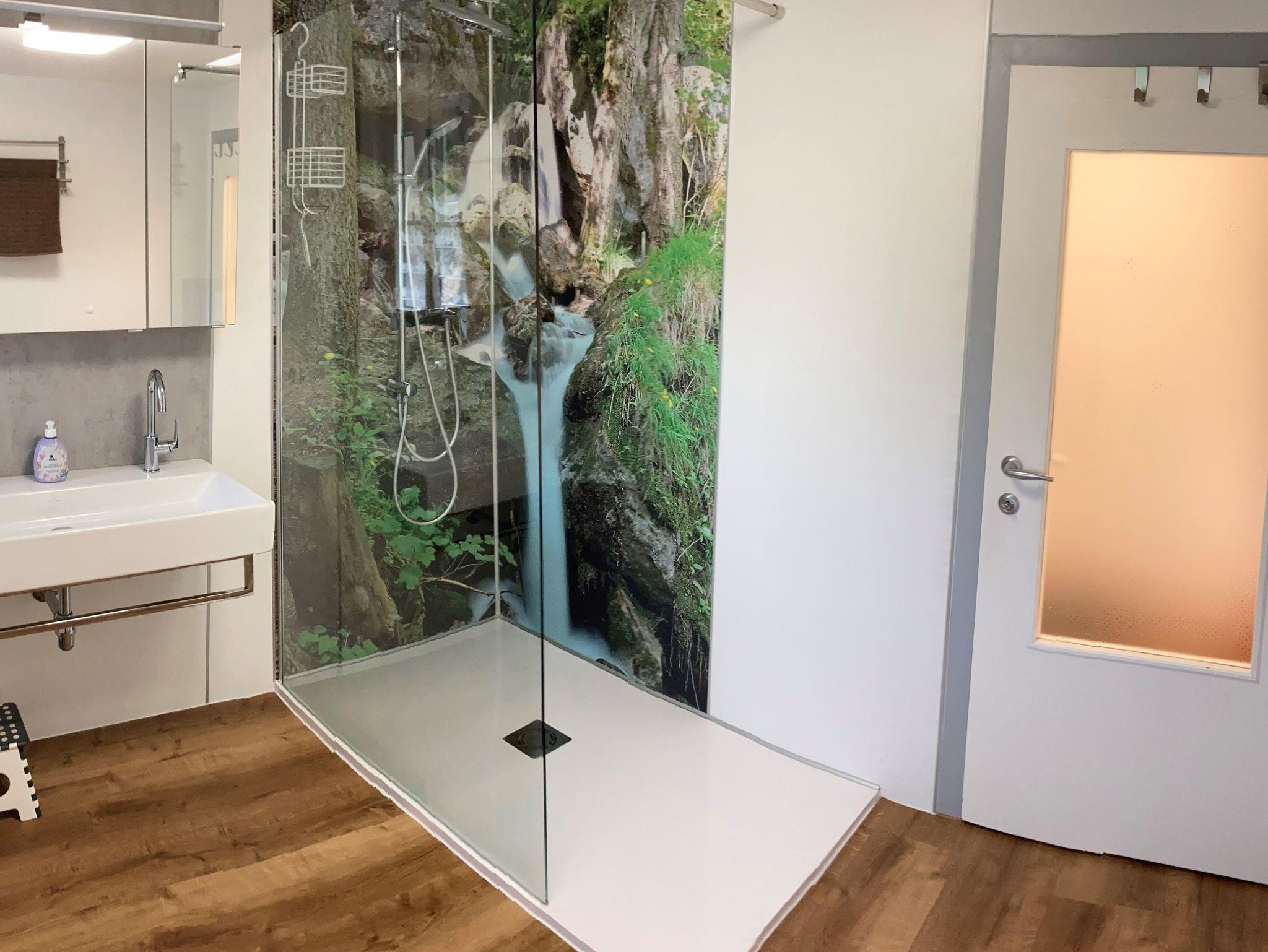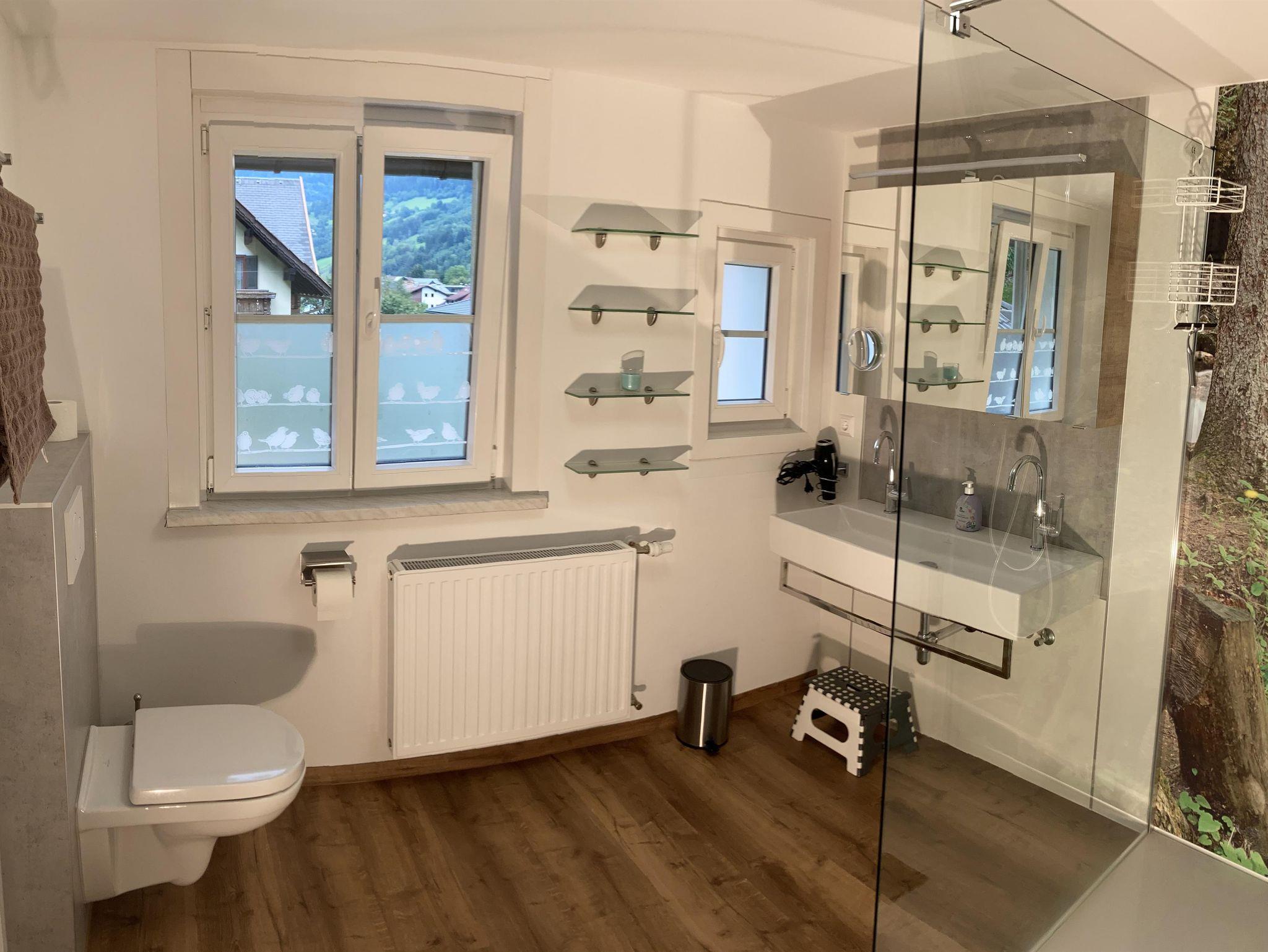 1 Badezimmer mit Badewanne, Dusche, WC, Waschbecken, Fön, Kosmetikspiegel