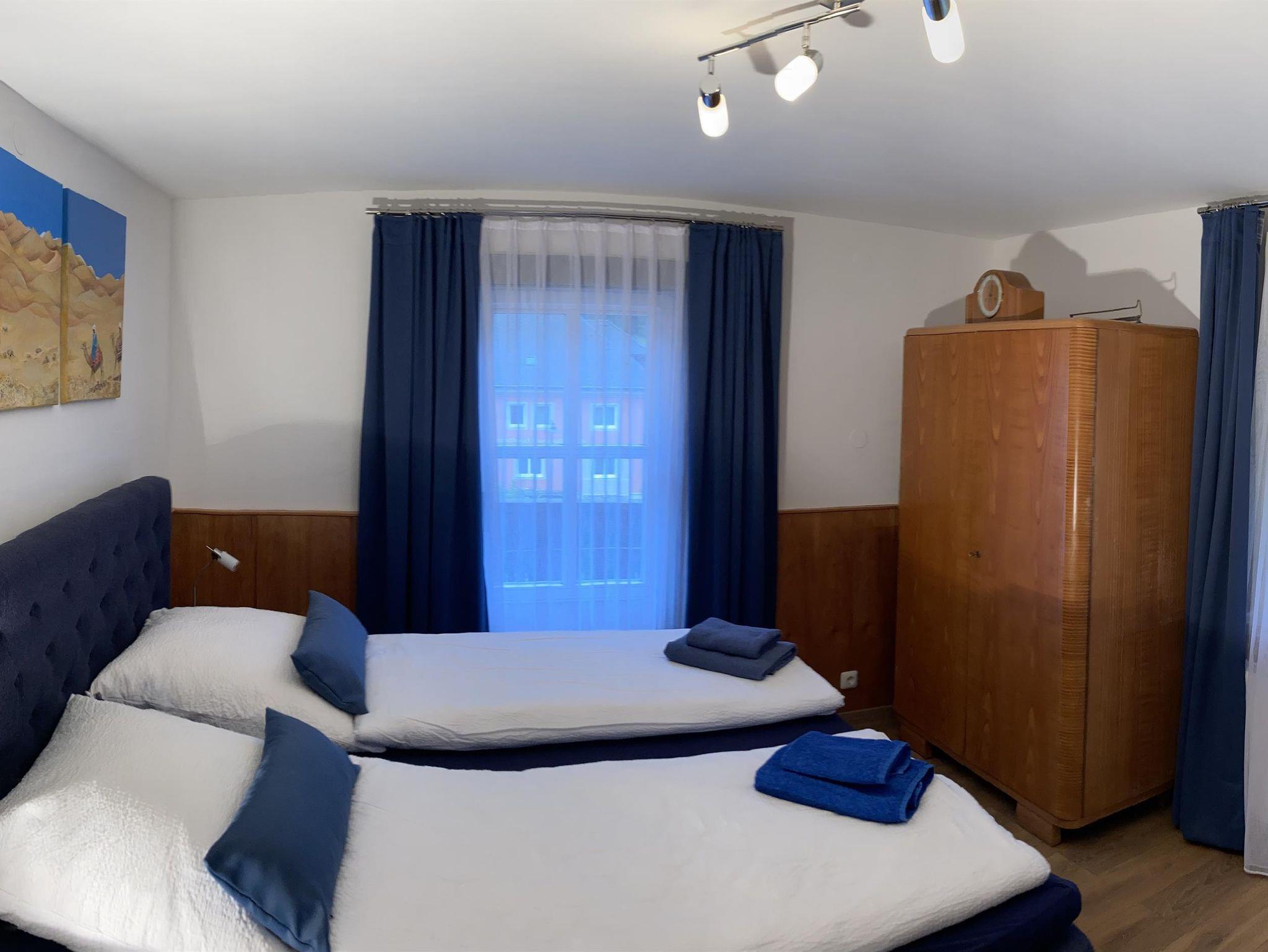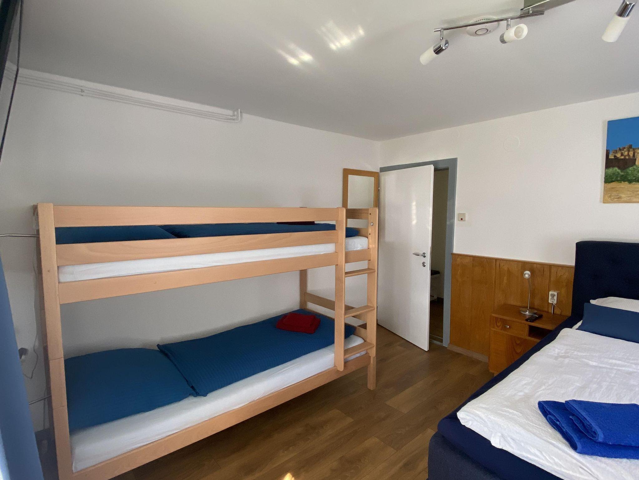 1 Schlafzimmer (4 Personen) mit Doppelbett und Etagenbett, Spiegel und Flat-TV
