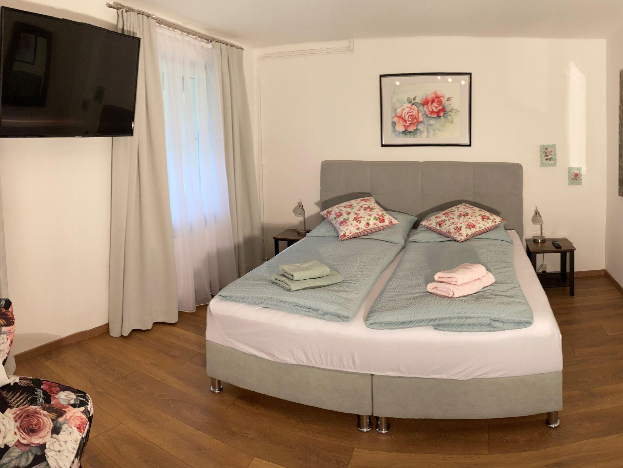 1 Schlafzimmer (2 Personen) mit modernem Doppelbett (Boxspringbetten), Kleiderschrank, Spiegel und Flat-TV