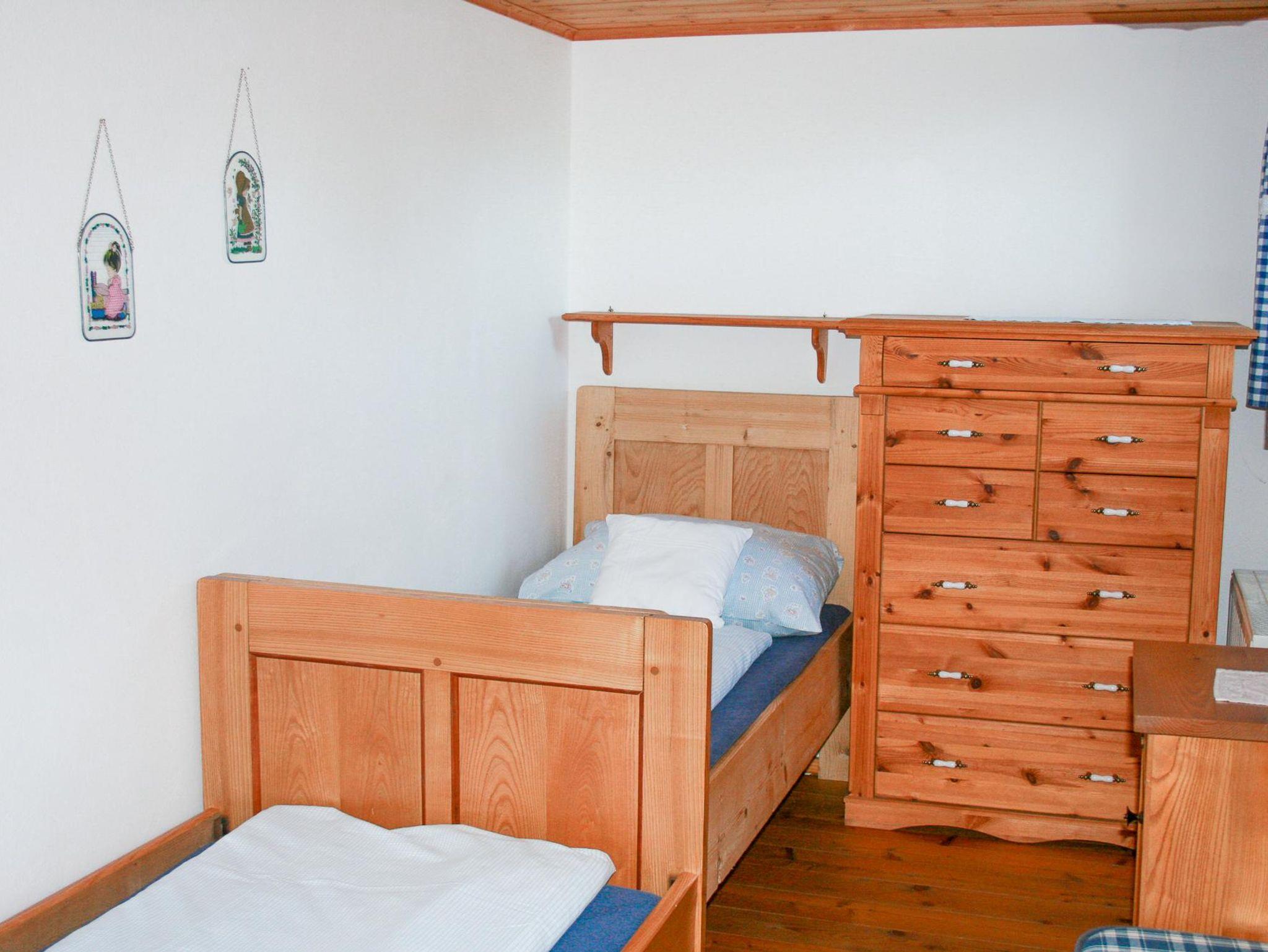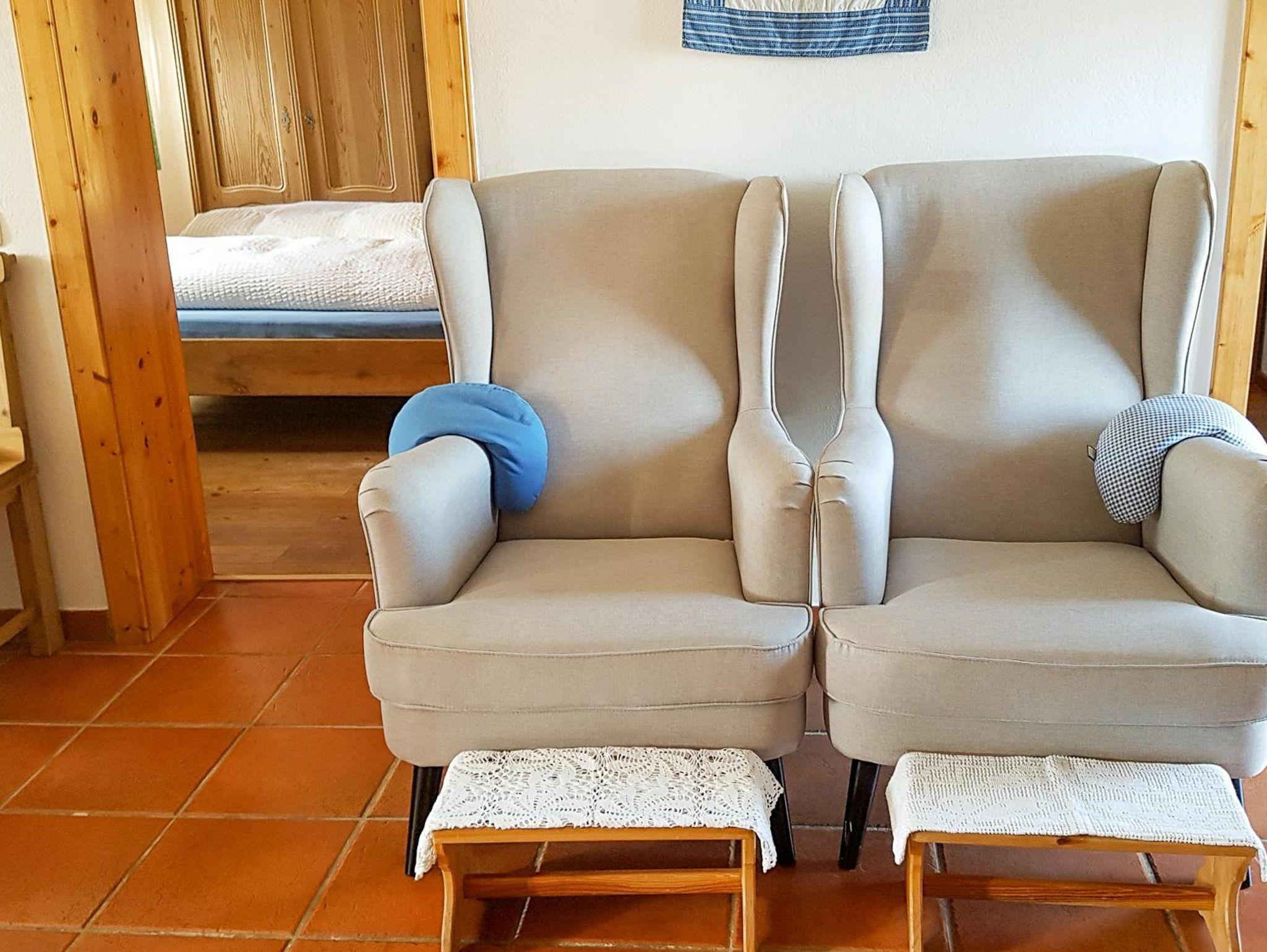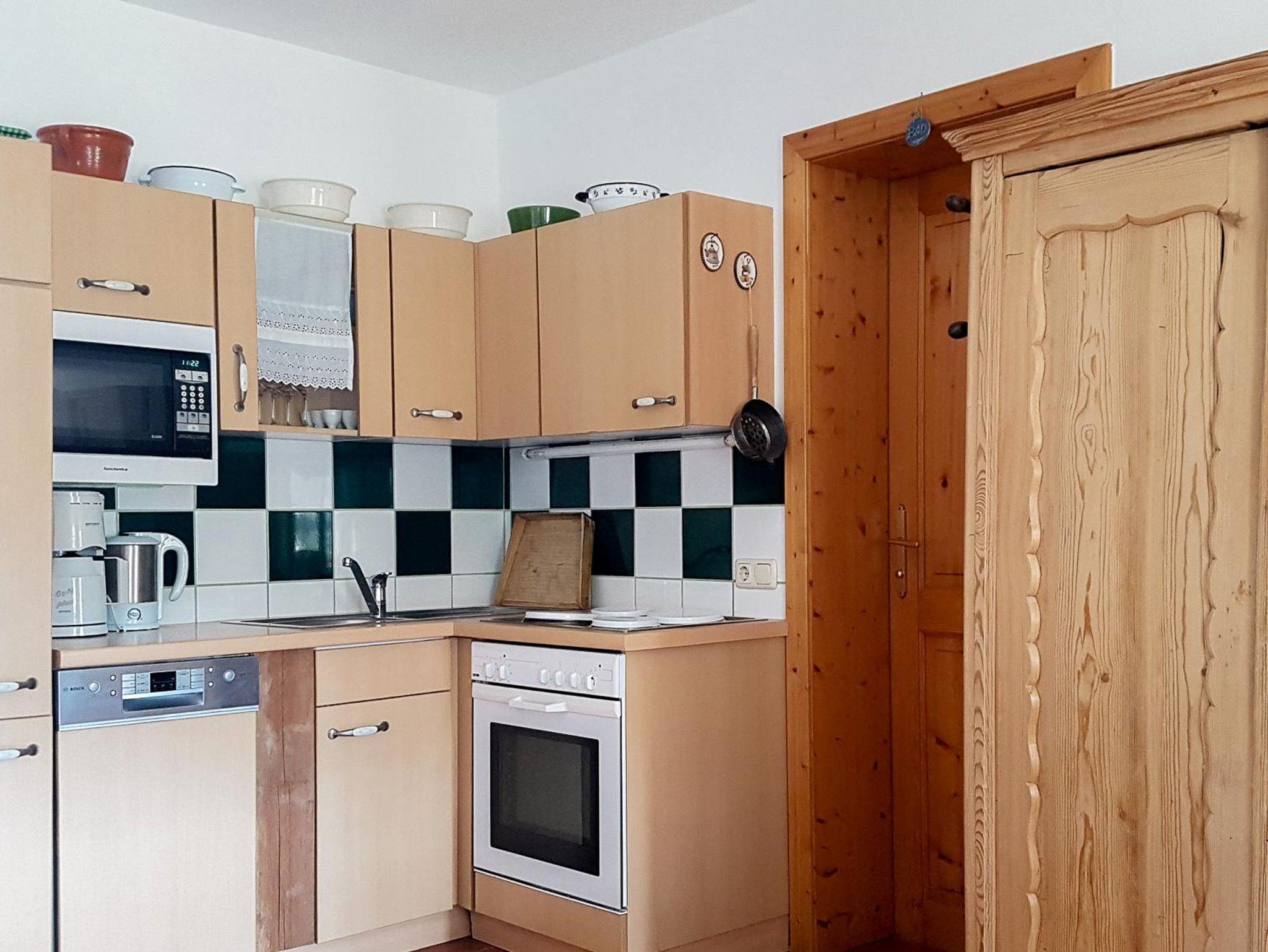 Ebenerdige Ferienwohnung mit komplett ausgestatteter Wohnküche (Geschirrspüler, Backrohr, 4 Platten, Kaffeemaschine, Teekocher, Mikrowelle), Esstisch für 4 Personen, Doppelzimmer, Zweibettzimmer, Du/WC. Gesamte Ausstattung mit Massivholzmöbel.