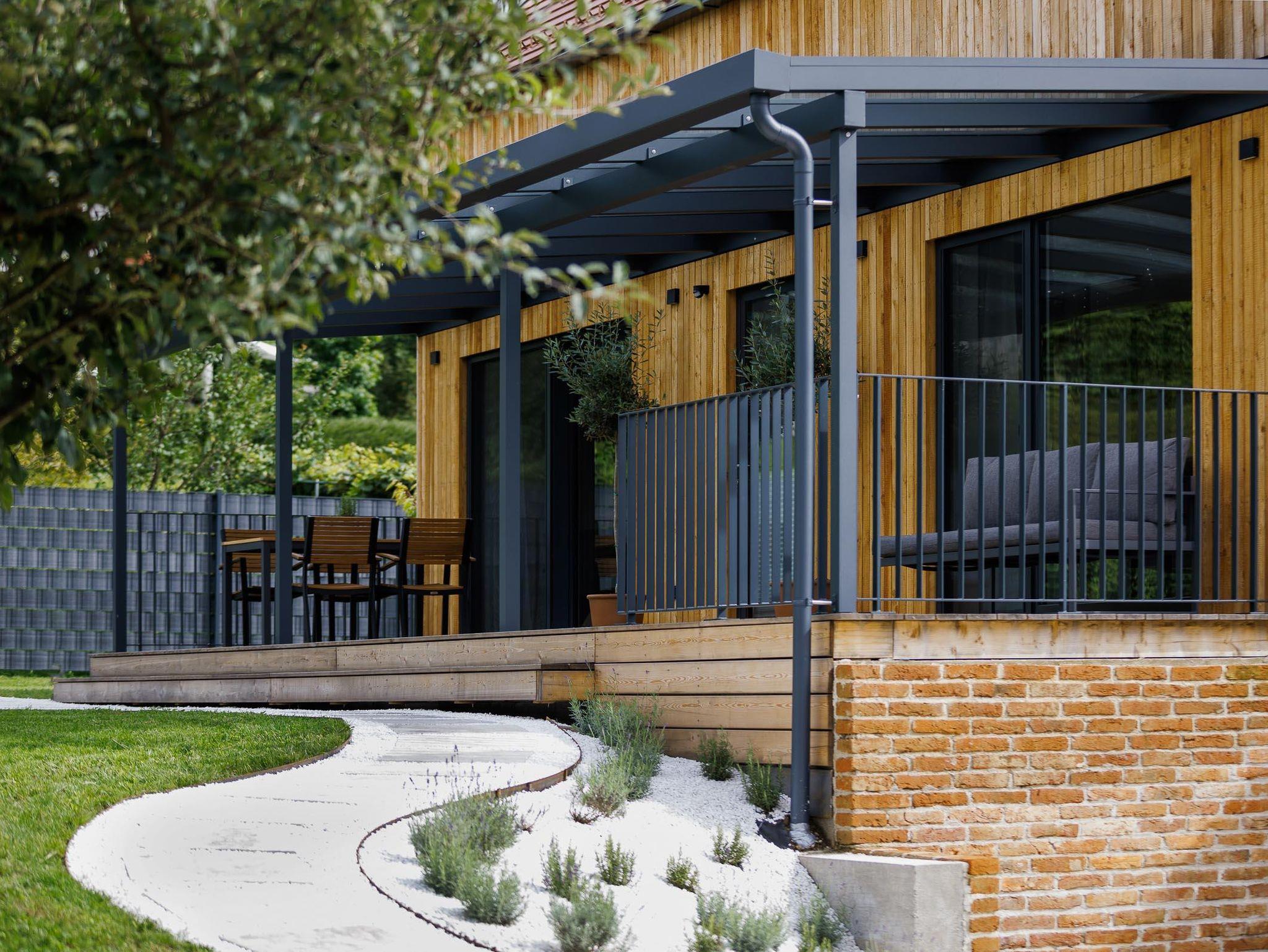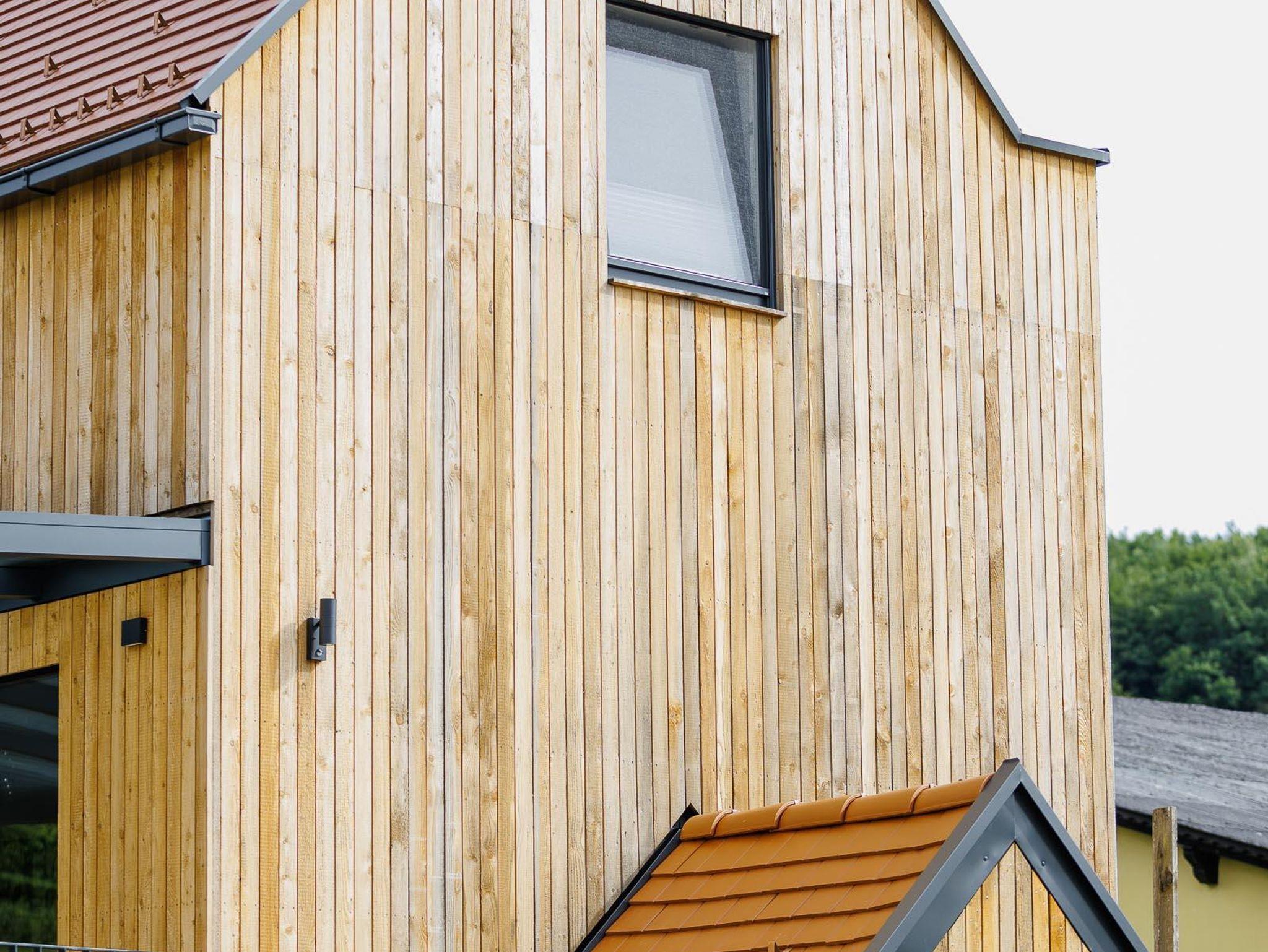 Der alte Erdkeller blieb als Weinkeller und Lagerraum erhalten. Der Geschossaufbau wurde durch einen Holzriegelbau ersetzt.