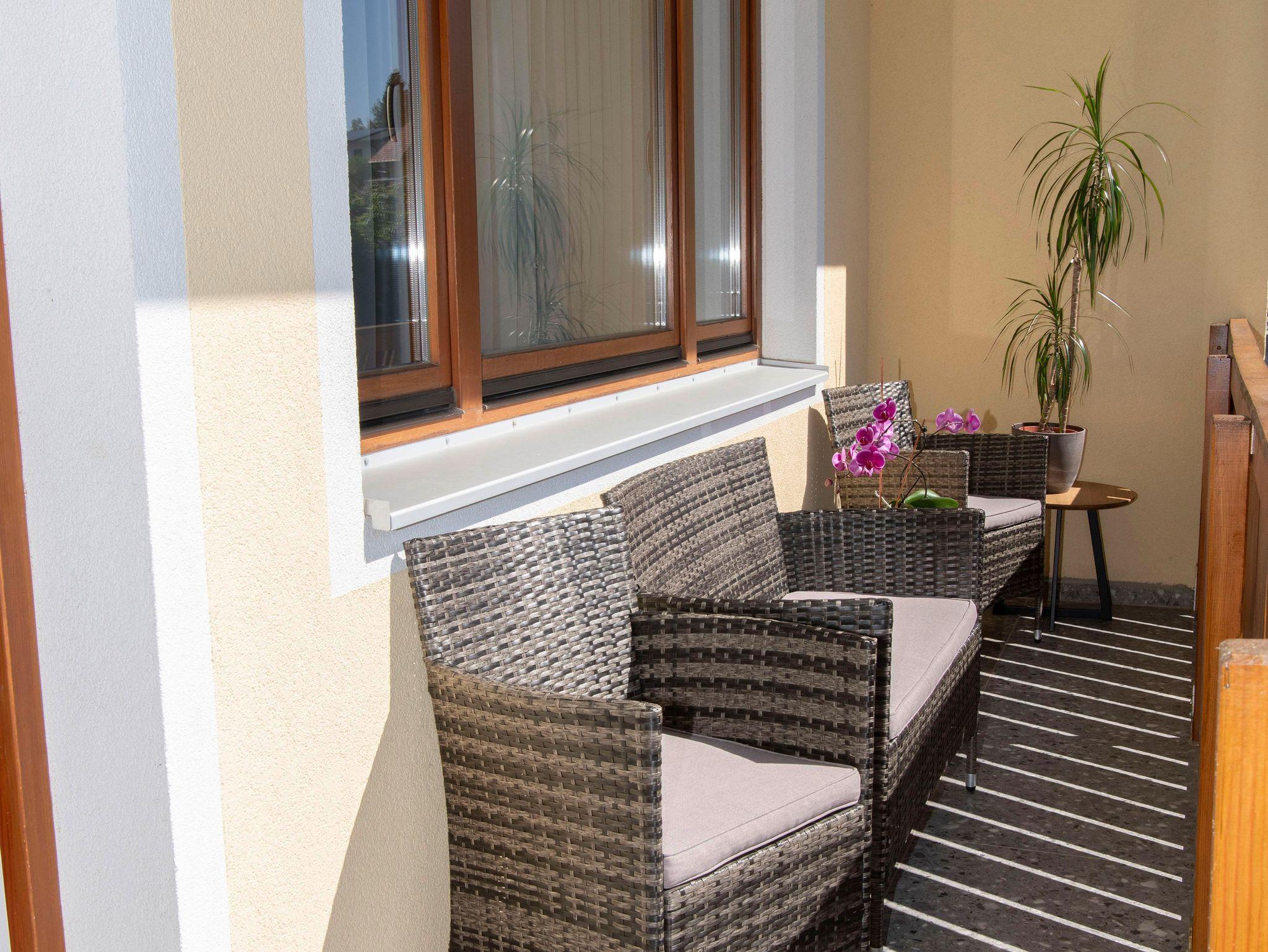 • Balkon mit Tisch und 2 Stühlen