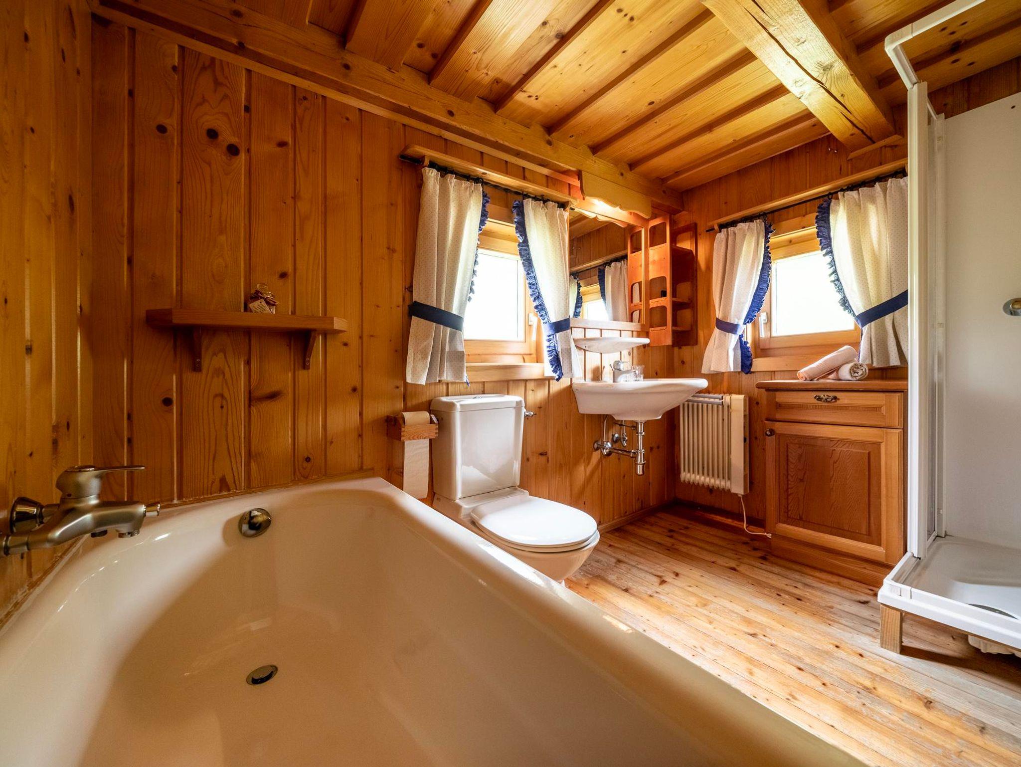 Das Holzblockhaus ist mit großer Sitzecke, Elektroherd, Kühlschrank, Toaster, Kaffeemaschine, Sat-TV, Radio, Elektroheizung, Gartenmöbeln und privater Sonnenterrasse ausgestattet. Bettwäsche und Handtücher werden bereitgestellt. Im Obergeschoß befindet sich das Schlafzimmer mit Doppelbett und ausziehbarer Schlafcouch für zwei Erwachsene und zwei Kinder, im Untergeschoß Badezimmer mit Dusche, WC und Badewanne.