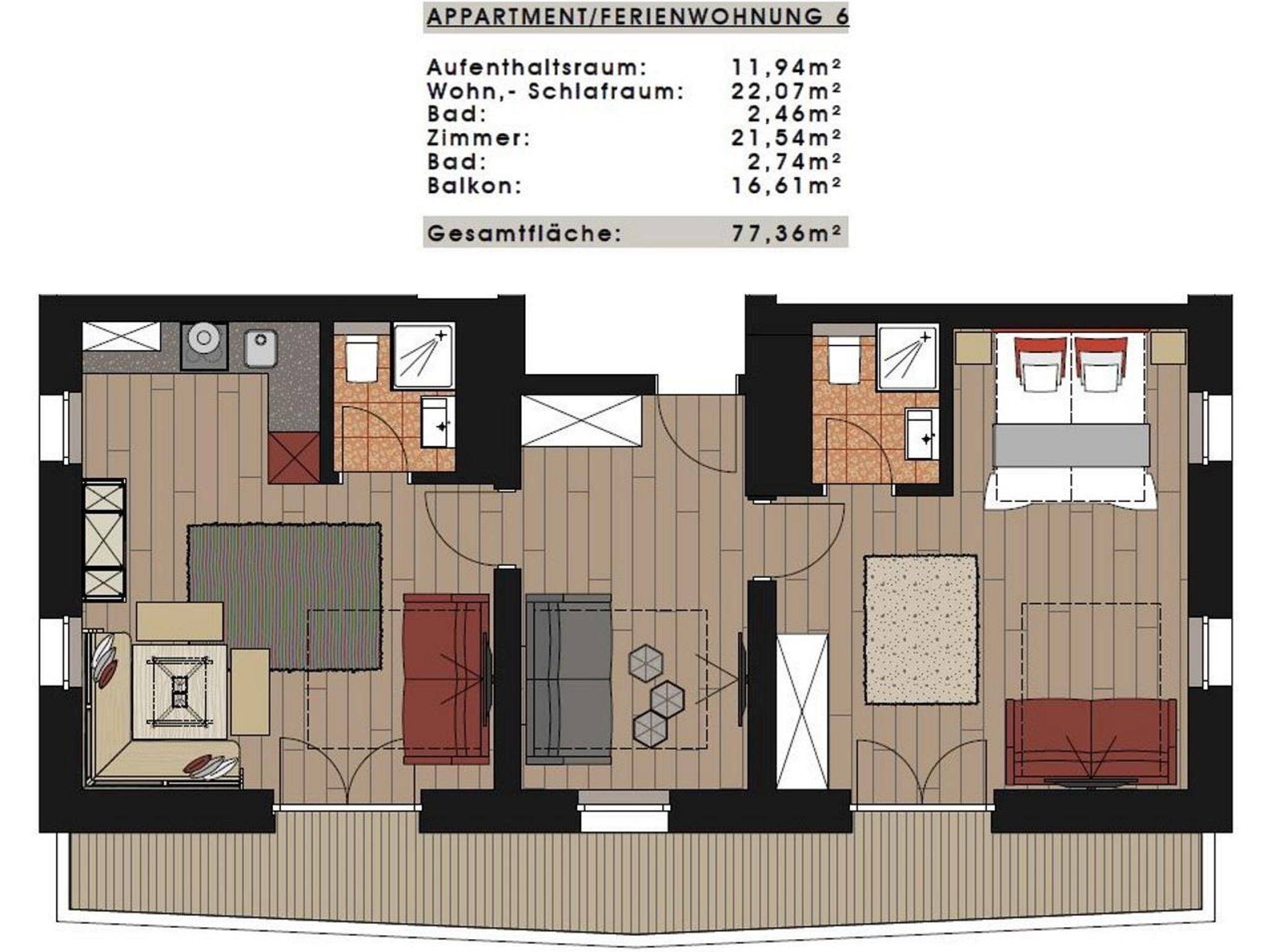 Eine supergemütliche gehoben ausgestattete Wohnung mit 77 m² für 4 bis 8 Personen mit edlem Eichenholzboden mit 2 Schlafzimmern und 2 Bädern, großem Balkon mit Kaiserblick.