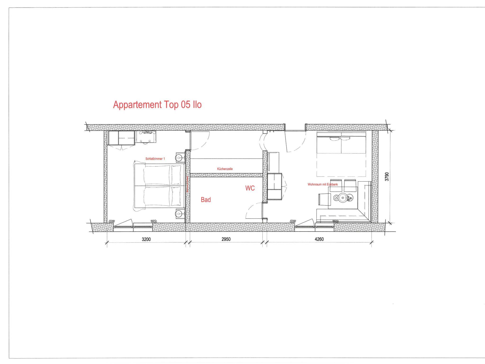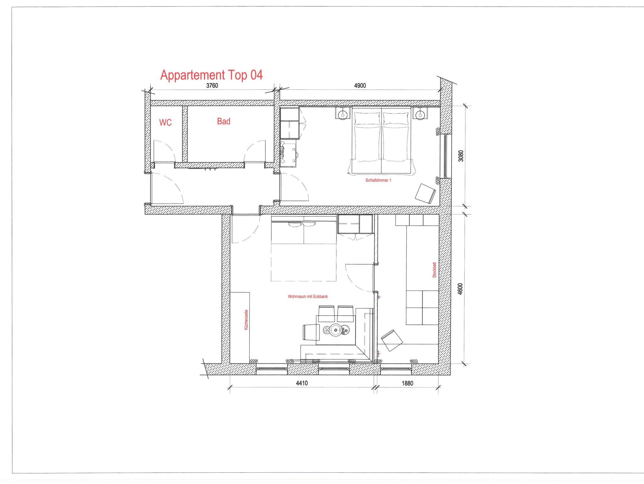 FW 2 bis 6 Personen, 55m²; Schlafzimmer/Wohnschlafraum mit Esstisch, Sofa, Belegung ab 5 P. ein extra Kinderzimmer (Stockbett), flatscreen-TV, Badezimmer, Dusche, Handtuchtrockner, Föhn, separates WC, voll ausgestattete Küchenzeile (ohne Backofen).
