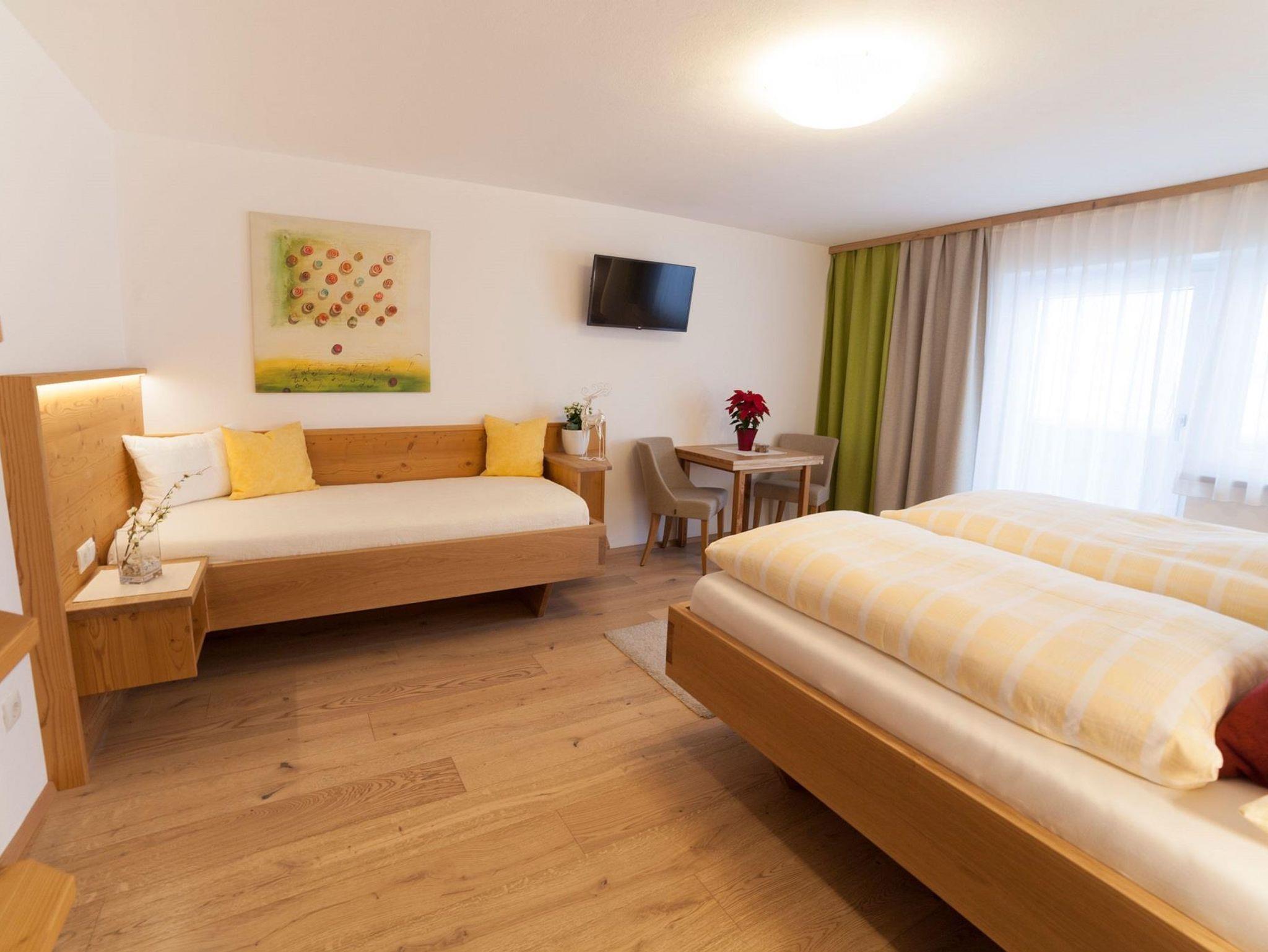 Geräumiges, helles Familienzimmer mit Balkon und Parkettboden, ca. 20 - 21 m², mit Doppelbett und Zusatzbett. Badezimmer ca. 4 - 6 m² mit Dusche und teils getrenntem WC, Internet per W-lan kostenlos. Zimmerausstattung: Tisch und Stühle, Schrank, Heizung, Flachbild Sat-TV, Radio, Föhn, Wasserkocher, Wäschespinne, Balkon.