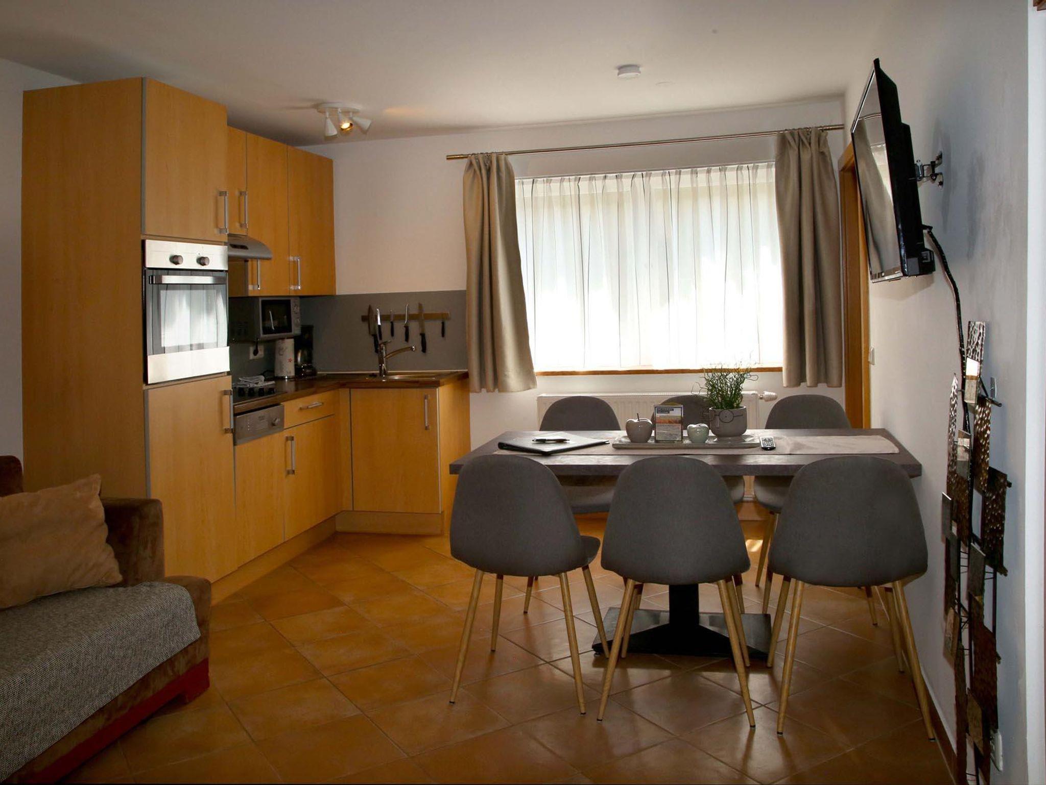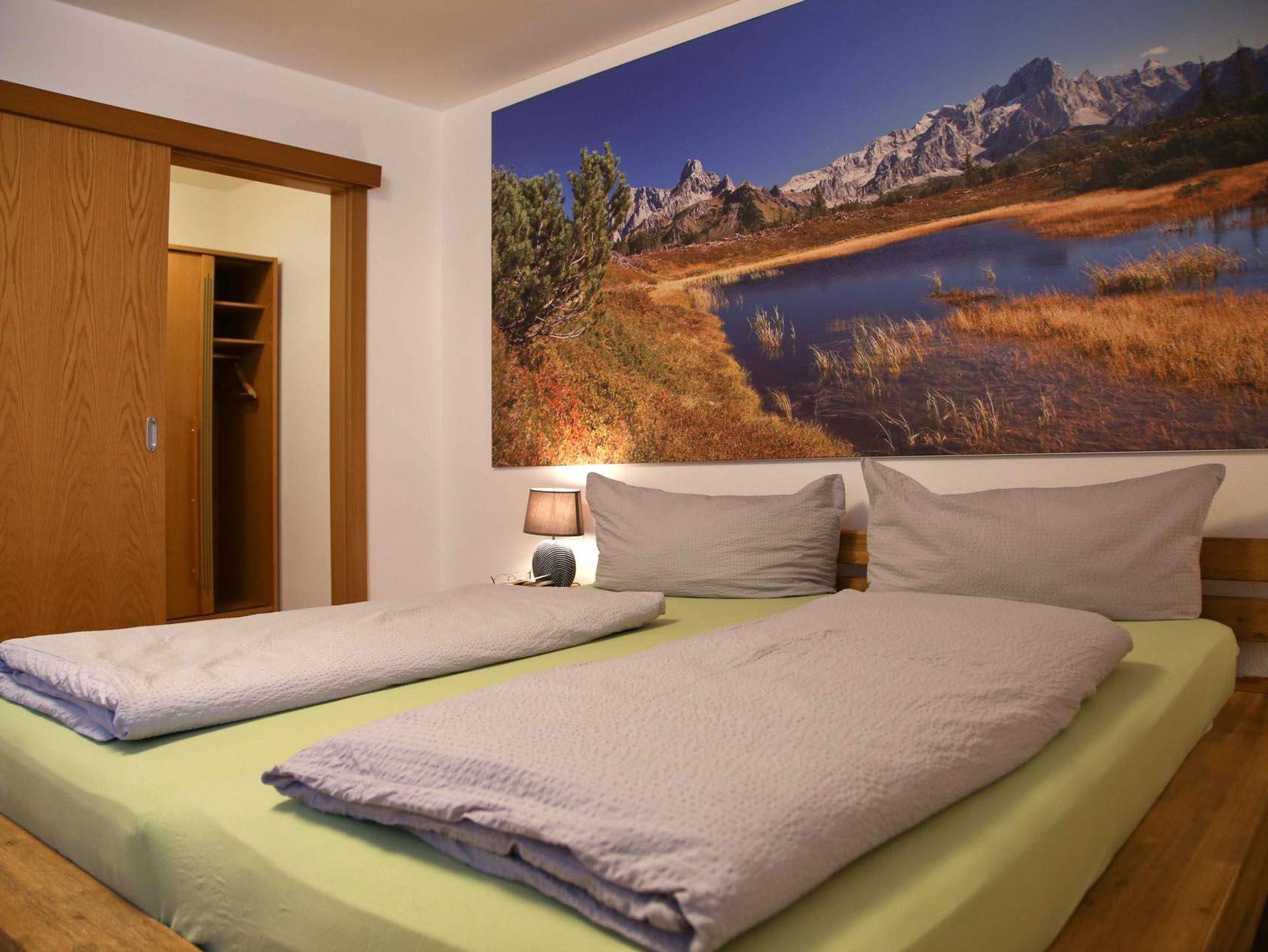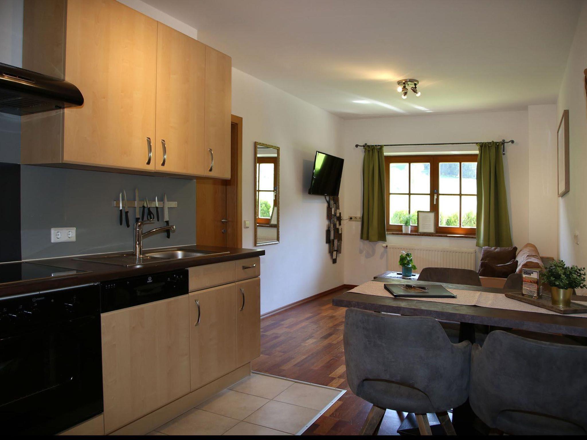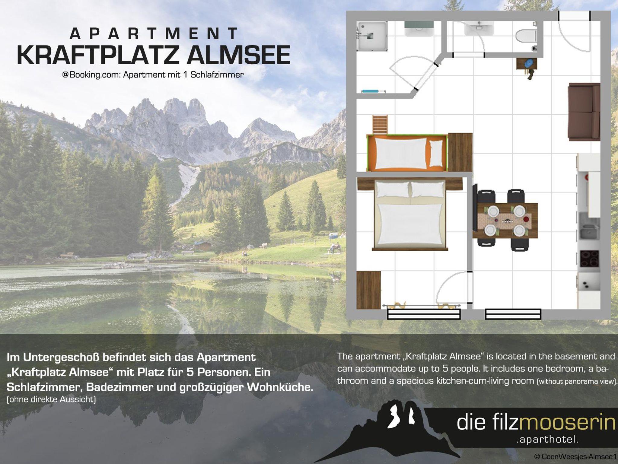 Im Untergeschoß befindet sich das Apartment Kraftplatz Almsee mit Platz für 5 Personen. Ein Schlafzimmer, Badezimmer und großzügige Wohnküche (ohne direkte Aussicht).