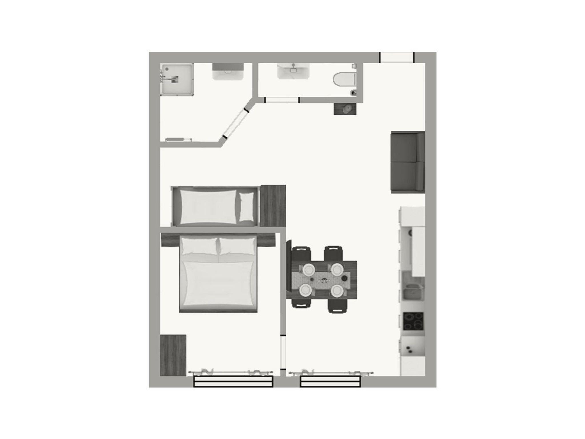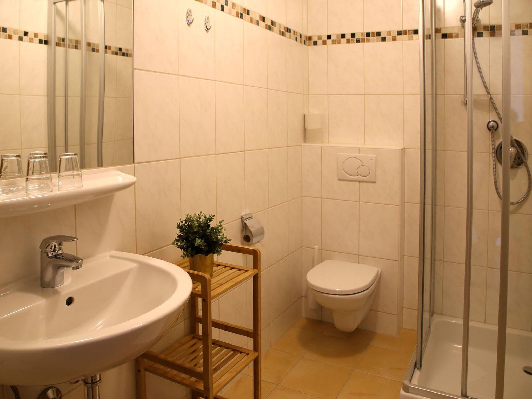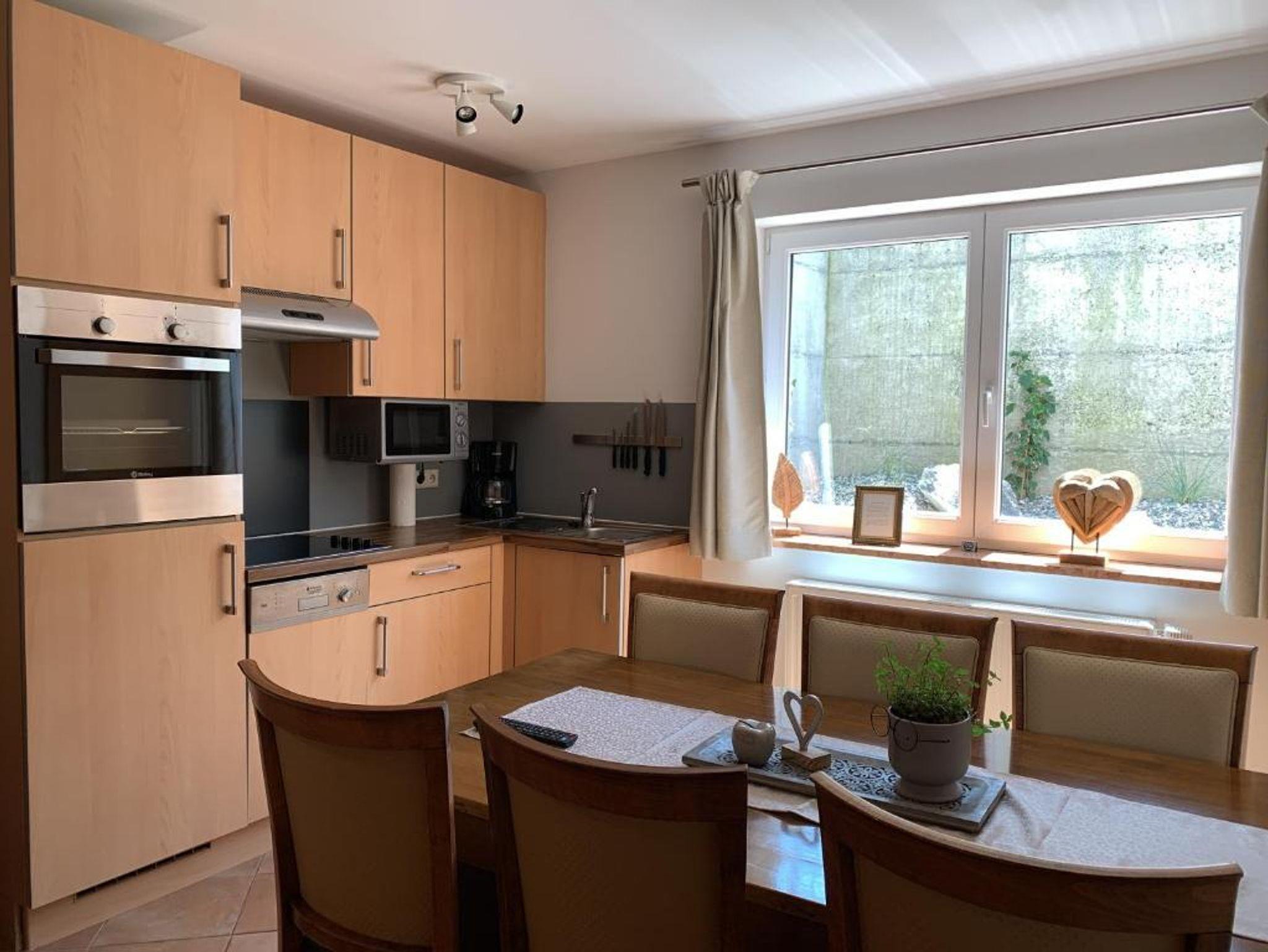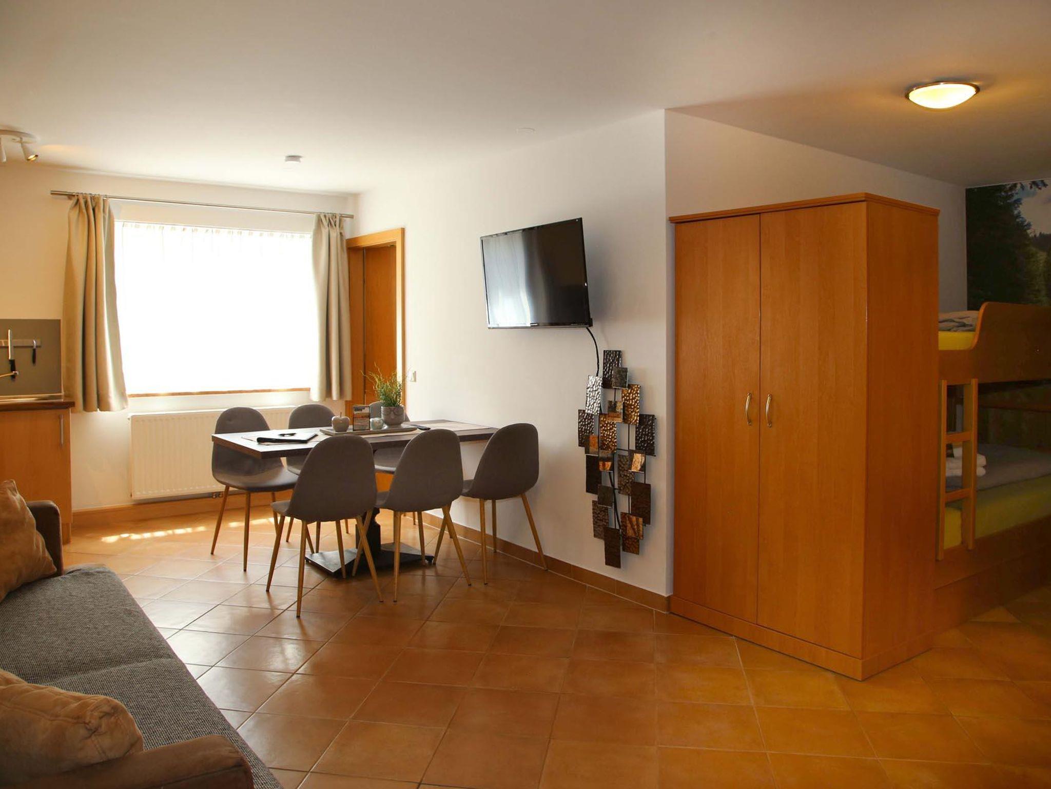 Im Untergeschoß befindet sich das Apartment Kraftplatz Almsee mit Platz für 5 Personen. Ein Schlafzimmer, Badezimmer und großzügige Wohnküche (ohne direkte Aussicht).
