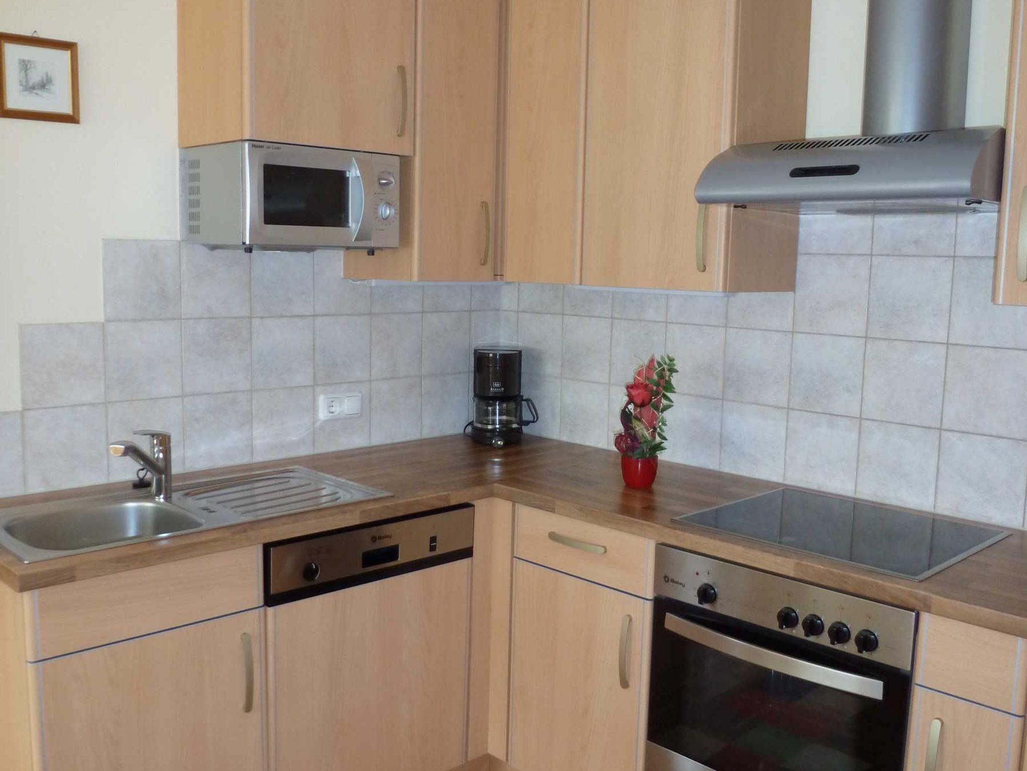 - Wohnraum mit Küchenzeile (Kühlschrank, Cerankochfeld, Backofen, Mikrowelle, Geschirrspüler) und gemütlicher Essecke mit Eckbank