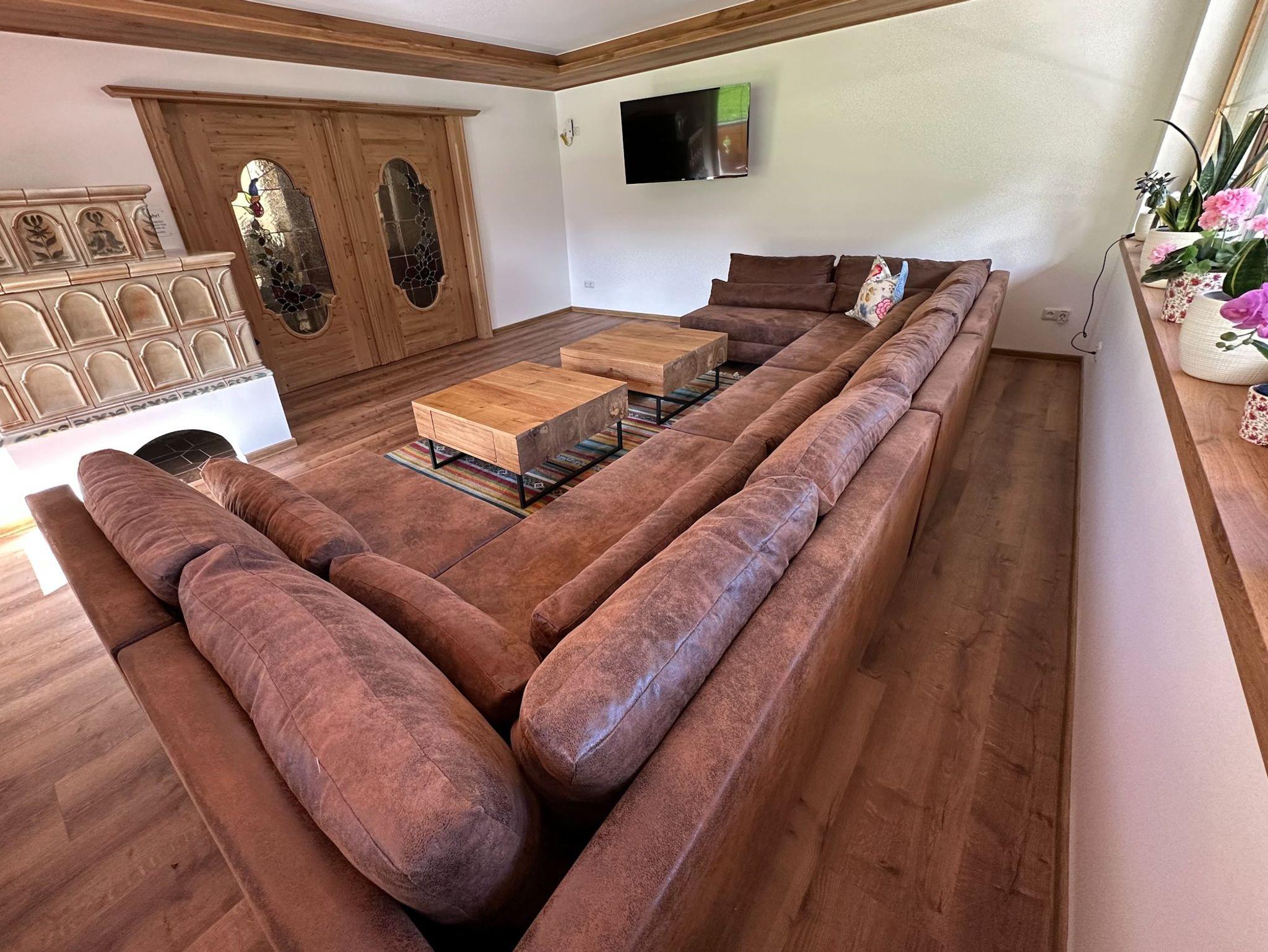 - Wohnzimmer mit großer Couch, Kachelofen (nur zur Dekoration) und Flat-TV