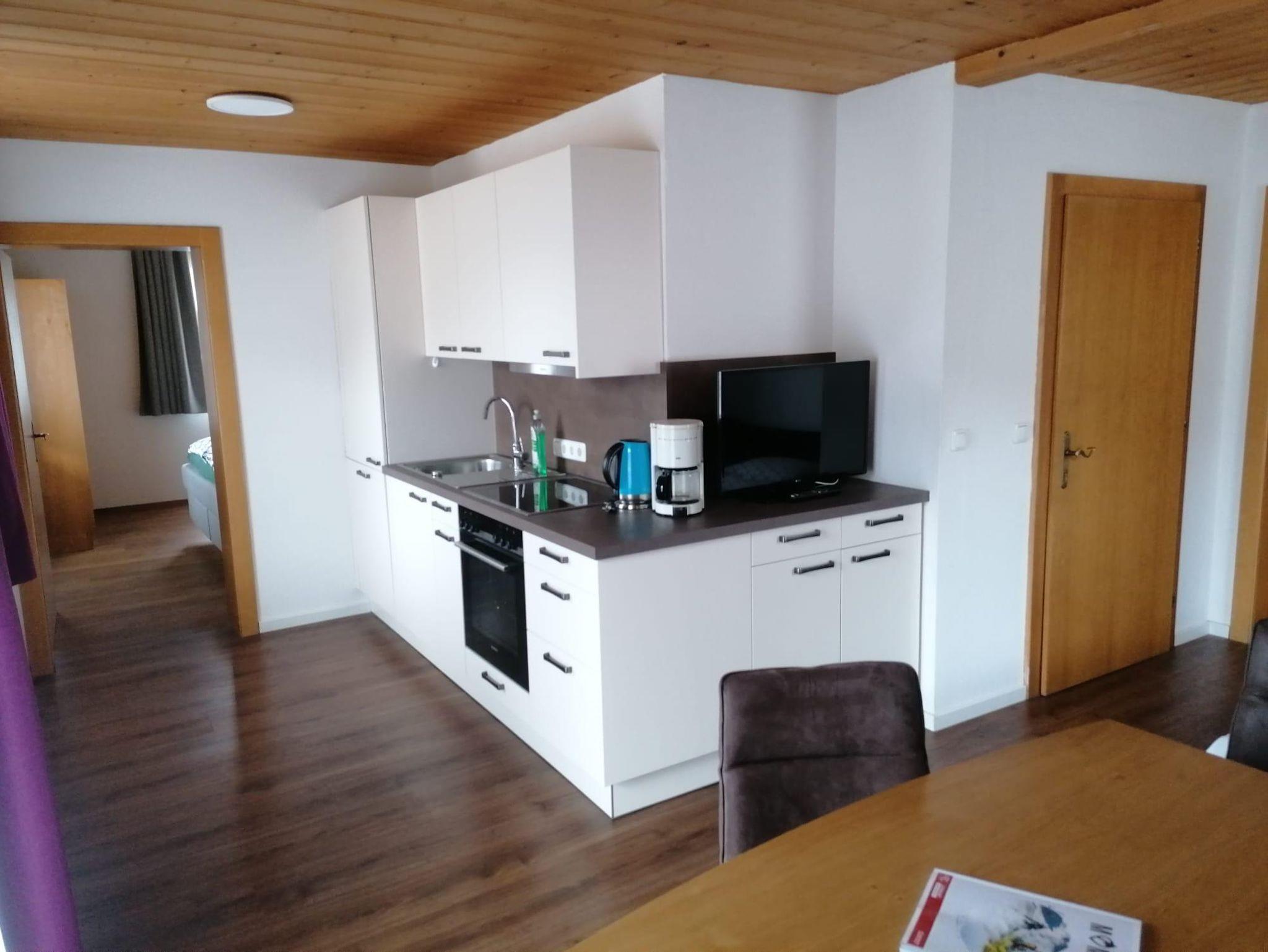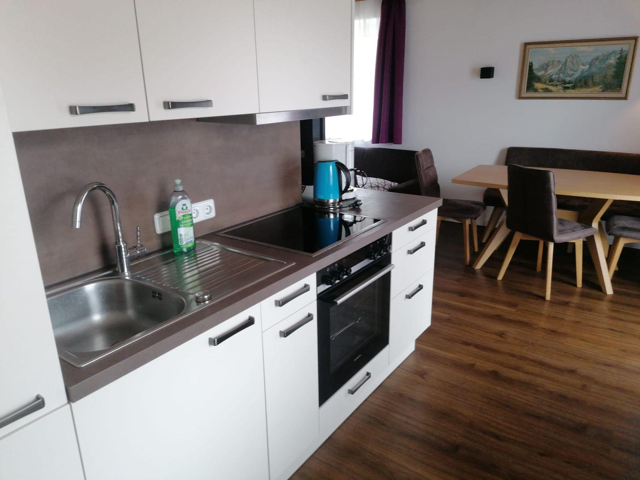 voll ausgestattete Wohnküche (Kühlschrank mit Gefrierabteil, Herd, Backrohr, Kaffeemaschine, Wasserkocher),