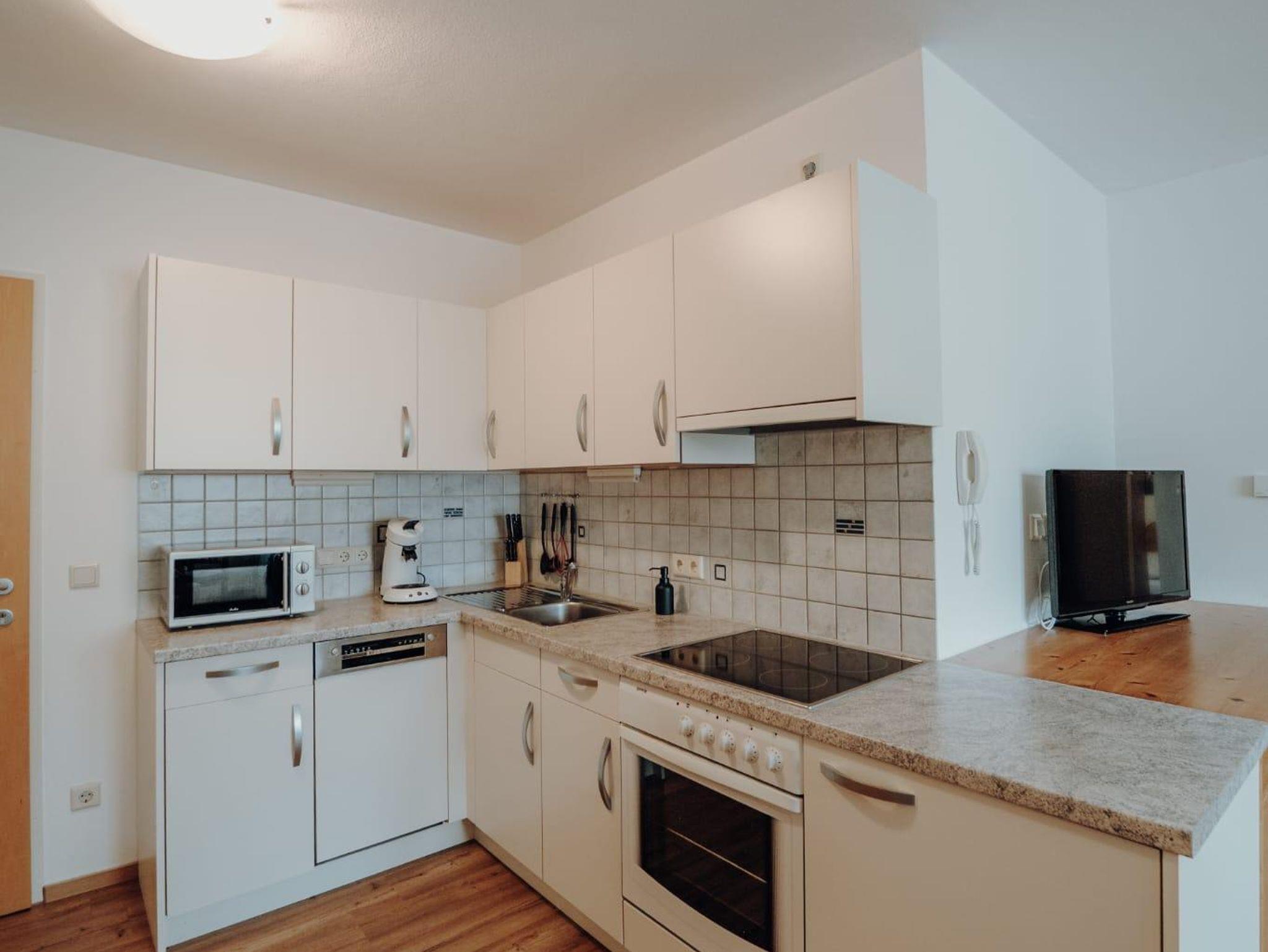 komplett ausgestattete Küche (Mikrowelle, Elektroherd mit Backrohr, Kaffeemaschine, Geschirrspüler),