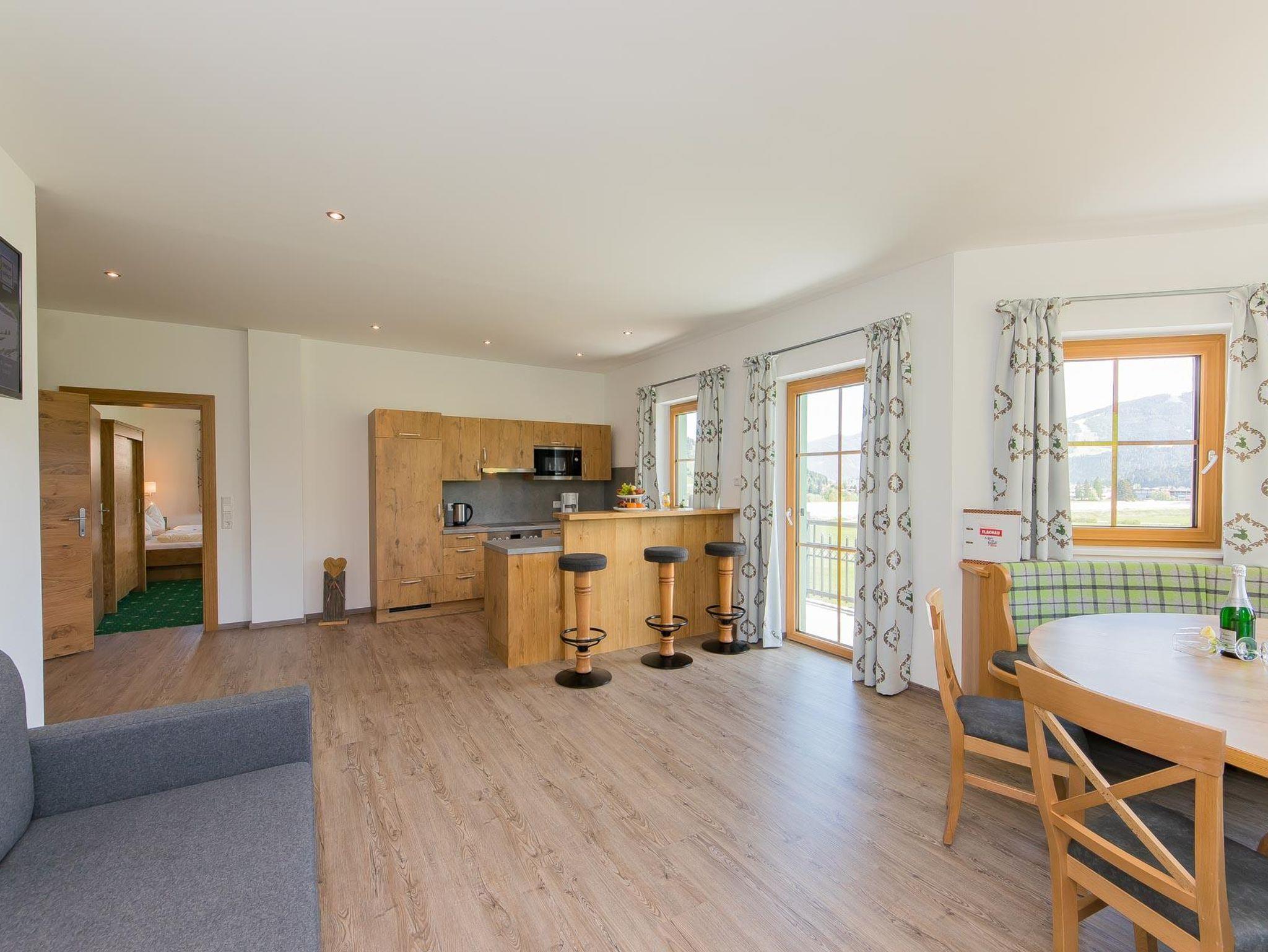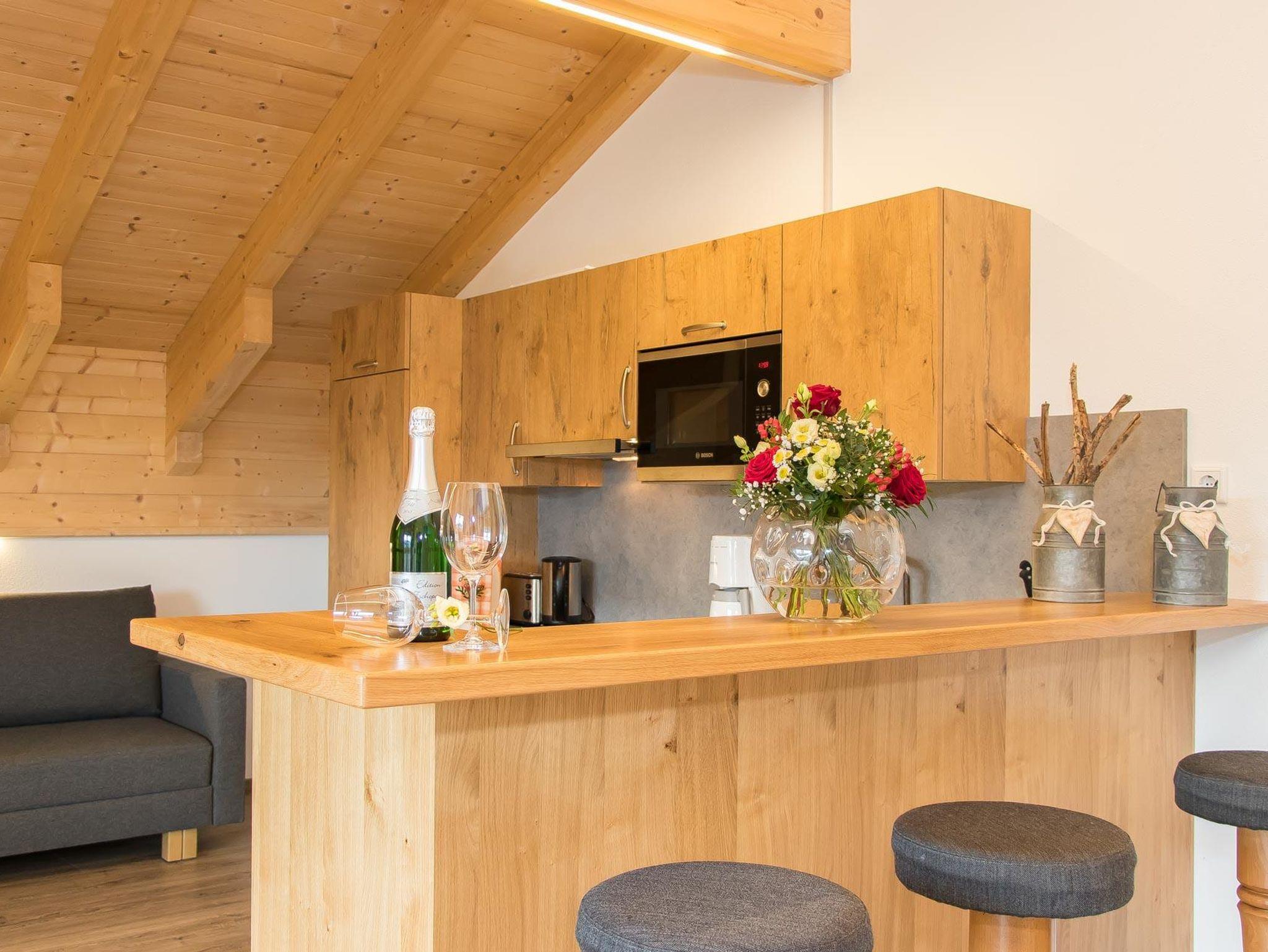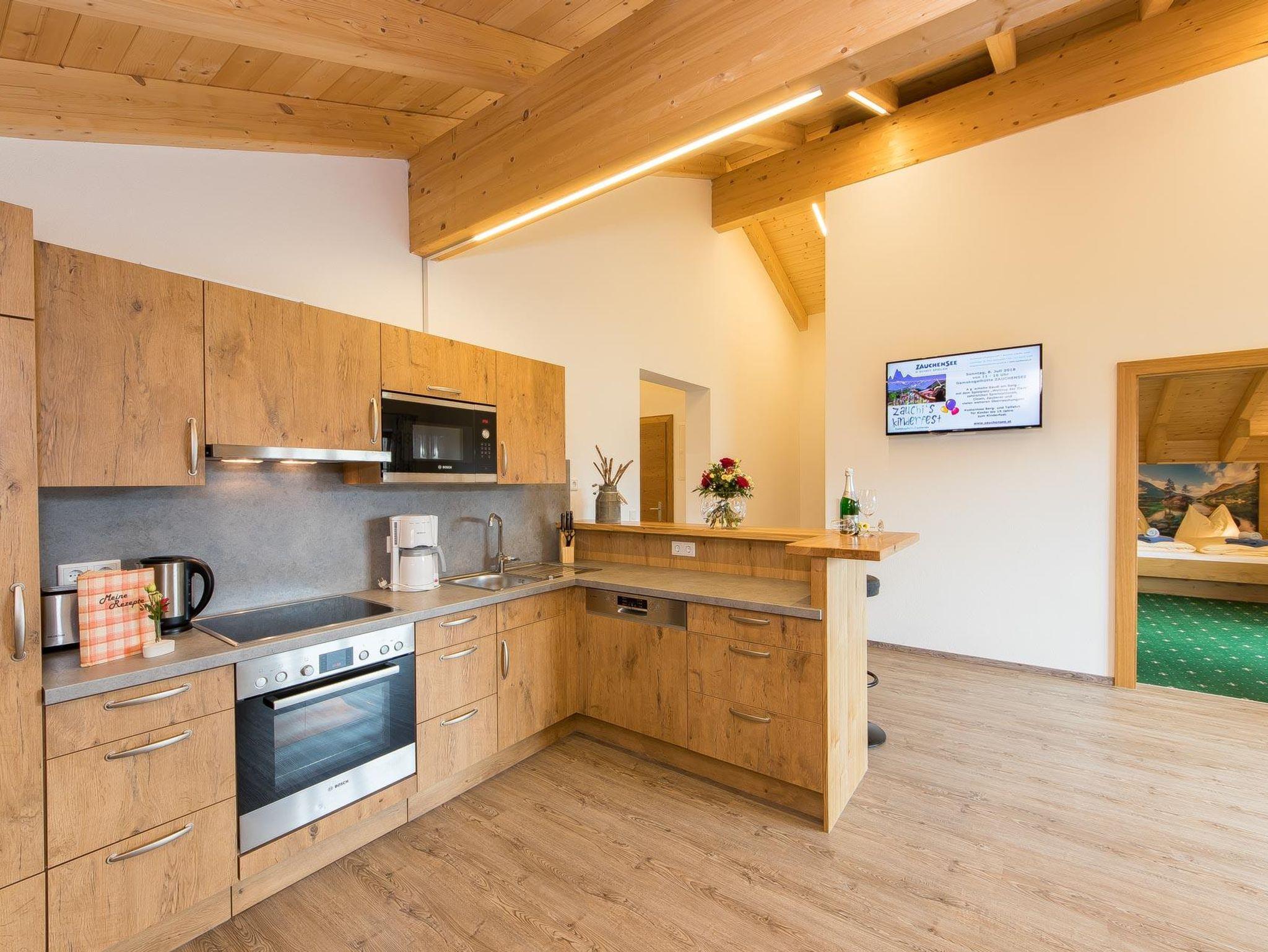 • voll ausgestattete Küche mit 4-Platten Cerankochfeld inkl. Backrohr, Mikrowelle, Wasserkocher, Geschirrspüler, Kühlschrank mit Gefrierfach, Toaster, Kaffeemaschine