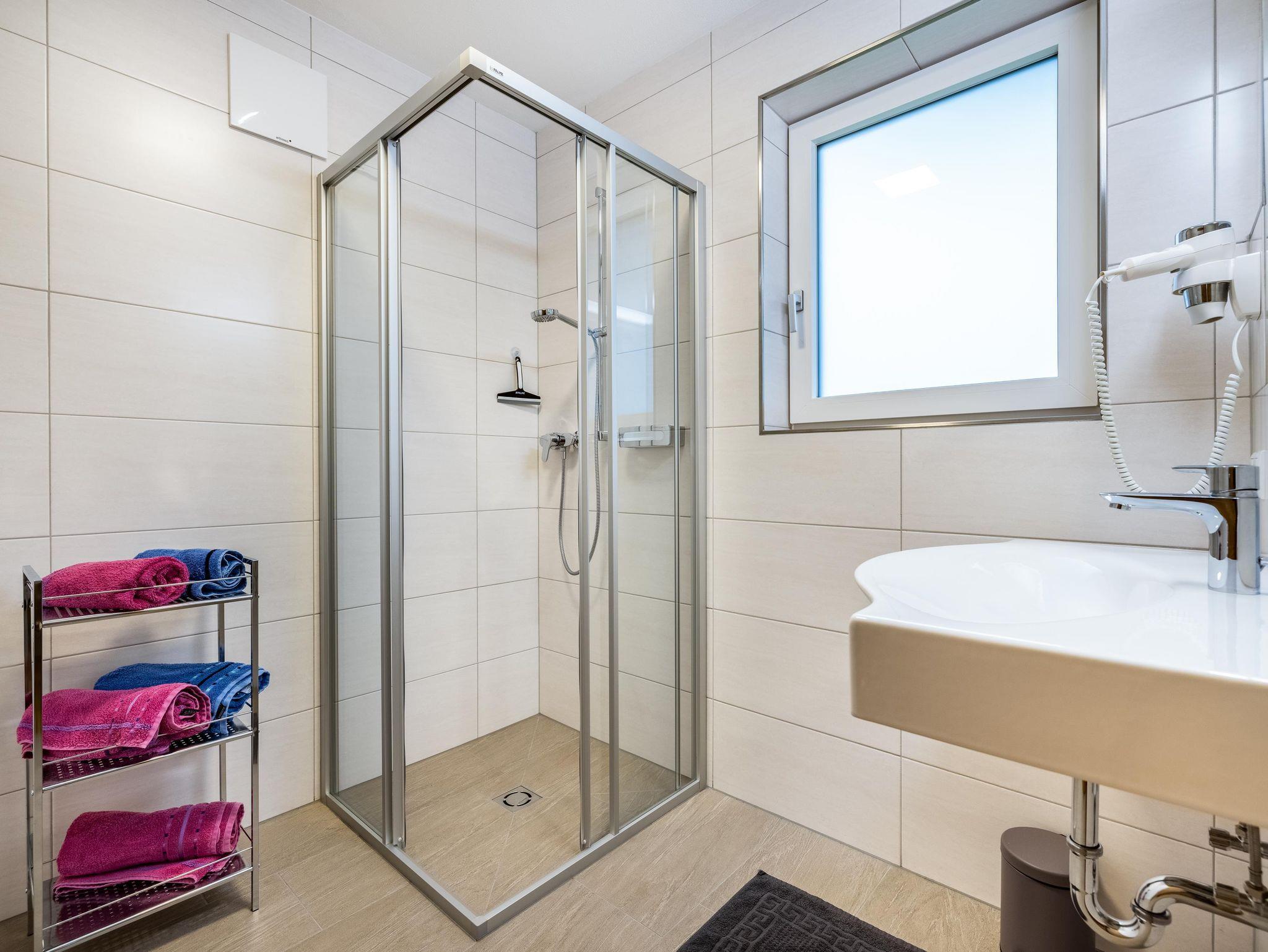 • 3 Badezimmer mit Waschbecken, WC, Dusche, Handtuchtrockner und Haarföhn