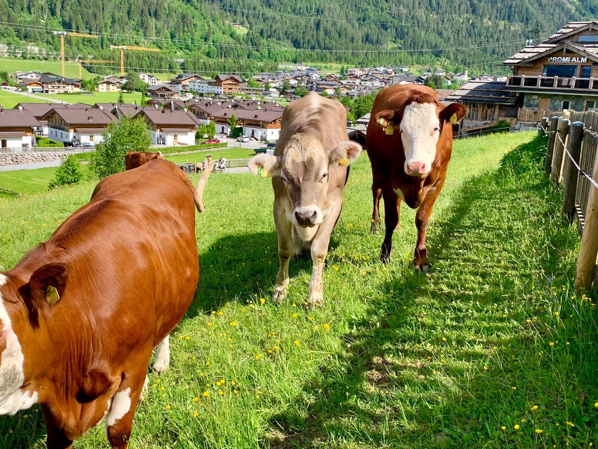 In der Sommerzeit kann man direkt von der Lodge aus den Kühen beim Weiden zusehen. Diese kommen auch gerne für ein paar Streicheleinheiten vorbei – wie auf der Alm.