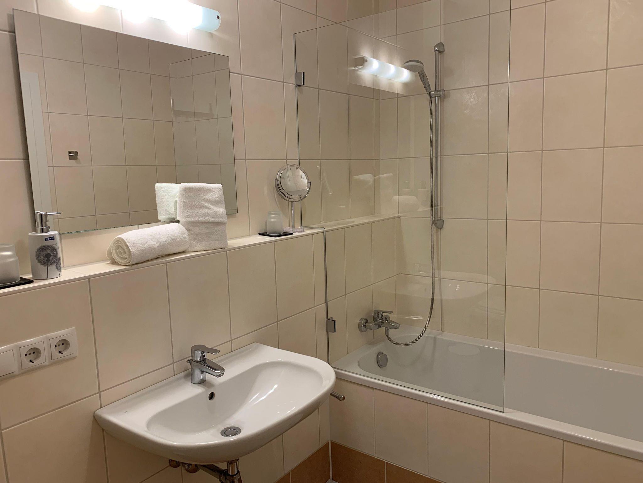 • Badezimmer mit Badewannen-Dusch-Kombination / WC, Haarfön, Seifenspender