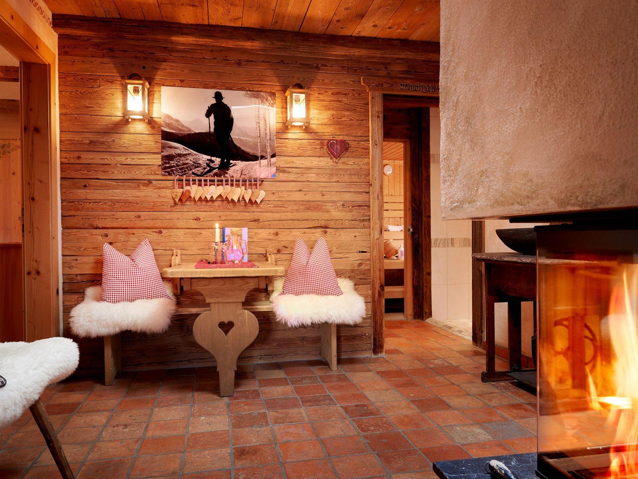 • privater Wellnessbereich mit eigener Sauna, Regendusche/Kneippschlauch und „Hair & Body Liquid“ Spender • Ruhebereich vor dem offenen Kamin