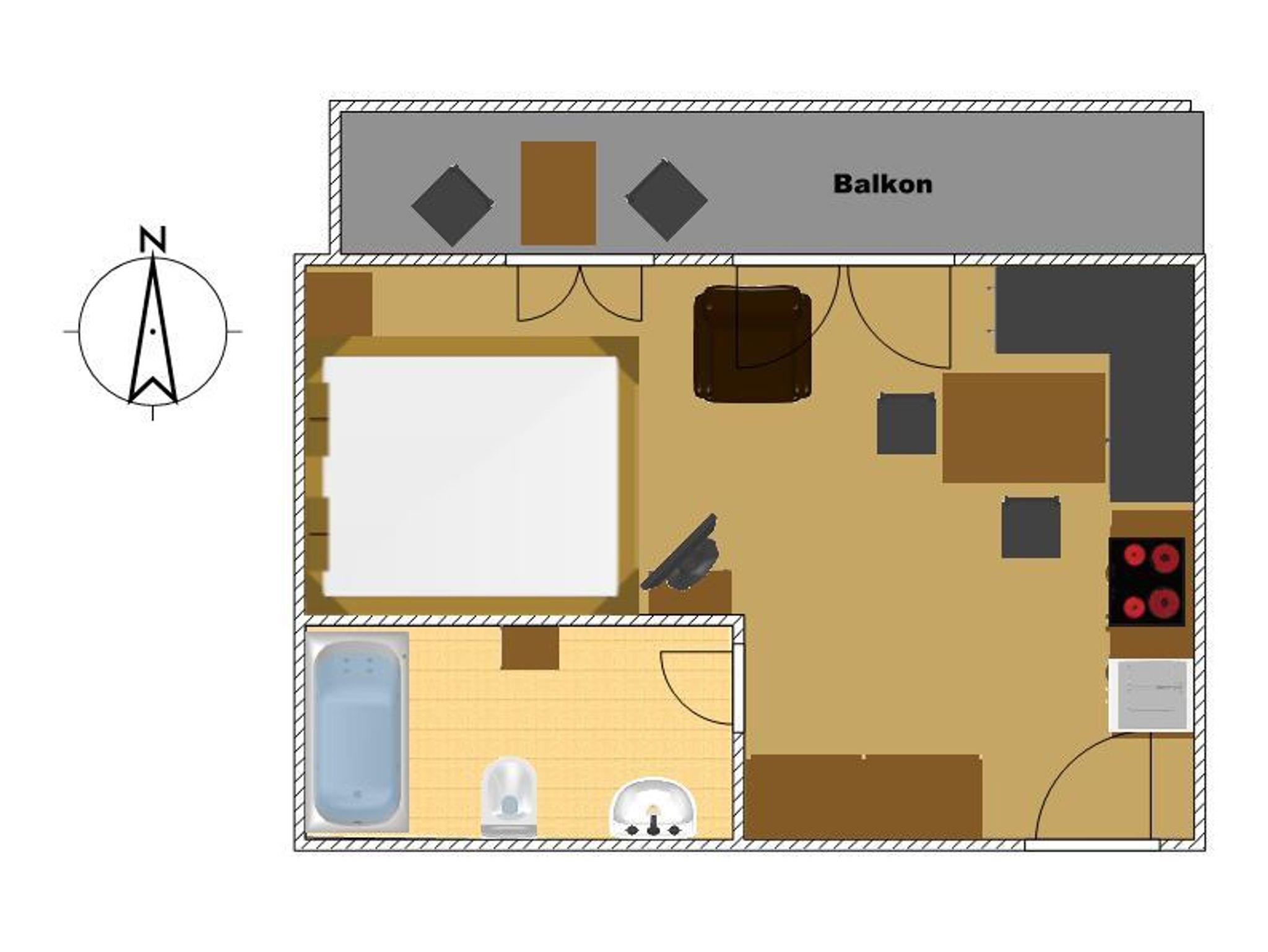 ca. 25 m², Wohn-Schlafraum für 2-3 Personen mit einem Doppelbett, einem Ausziehsofa, Kochnische, Sitzecke, Bad mit Dusche und Wanne, Kabel-TV, W-LAN, Balkon