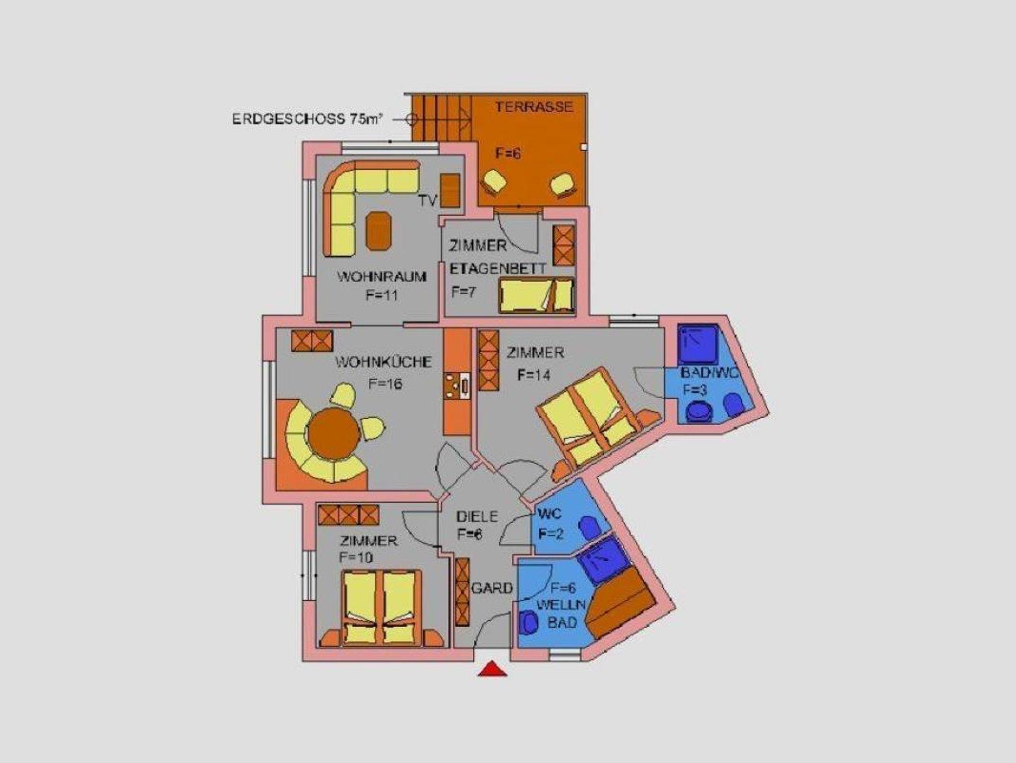 Das Appartement für 2 - 6 Personen befindet sich im Erdgeschoß und verfügt über 3 Schlafzimmer, einen Wohnraum, Küche mit Geschirrspüler, E-Herd, Backrohr, Kühlschrank, Mikrowelle, Kaffeemaschine und Wasserkocher, 2 Bäder mit WC, ein seperates WC, 2 Flatscreen-TV, CD-Player, W-LAN, eine Infrarotsauna und eine Terrasse.