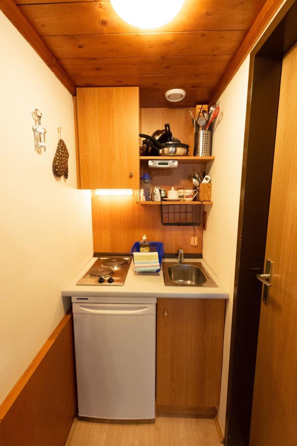 Inside, a functional mini-kitchen awaits you, equipped with a 2-ring hob, mini oven, fridge, microwave, kettle and coffee machine - everything you need to prepare small meals. The combined living room and bedroom is furnished with a cosy double bed (160/200 cm), where you can relax after an eventful day. A television with satellite TV provides entertainment, while the bathroom with shower, washbasin and WC rounds off the living comfort.