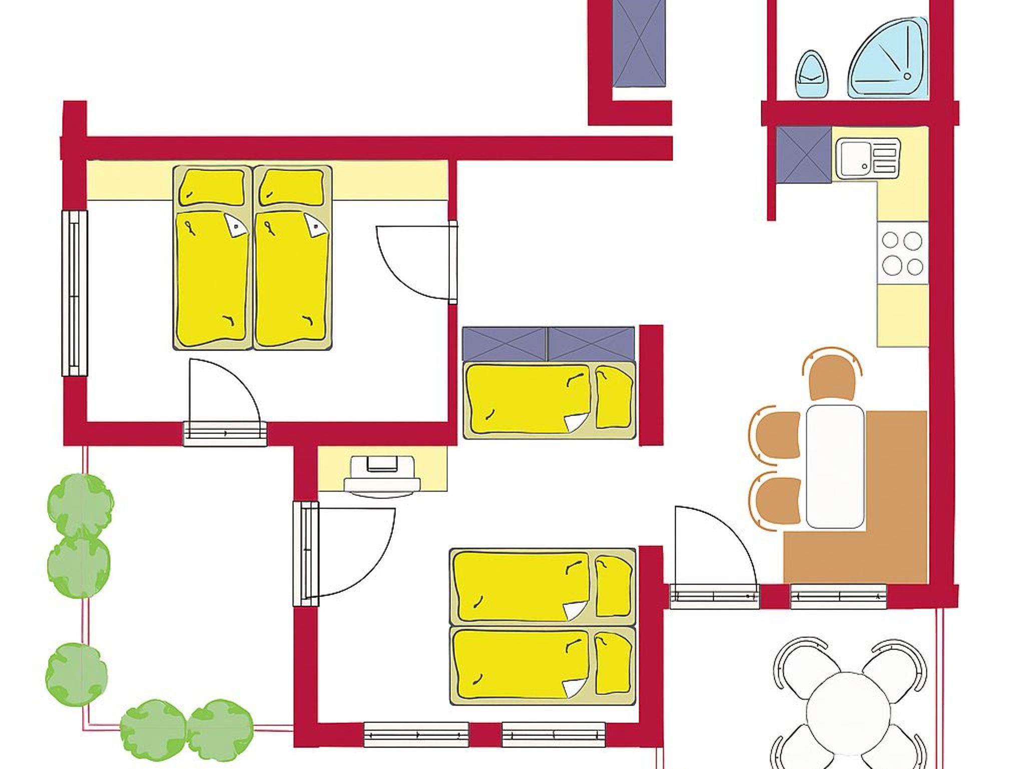 Ferienwohnung 2 ist 54 m² groß. Es besteht aus zwei Schlafzimmern, einer Küche, einer Dusche / WC, einem Vorraum mit Garderobe, eigene Terrasse und einer großen Liegewiese.