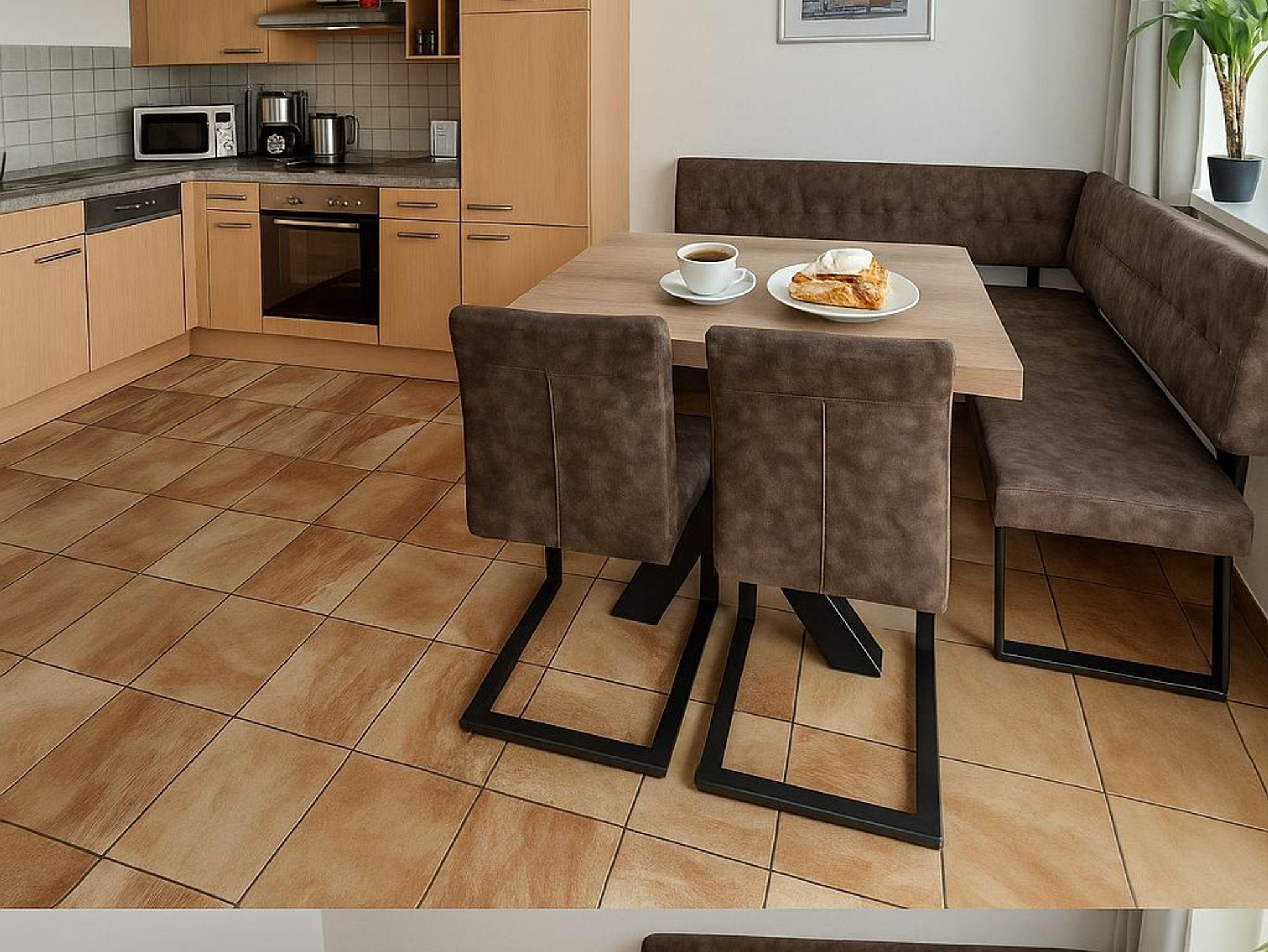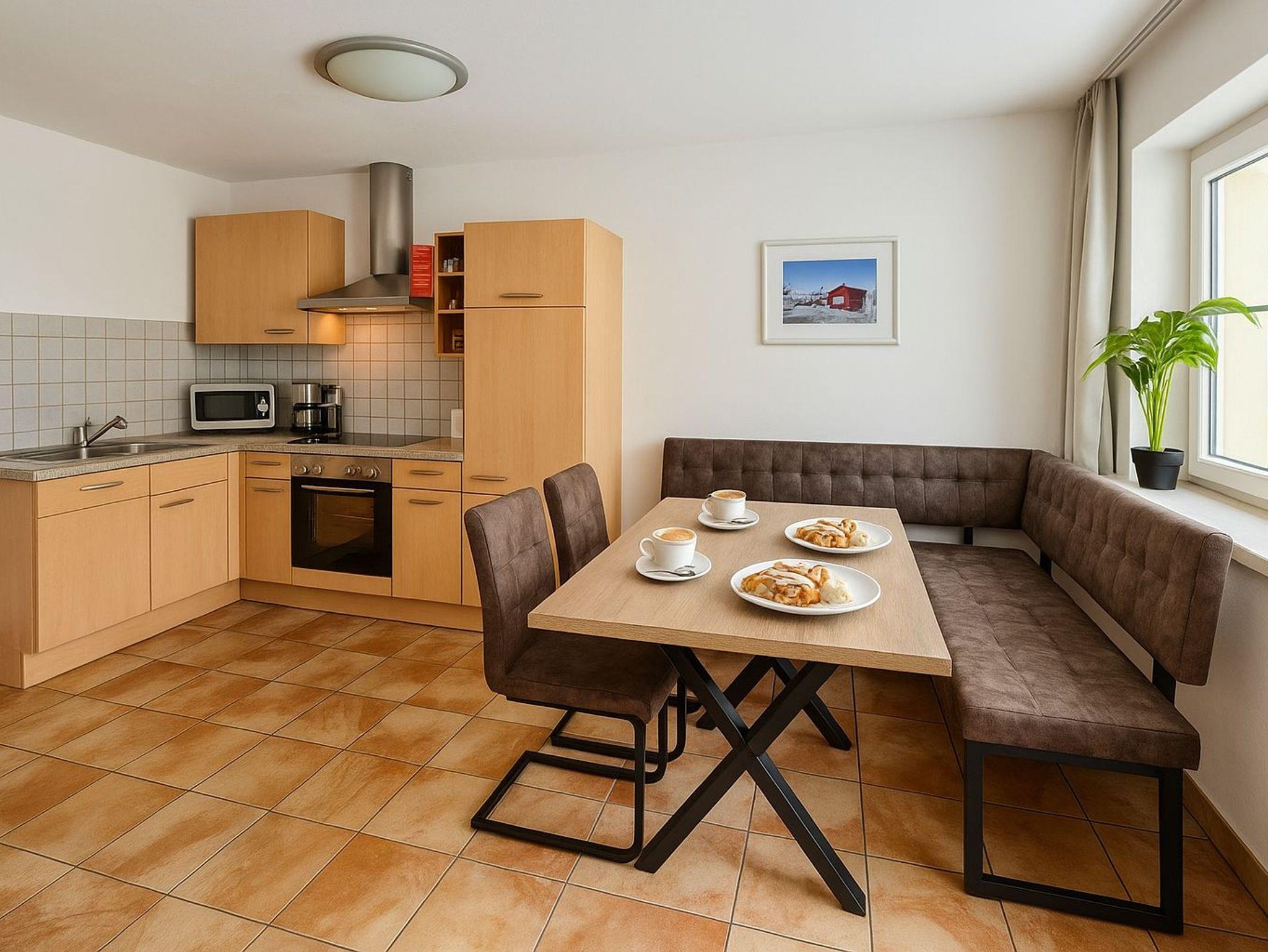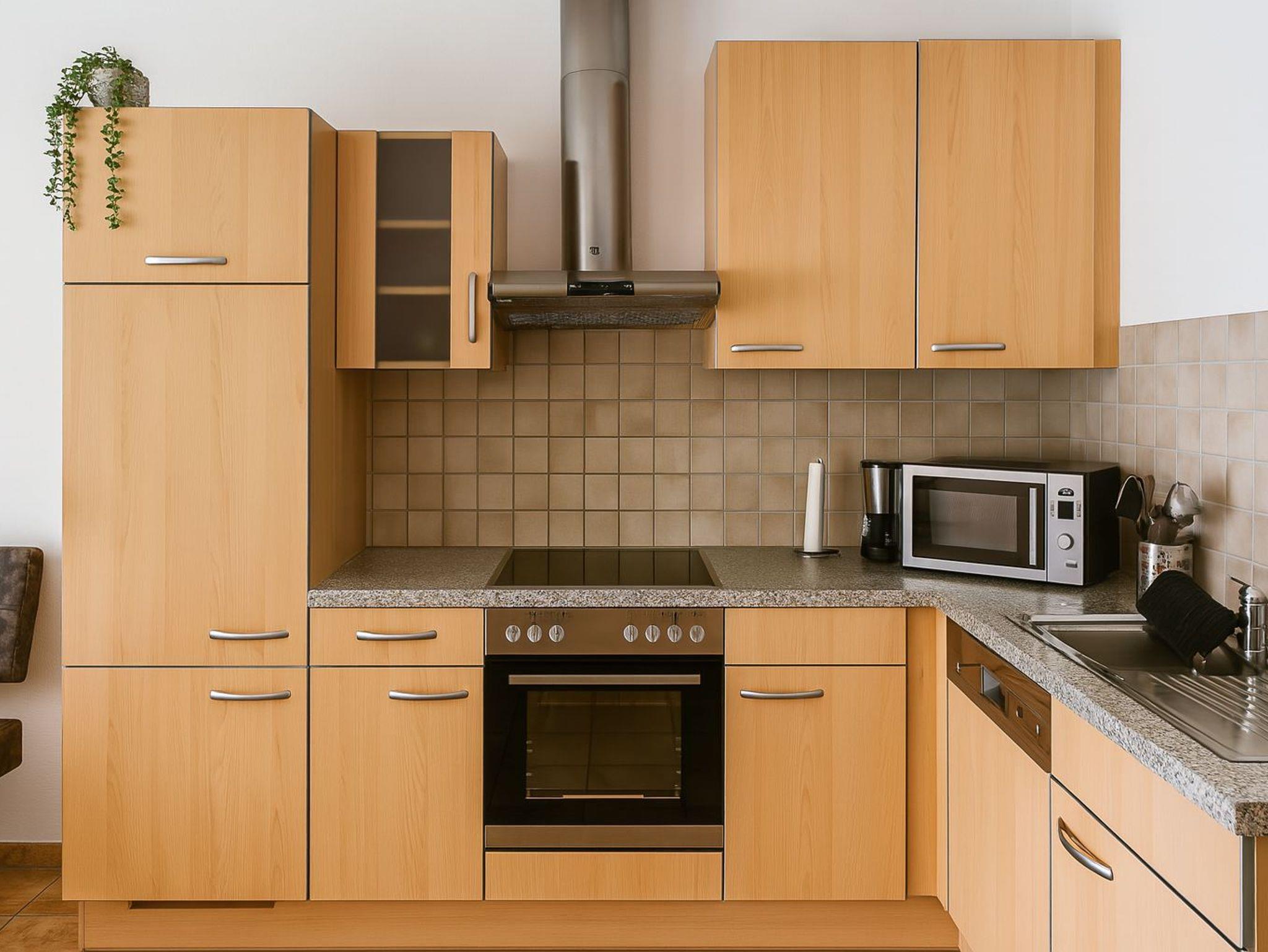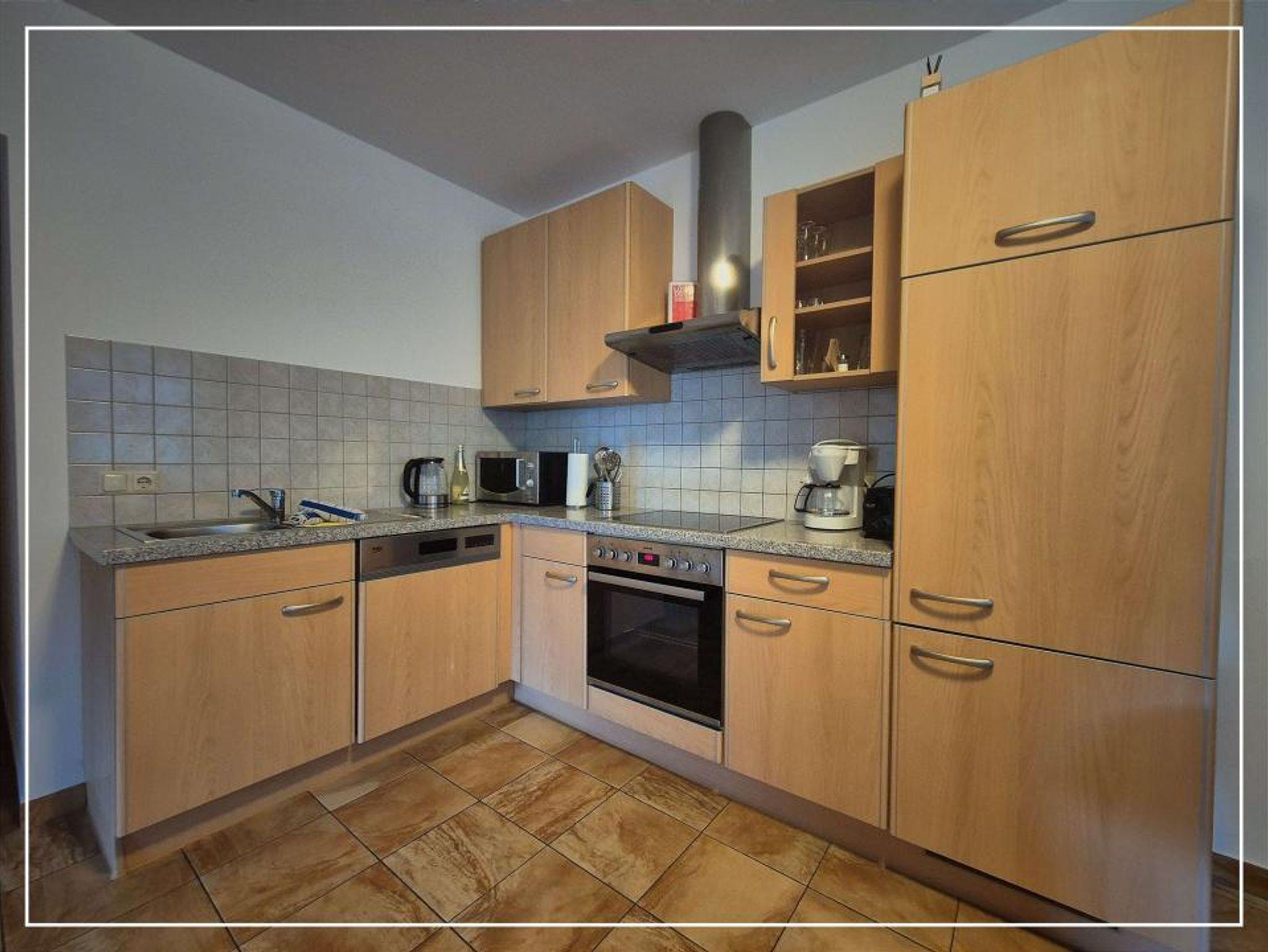 Die Küche der Ferienwohnung ist ausgestattet mit: Elektroherd mit Backofen, Geschirrspüler, Kühlschrank, Gefrierschrank, Kaffeemaschine, Wasserkocher, Toaster, Eierkocher, Mikrowelle und Stabmixer. Porzellan, Besteck, Gläser und Kochgeschirr.