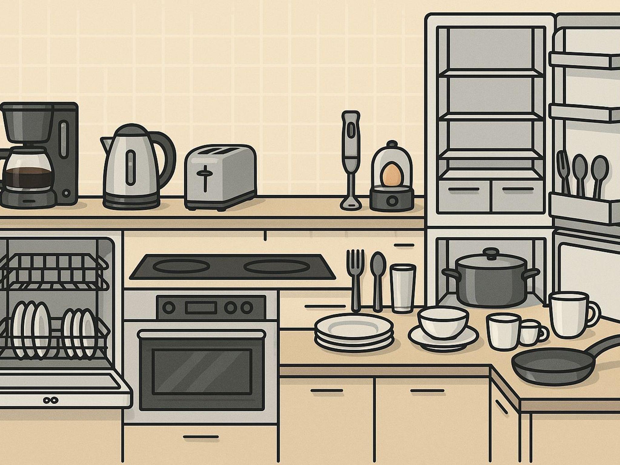 Die Küche der Ferienwohnung ist ausgestattet mit: Elektroherd mit Backofen, Geschirrspüler, Kühlschrank, Gefrierschrank, Kaffeemaschine, Wasserkocher, Toaster, Eierkocher, Mikrowelle und Stabmixer. Porzellan, Besteck, Gläser und Kochgeschirr.