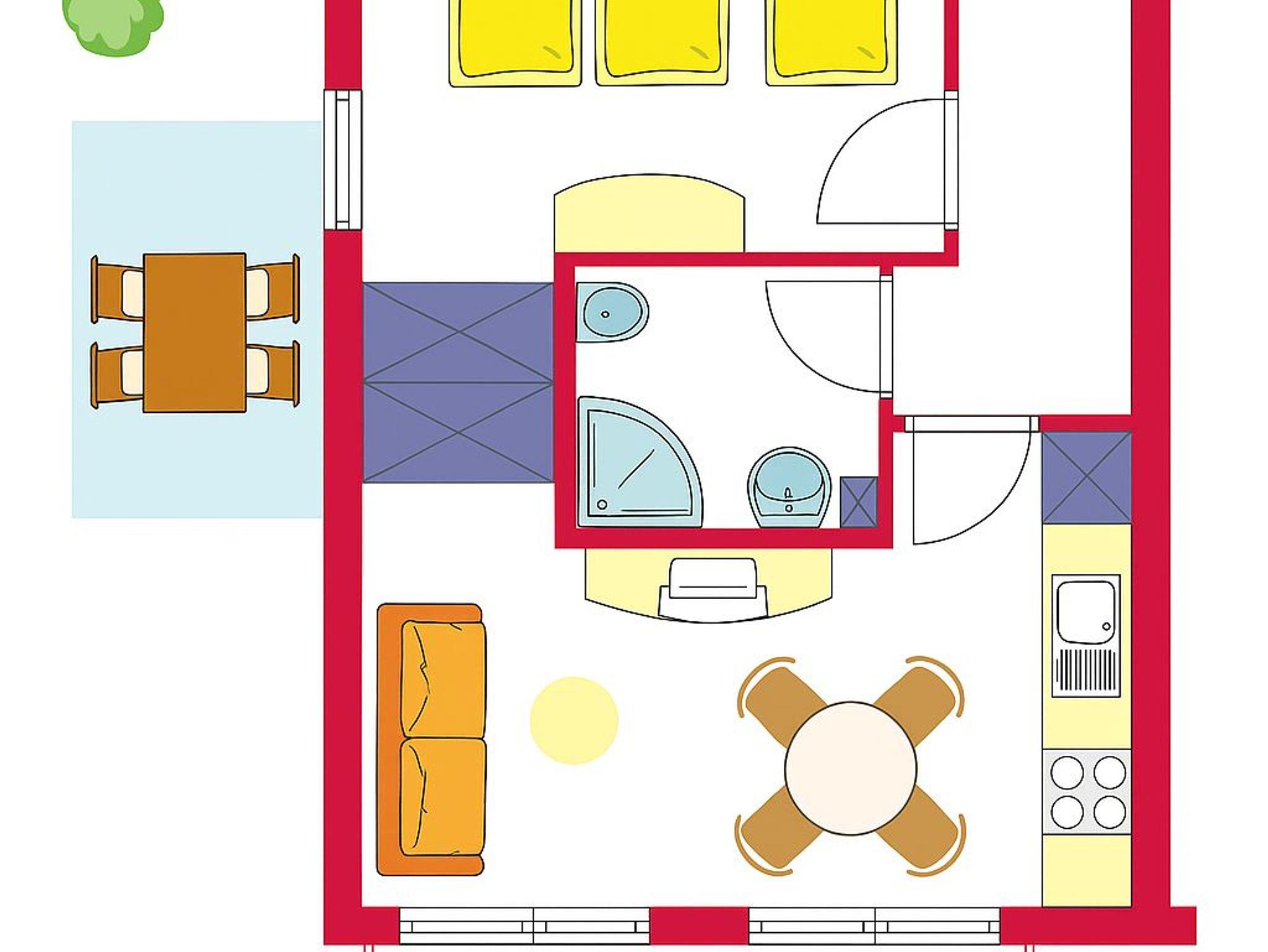 Ferienwohnung 5 ist 42 m² groß. Diese Wohnung besteht aus einem Schlafzimmer, einer Küche, einer Dusche / WC, einem Vorraum mit Garderobe, eigener Terrasse und Balkon und einer großen Liegewiese.