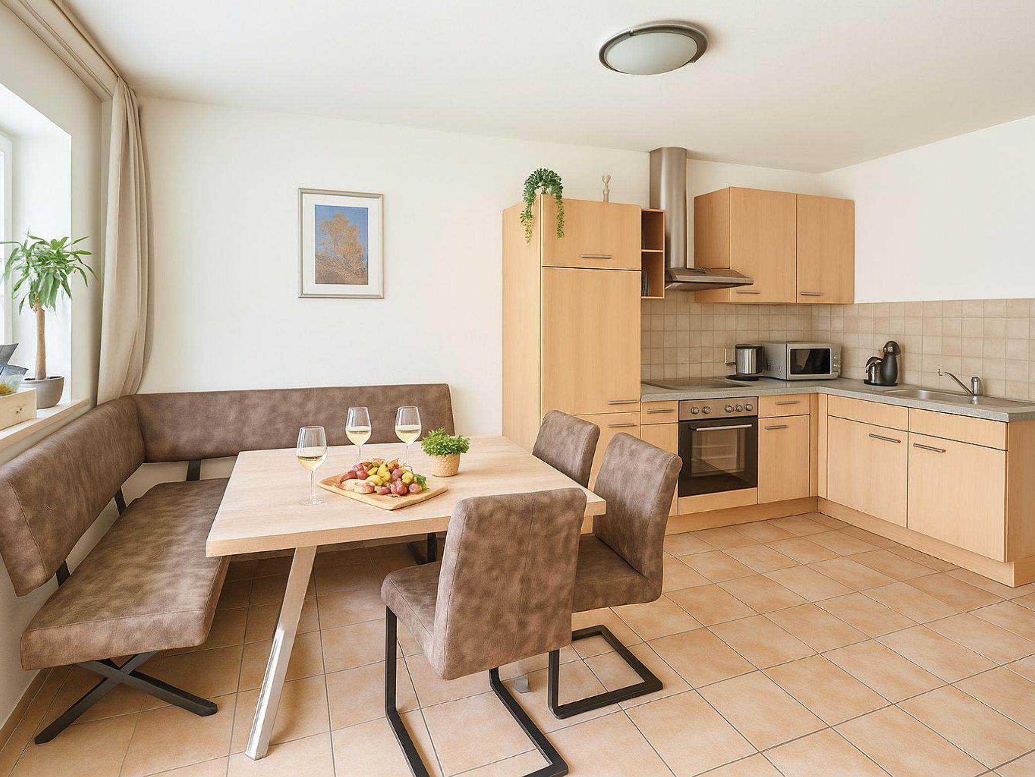 Die Küche unseres Appartements ist wie folgt ausgestattet:Elektroherd mit Backrohr, Geschirrspüler, Kühlschrank, Gefrierschrank, Kaffeemaschine, Wasserkocher, Toaster, Eierkocher, Mikrowelle und Stabmixer. Porzellan, Besteck, Gläser und Kochgeschirr.