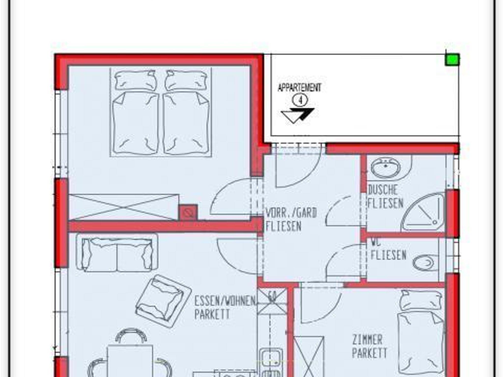 Das Appartement besteht aus einem Schlafzimmer mit Doppelbett, 1 Schlafzimmer mit 2 Einzelbetten, Wohnküche mit ausziehbarer Couch für 1 Personen, Dusche, WC separat, Terrasse.