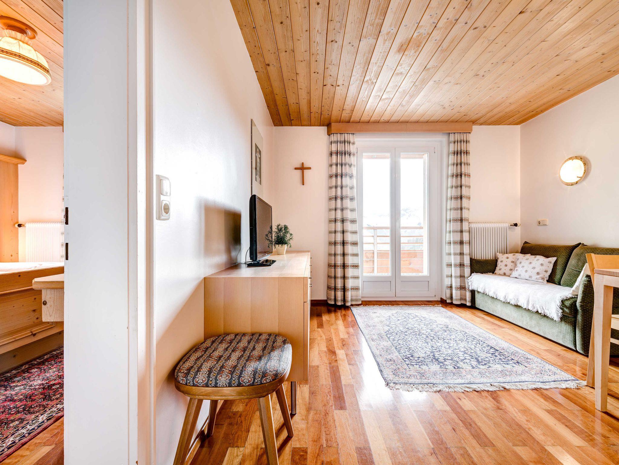 Komfortabel eingerichtetes Appartement mit vollwertiger Wohnküche, separatem Schlafzimmer für zwei Personen, mit Blick auf die umliegenden Berge. Bei Bedarf kann ein Zwei-Bettzimmer für Kinder zugemietet werden.