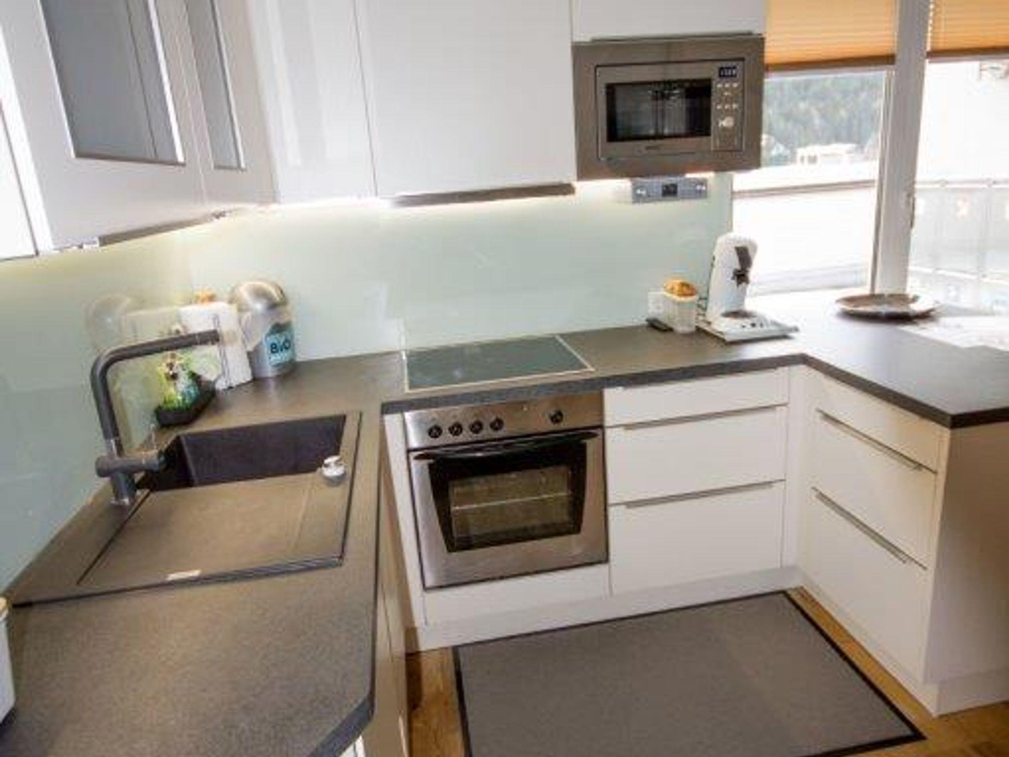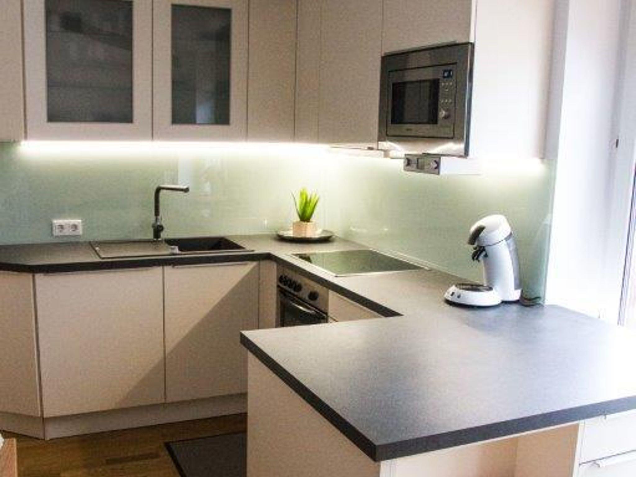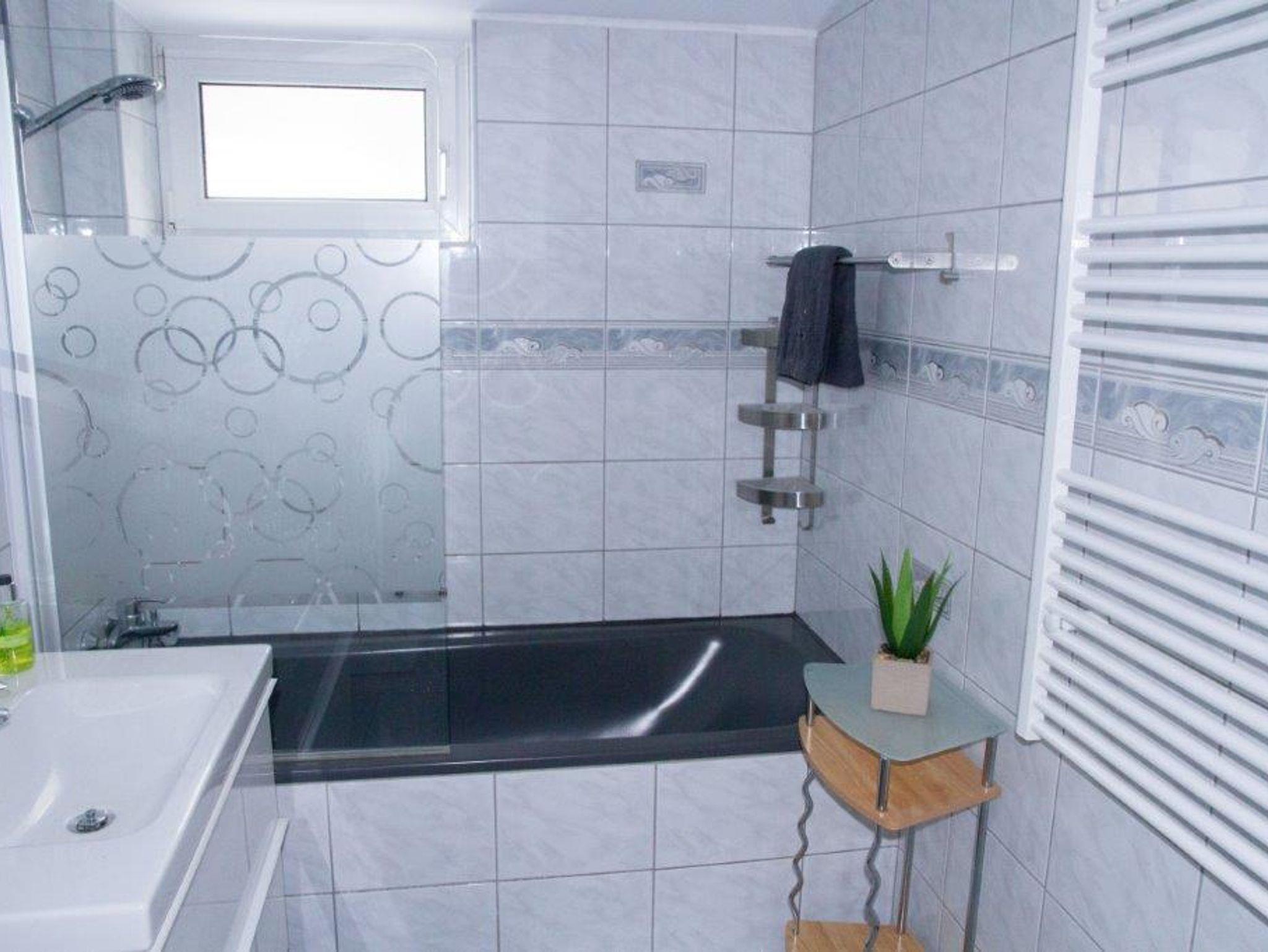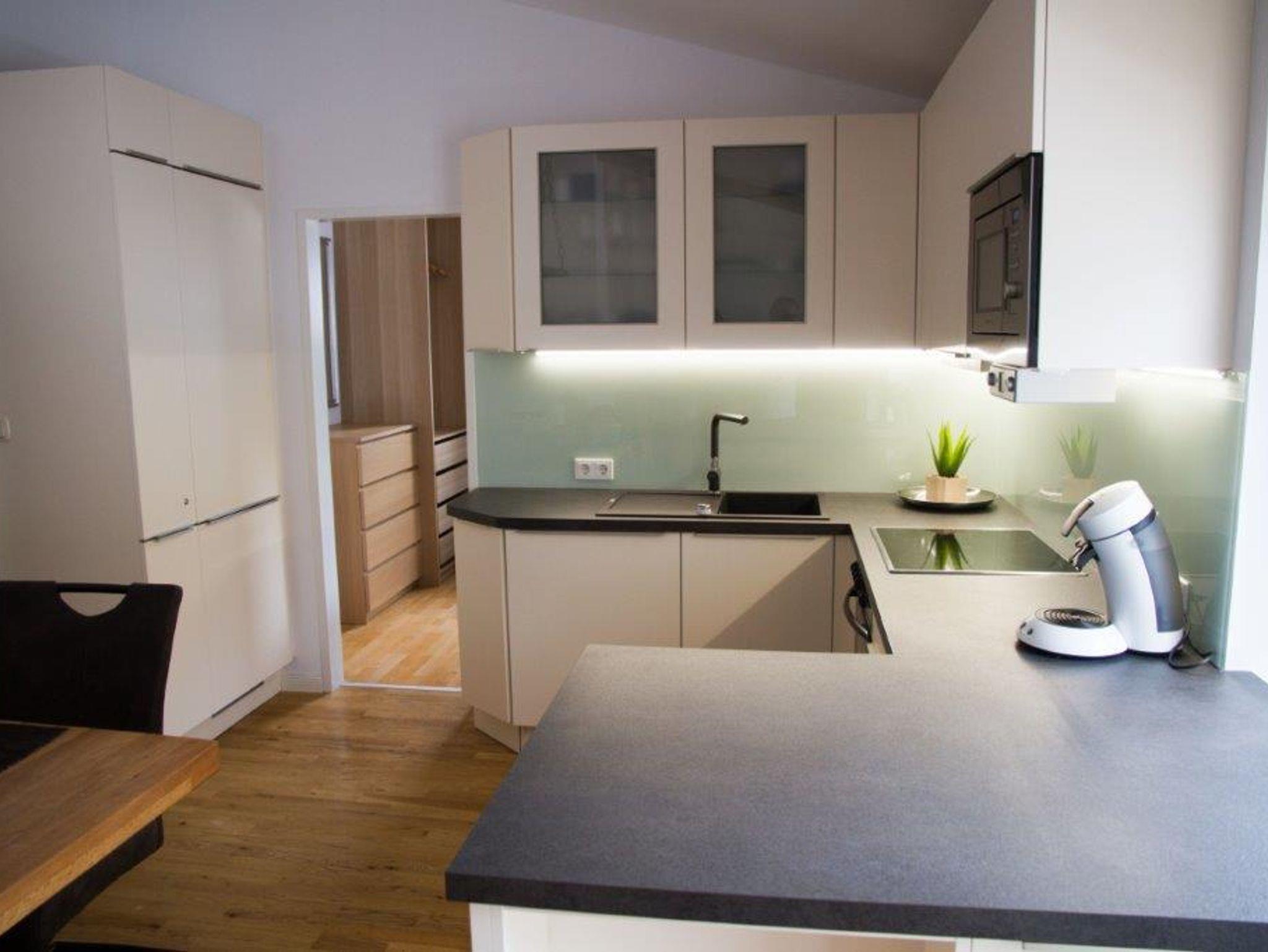 Eine komplett eingerichtete Küche ermöglicht eine problemlose Selbstversorgung. Im Bad befindet sich eine Badewanne mit integrierter Dusche sowie ein WC. Ein zweites WC ist ebenfalls vorhanden.