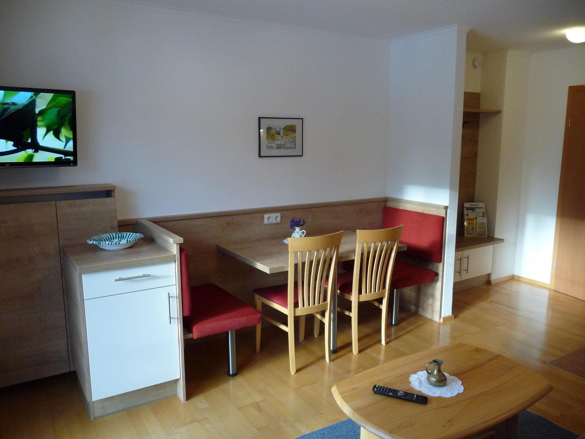 mit Flat-TV, Esstisch mit Stühlen und einer kleinen Garderobe.