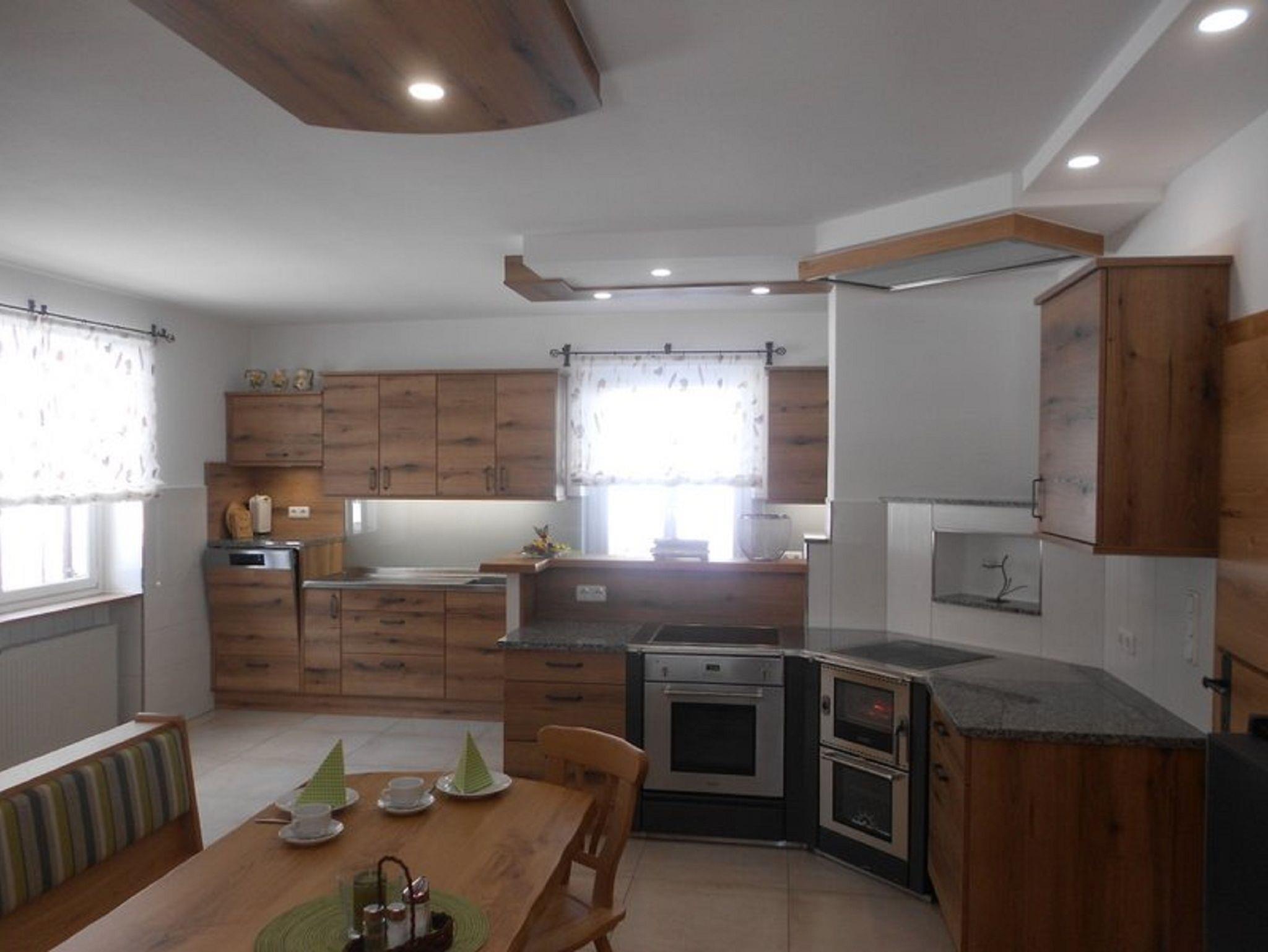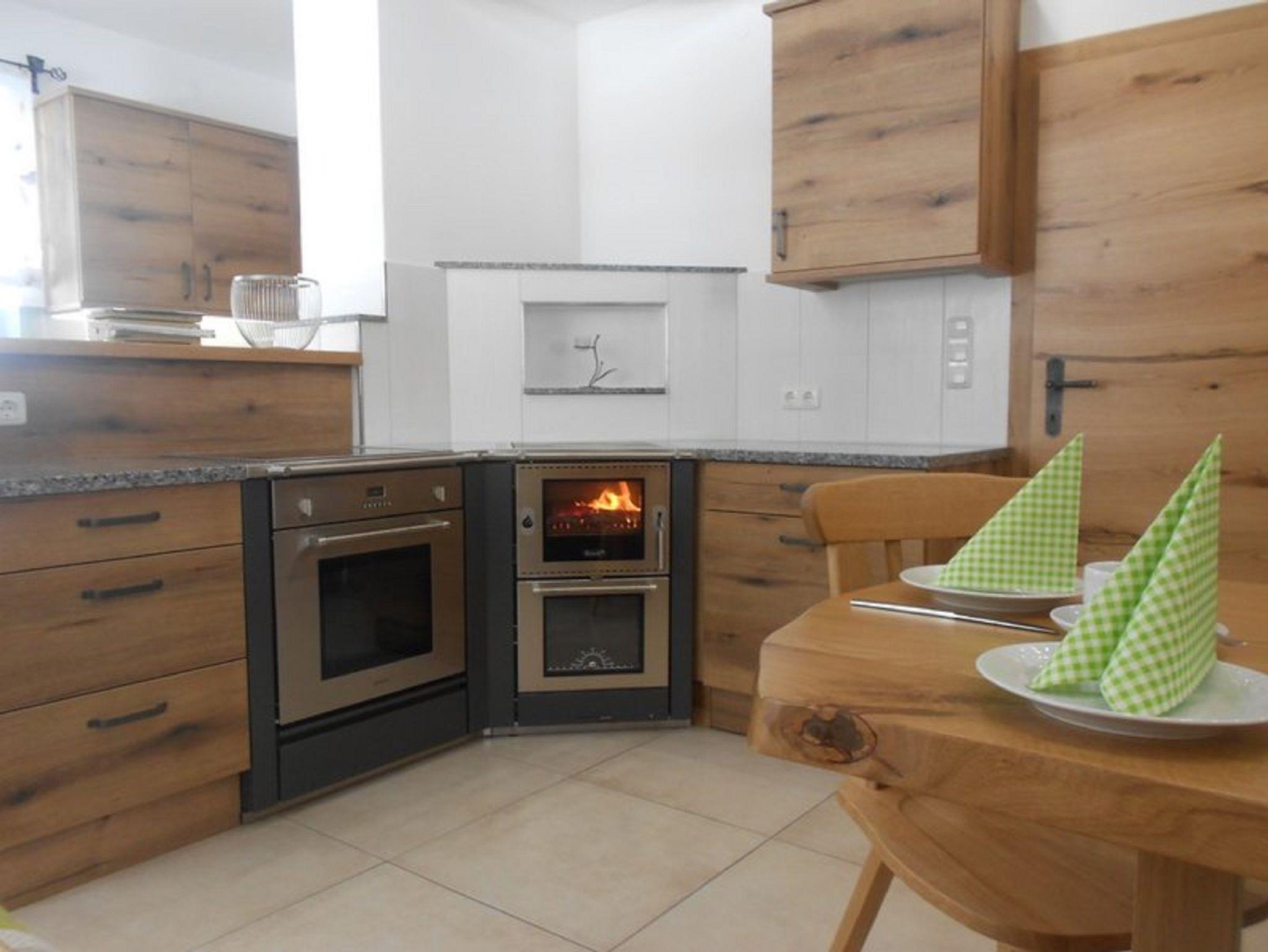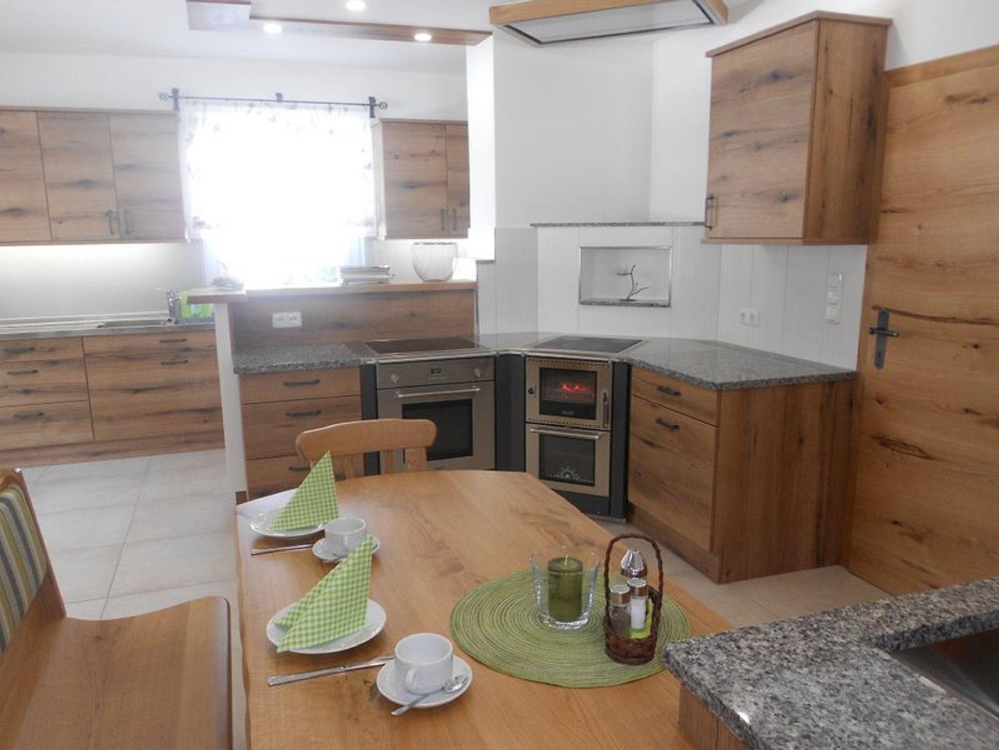 Die große Küche ist mit einem Elektro- & Holzherd, Mikrowelle, Geschirrspüler, Kühlschrank, Wasserkocher, Kaffeemaschine und ausreichend Koch- und Essgeschirr eingerichtet.