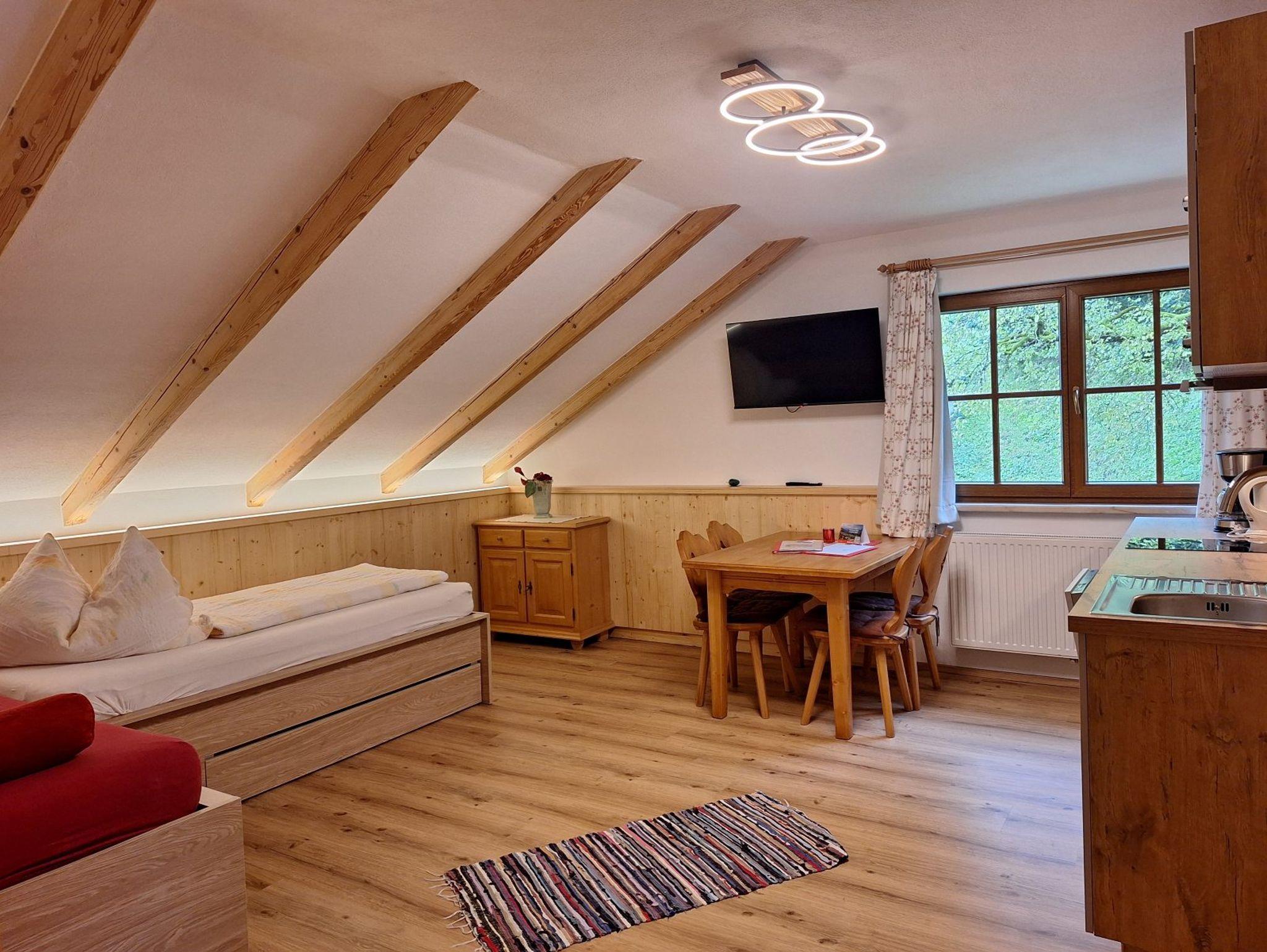 Es ist mit einer voll eingerichteten Kochzeile (Herd, Geschirrspüler, Filterkaffeemaschine, Mikrowelle, Kühlschrank, Besteck, Geschirr, Töpfe,...) Eckschlafcouch, ausziehbarem Schlafsessel, Vollholzmöbeln, Sat-TV und Sitzgelegenheit ausgestattet.