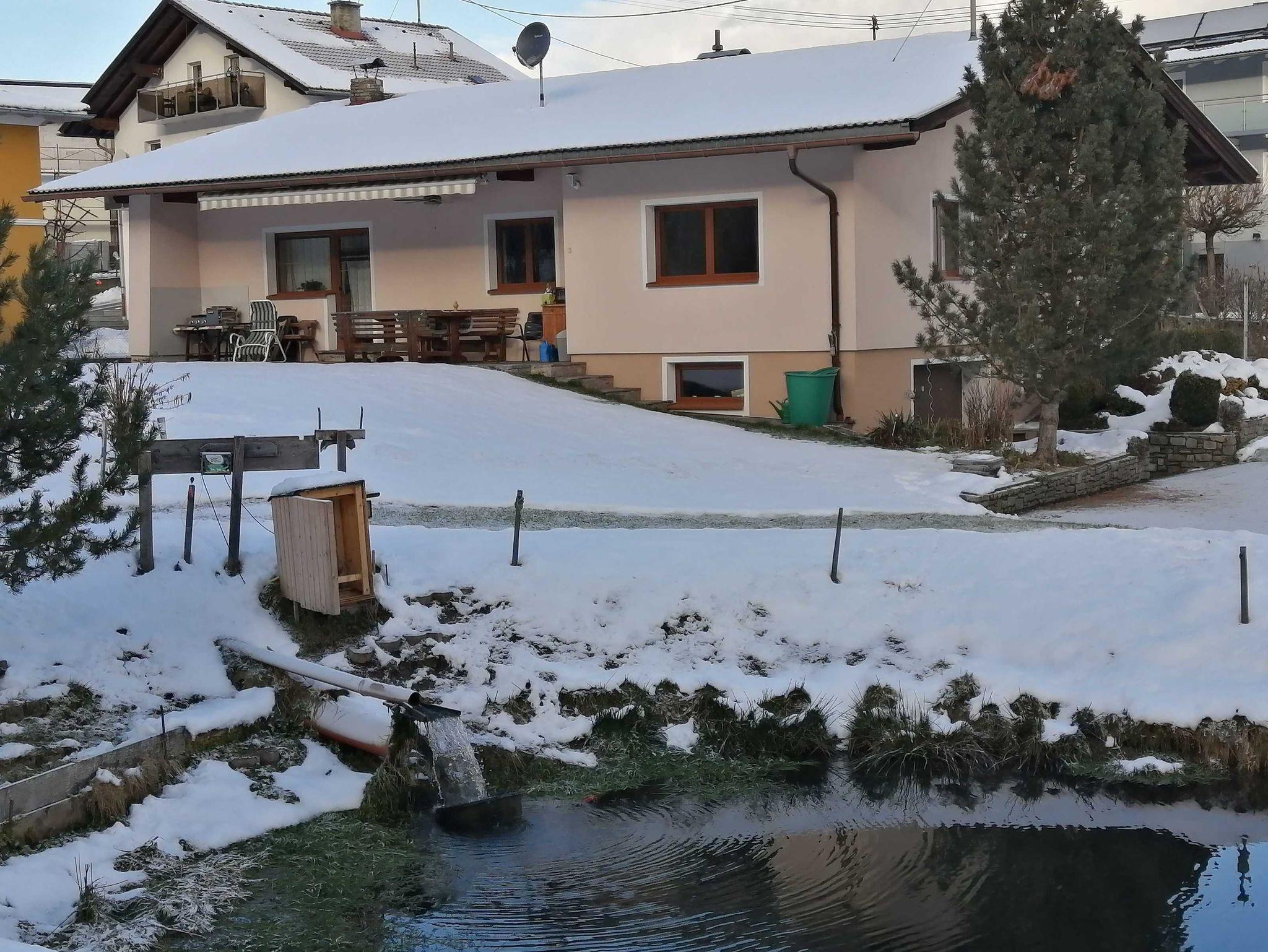 Umrahmt von Äpfelbäumen und 3 Naturteiche, wo sich Forellen und Saiblinge tummeln.