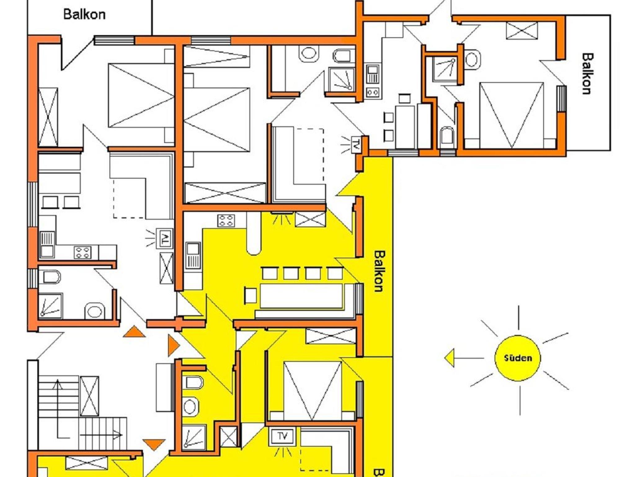 (98m2) 2 Schlafzimmer (DZ) / 2 Wohnschlafräume (je 2 Betten), Elektroherd mit 4 Platten (Ceran), Backofen, Geschirrspüler, Mikro, Kühl/Gefrierschrank, Kaffeemaschine, Toaster. Mixer, Wasserkocher, KABEL-TV, WIFI-EMPFANG, 1 Dusche / WC, 1 DU, 1 WC, 2 Wohnküchen, Süd-Balkon