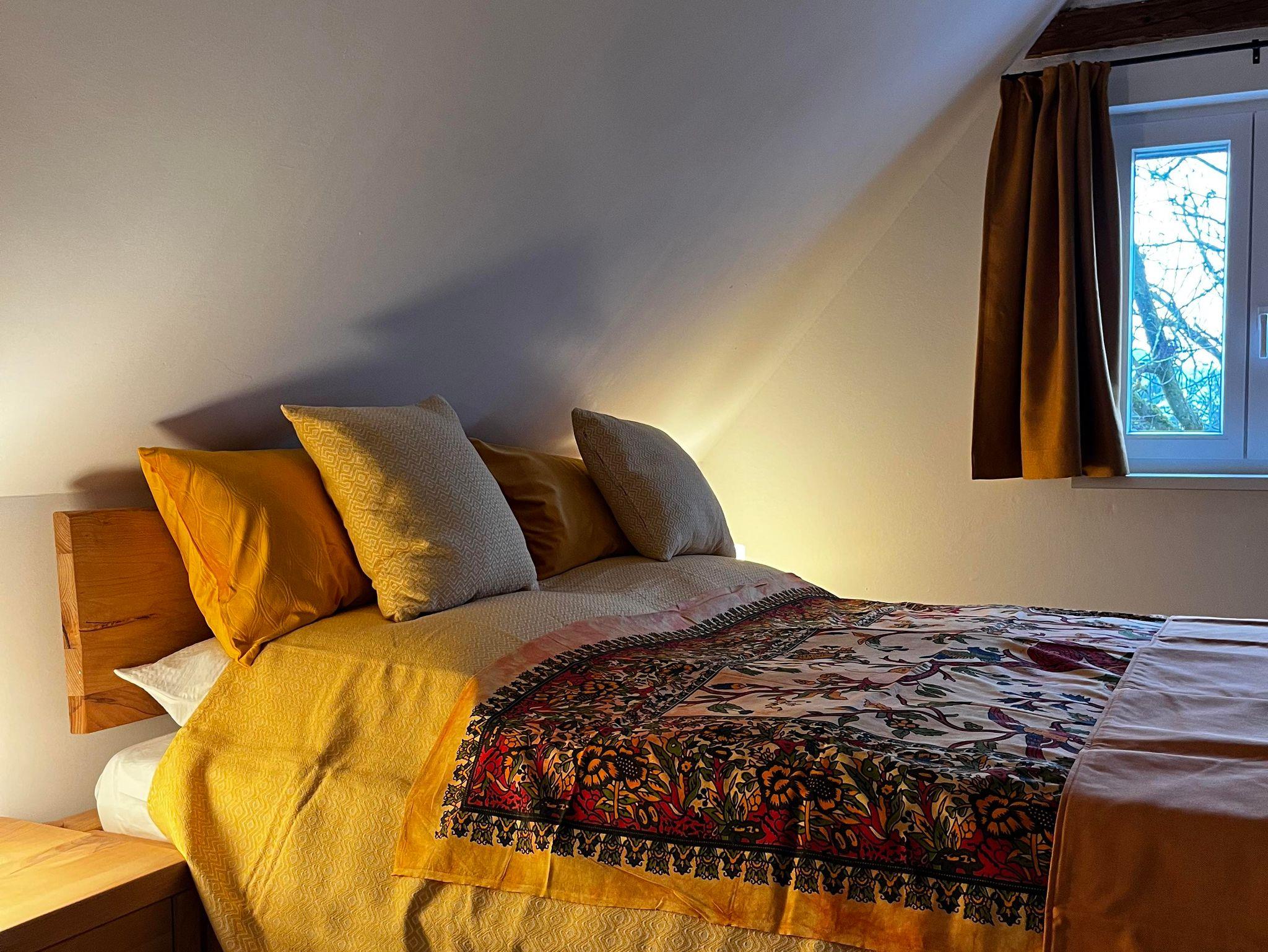Schlafzimmer im Obergeschoß mit Doppelbett mit Ausblick in die Hügellandschaft. WC im Obergeschoß ist separiert.