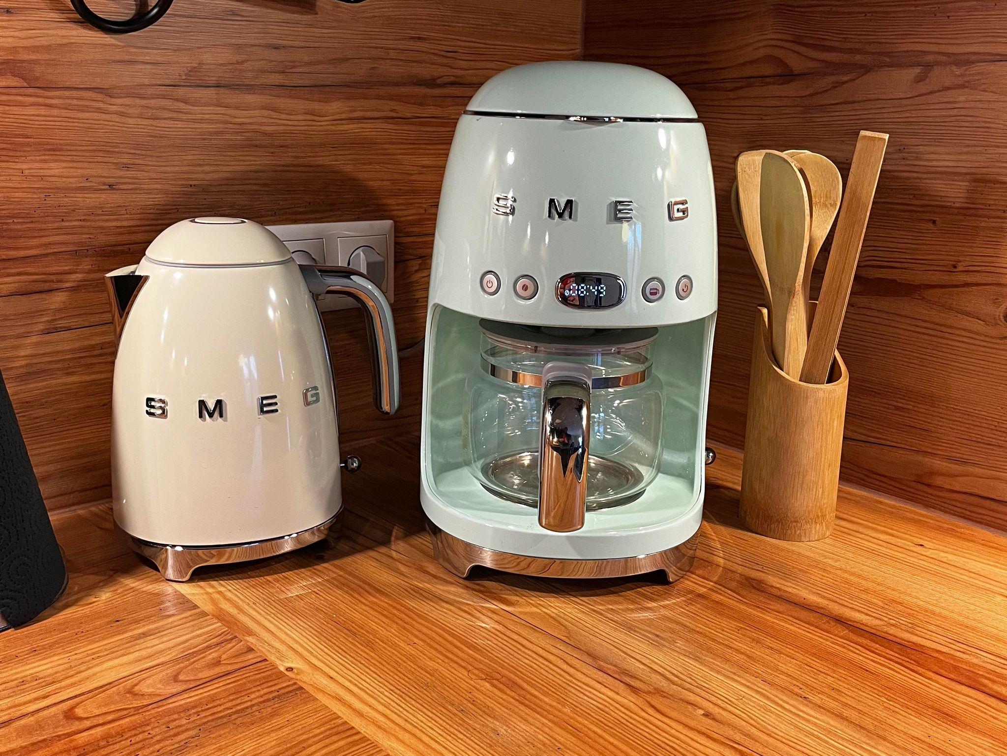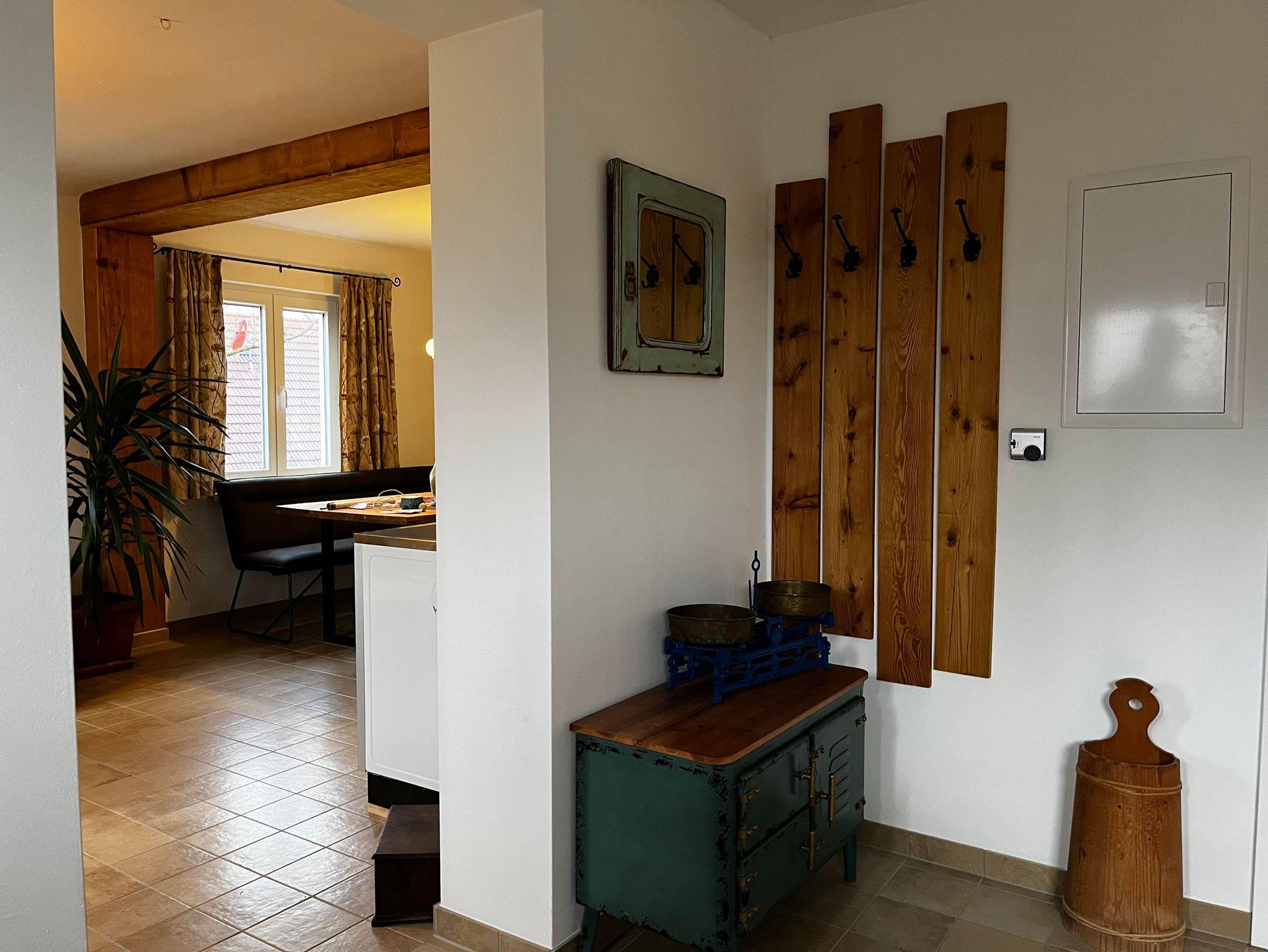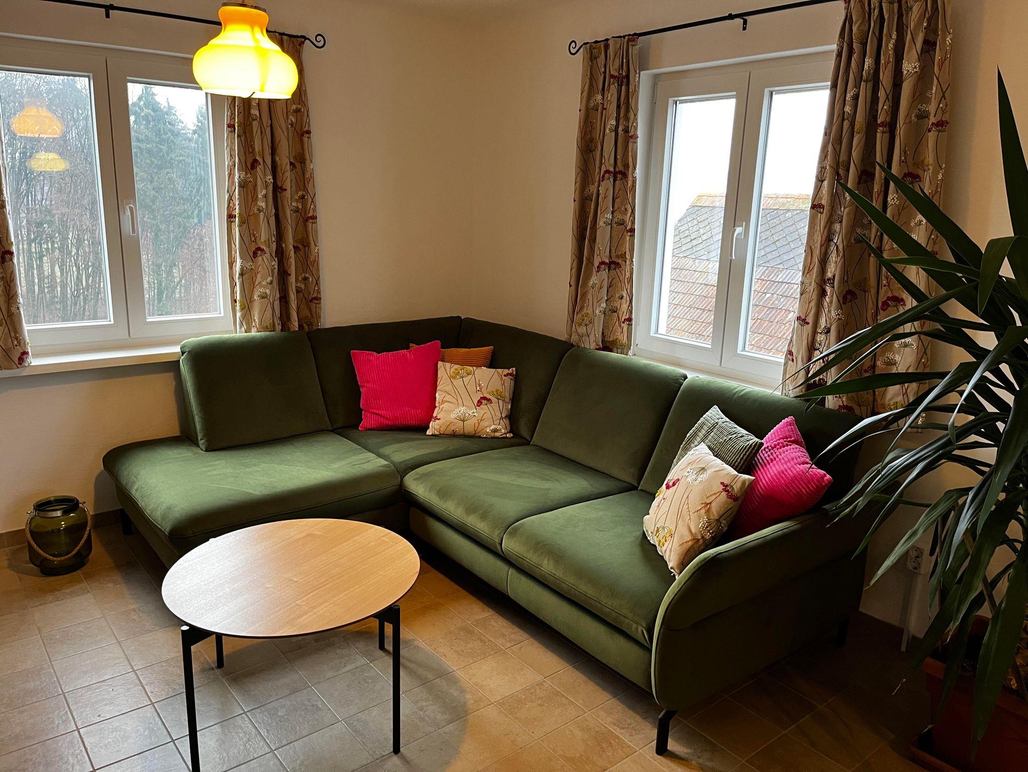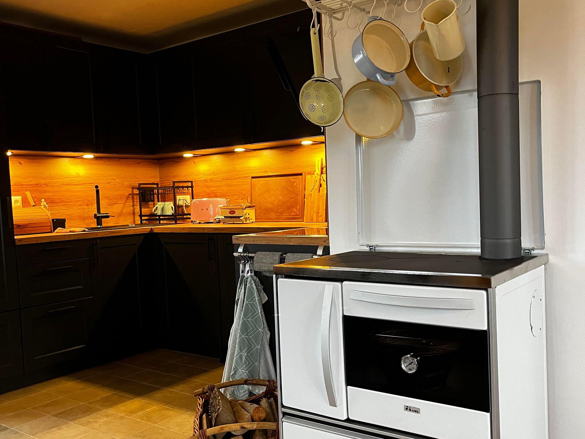 Wohnküche mit E-Herd und Backofen, Kühl- und Gefrierschrank, Waschmaschine, Geschirrspüler, Kaffeemaschine, Toaster, Wasserkocher und Holzofen vollständig eingerichtet sodaß außer Lebensmitteln nichts mitzunehmen ist. Eine gemütliche vollständig ausziehbare Couch Liegefläche 2m x 2,2m (für die Nacht von zusätzlichen 2 Personen) mit TV und WiFi ergänzen die gemütlichen Abende.