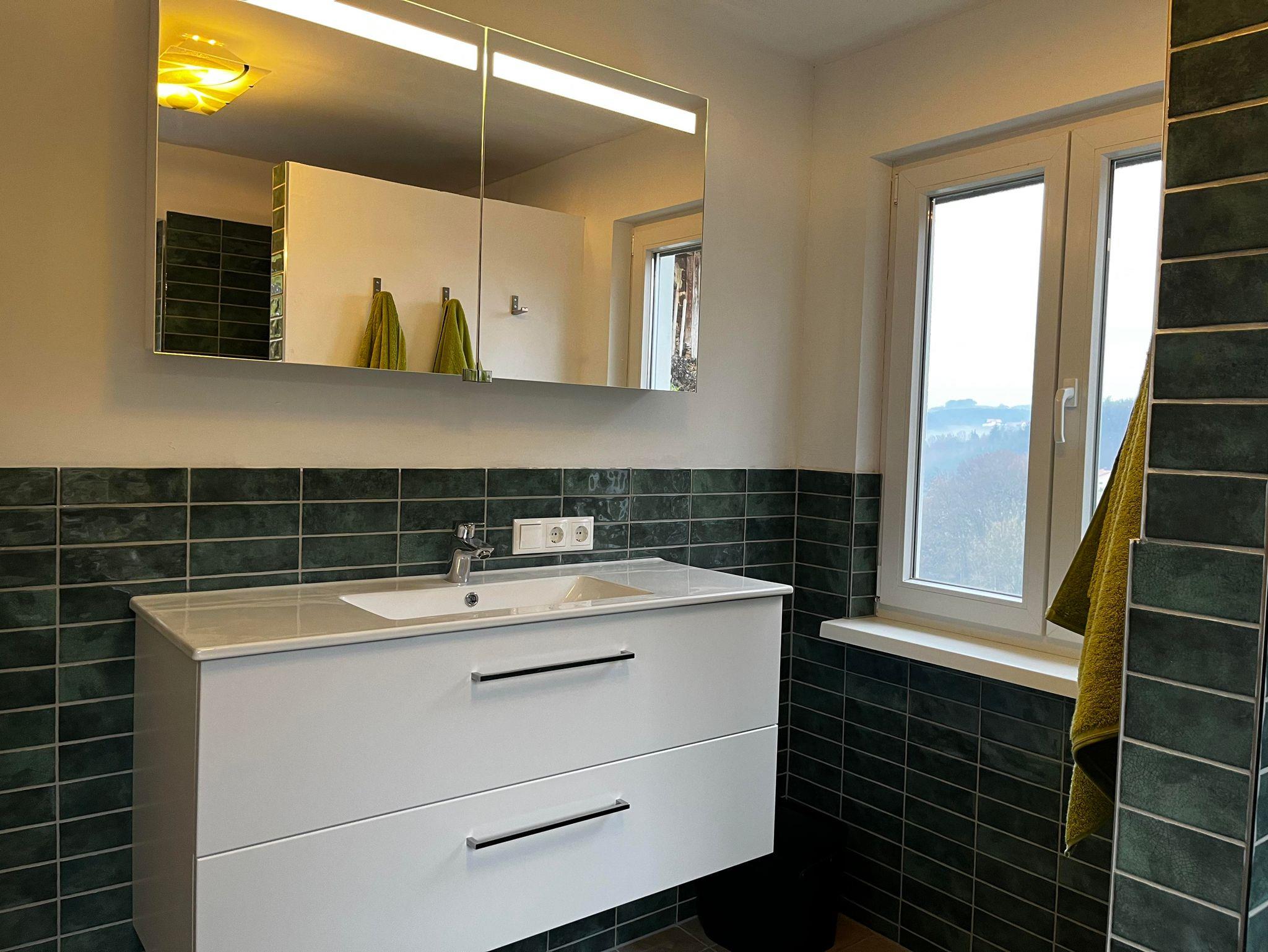 Bad mit barrierefreier Dusche, Waschtisch und Spiegel, WC und Handtuchheizkörper.